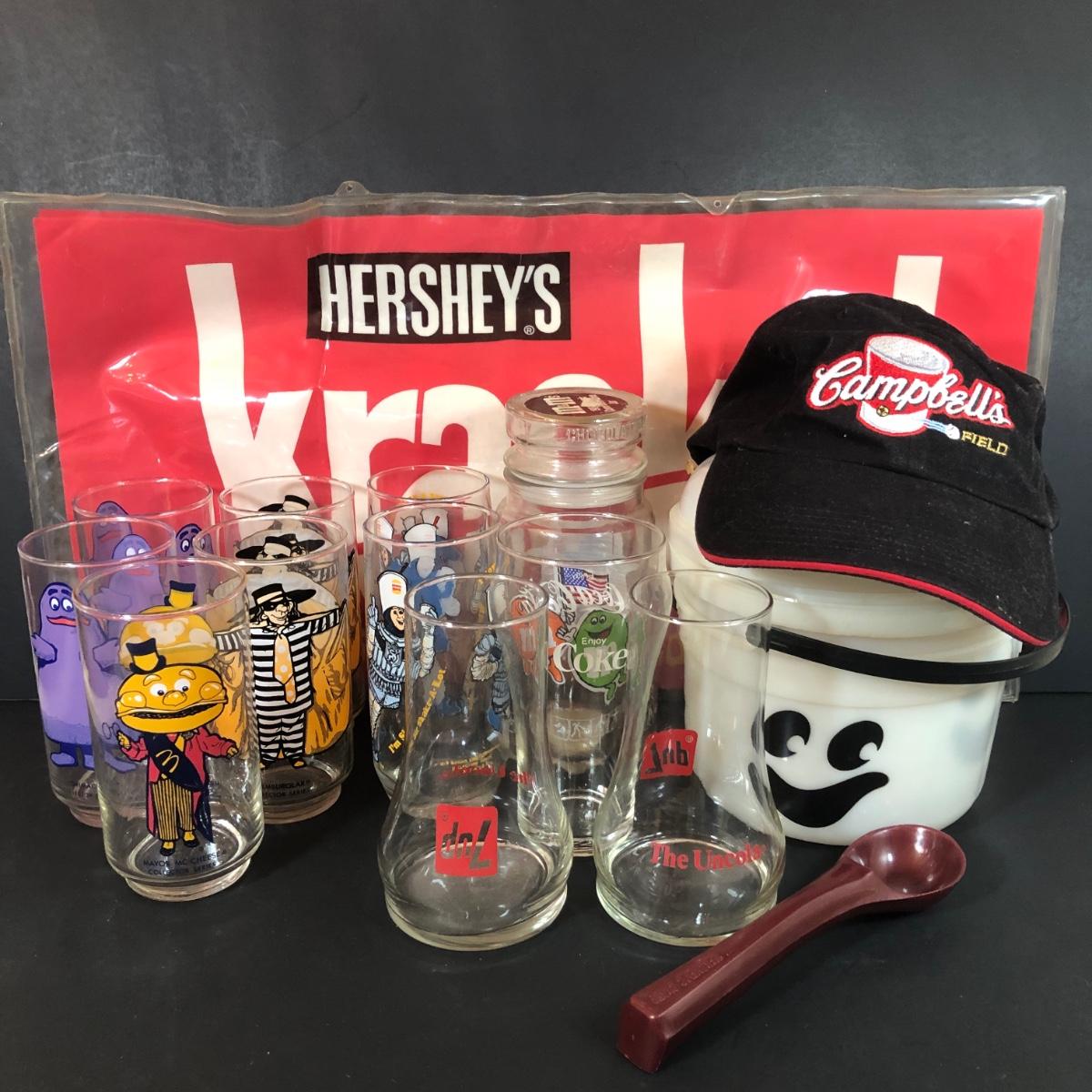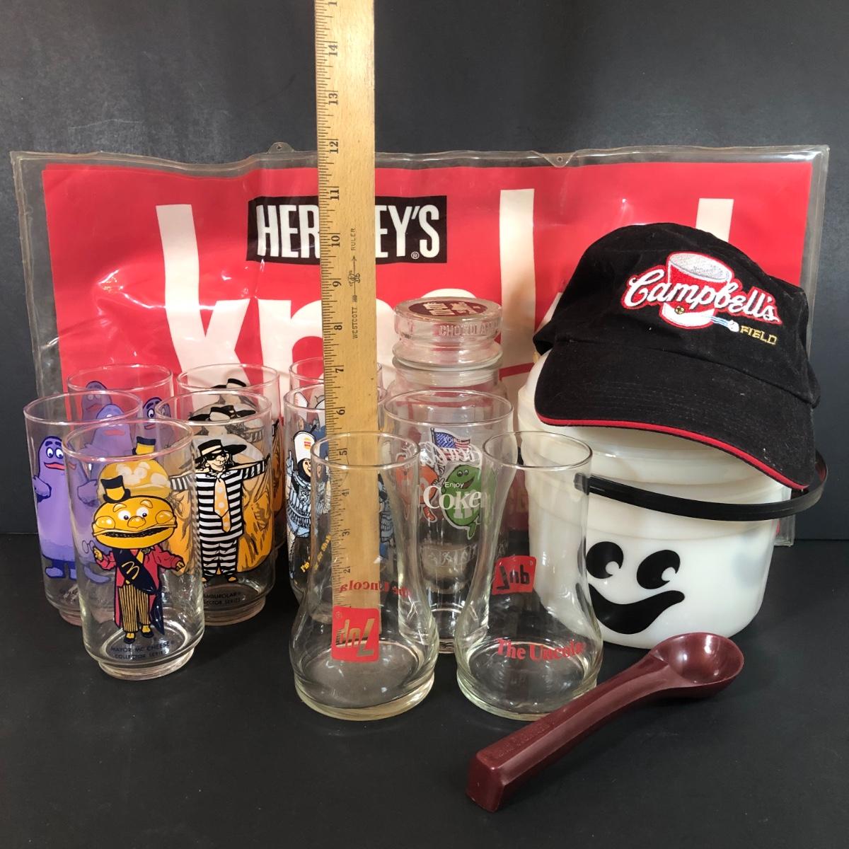 LOT 209D: Vintage McDonald's Collector Series Glasses, 1980 Olympics M&M's Glass Jar, 7-Up Uncola Glasses & More