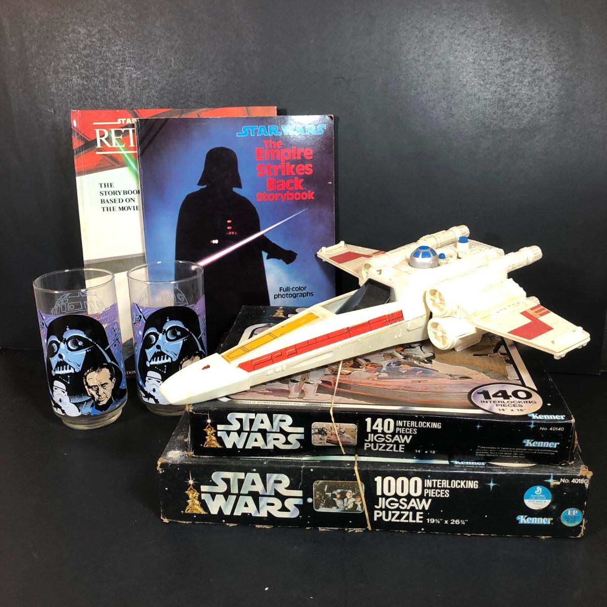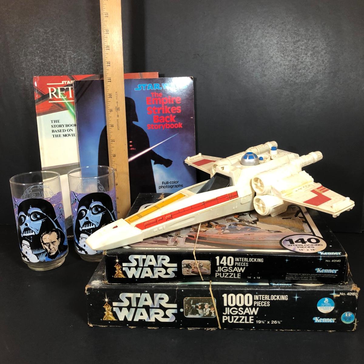 LOT 220D: Vintage Star Wars - 1978 Kenner X-Wing, Kenner Photo Puzzles, Photo Story Books & 1977 Coca-Cola Darth Vader Glasses