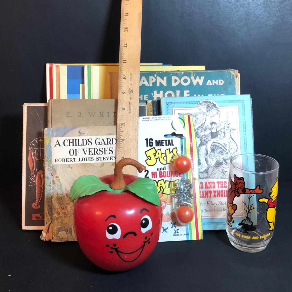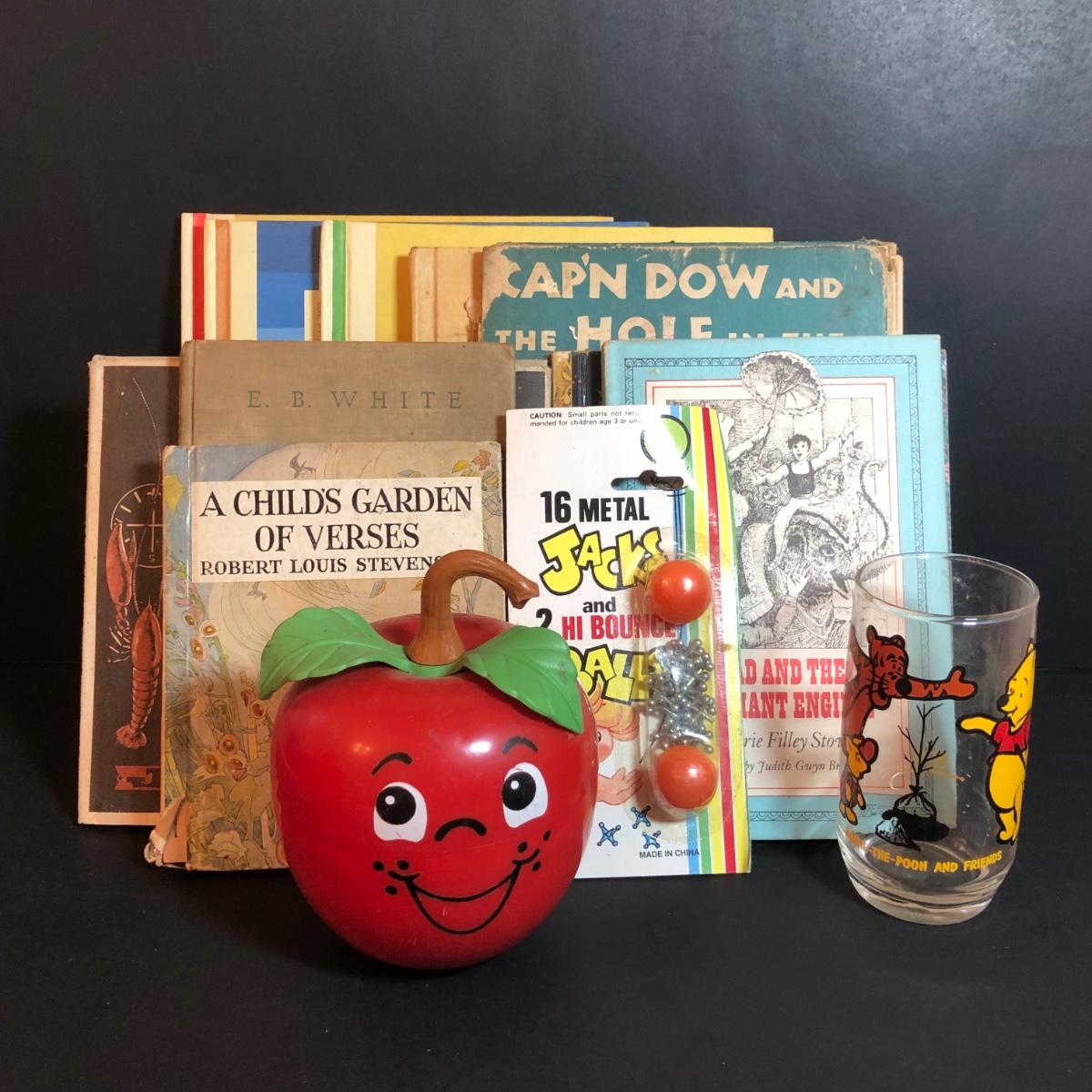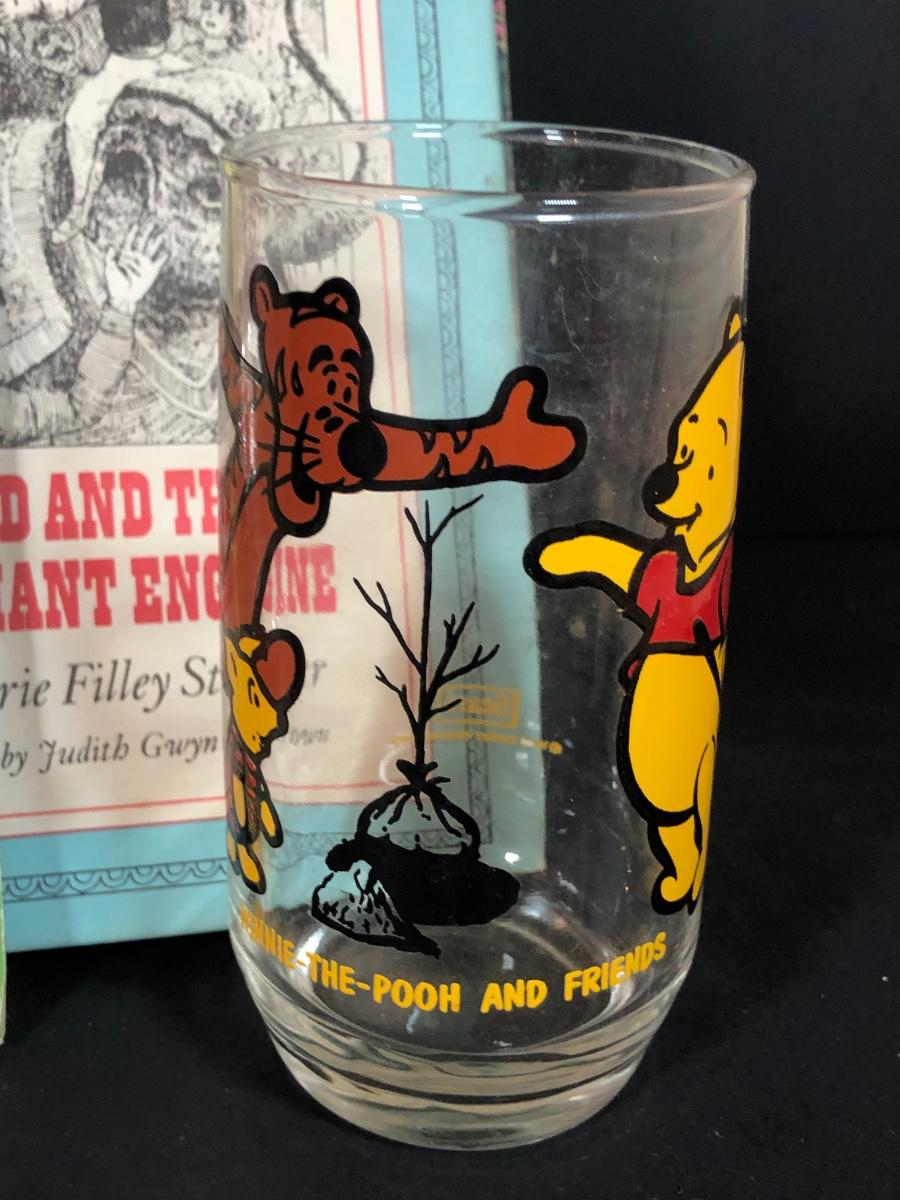 LOT 221D: Vintage Children's Books, Fisher Price Happy Apple Toy & Sears Winnie the Pooh Glass