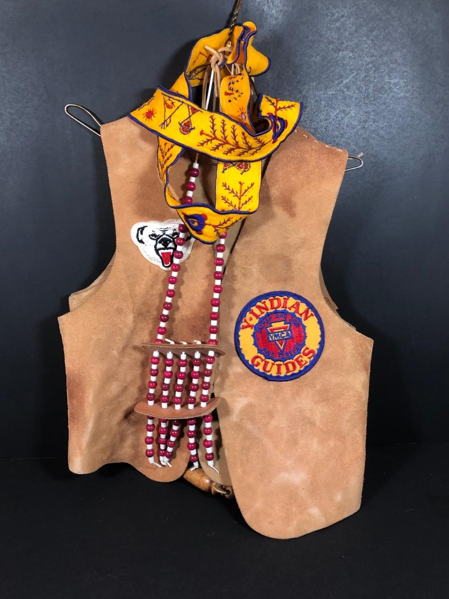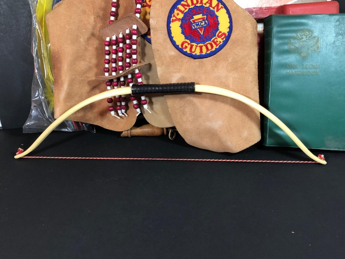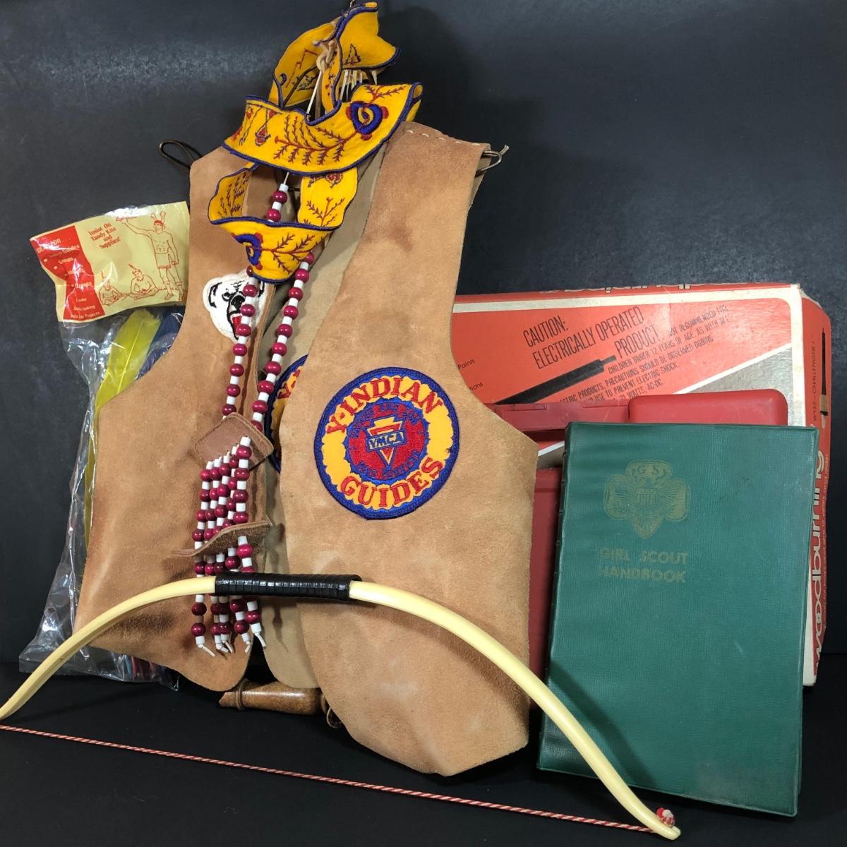 LOT 228K: YMCA "Indian Guides" Children's Vests, Woodburning Kits, Vintage Girl Scout Book & More