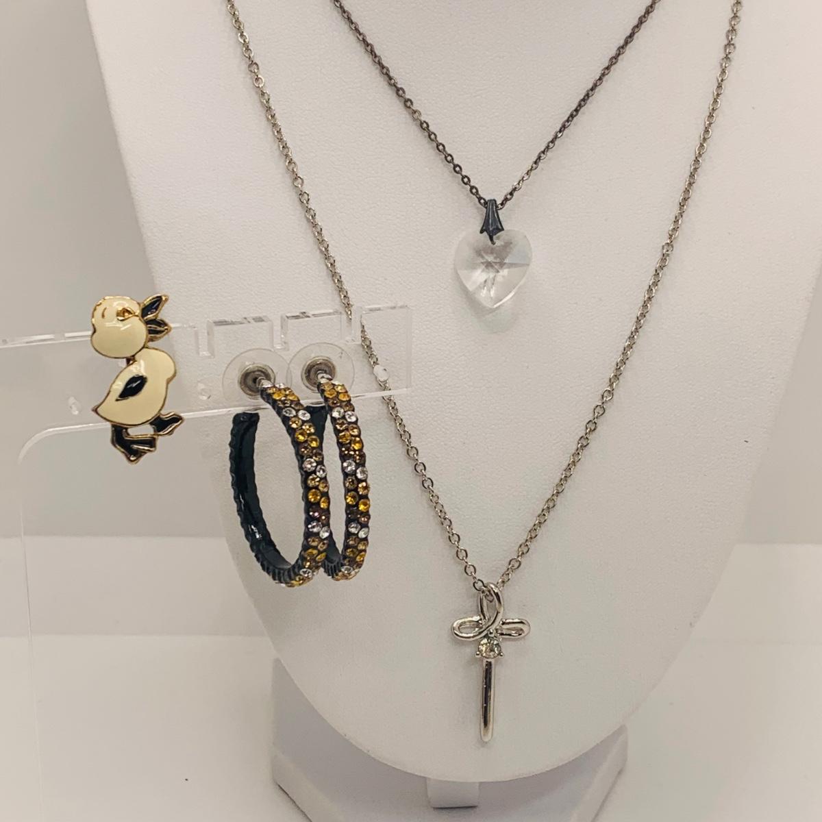 LOT 287R: Joan Rivers Hoop Earrings, Crystal Heart Necklace, Silver Tone Cross Necklace & Enamel Duck Pin