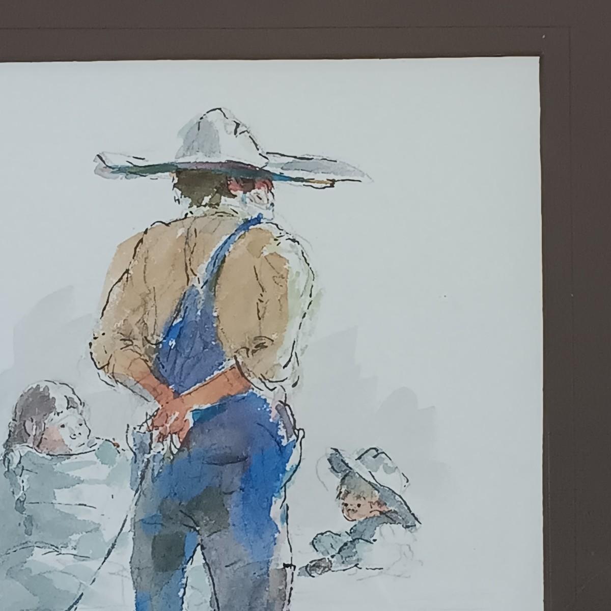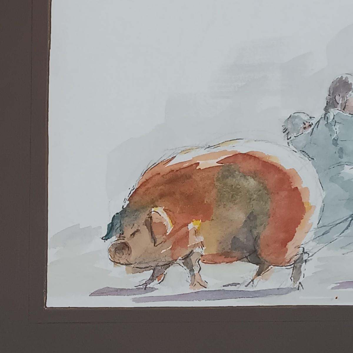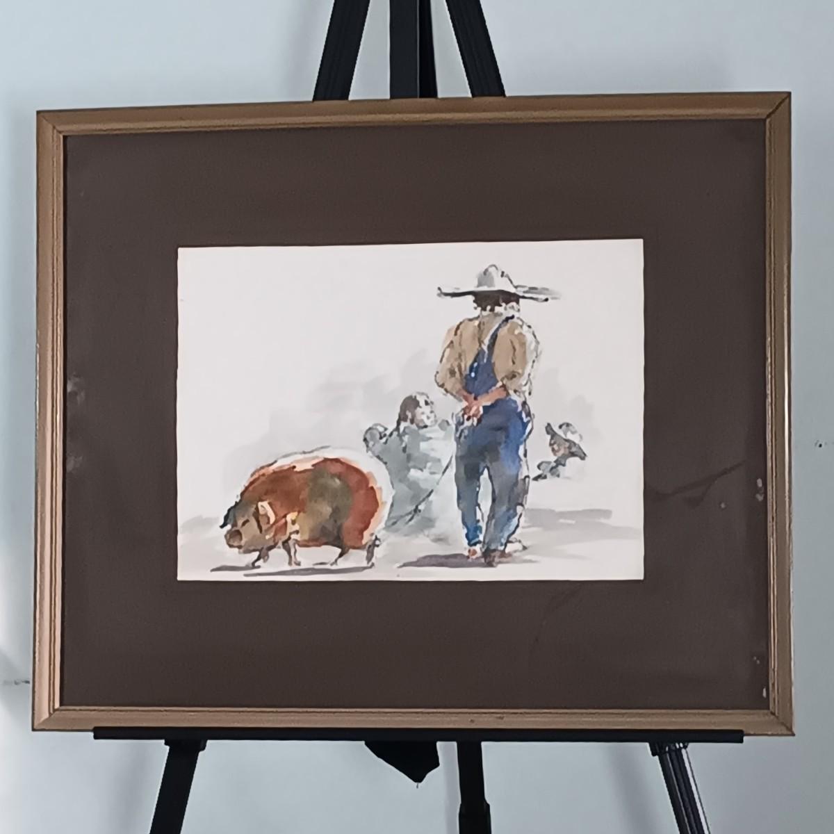 LOT 50MB: Framed Watercolor, Farmhouse Design, Pig and People Subject Matter