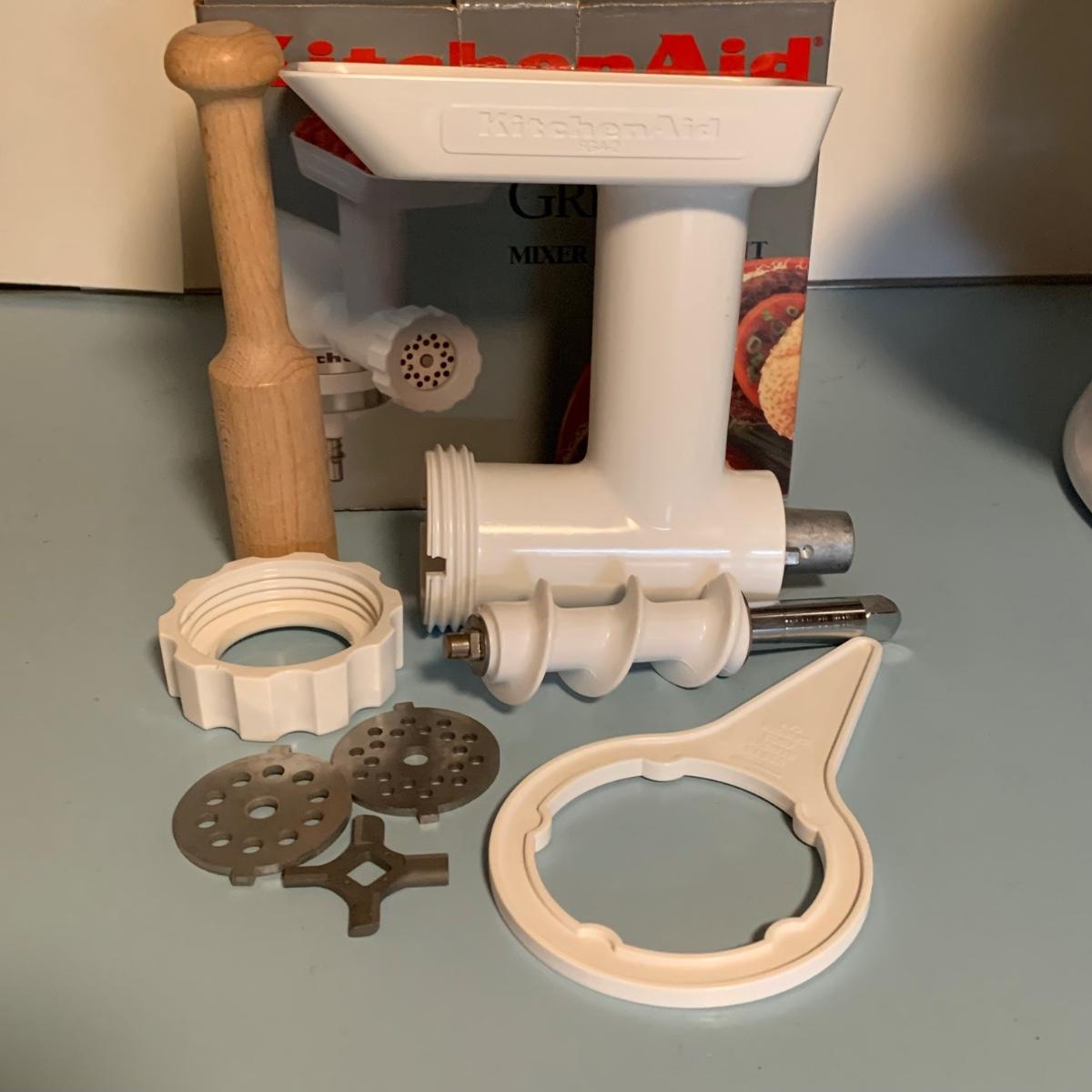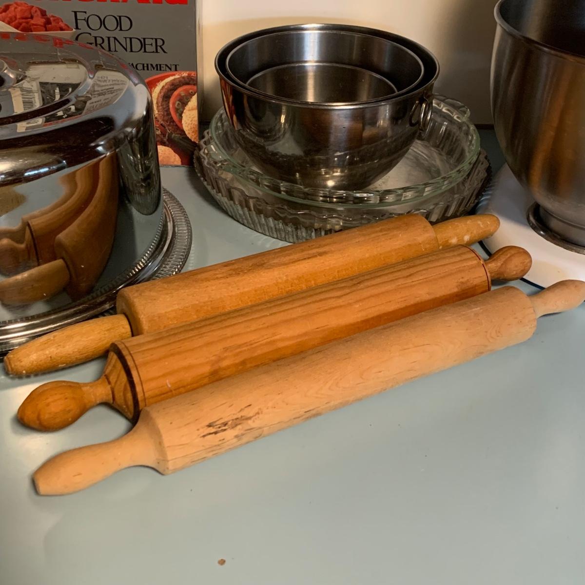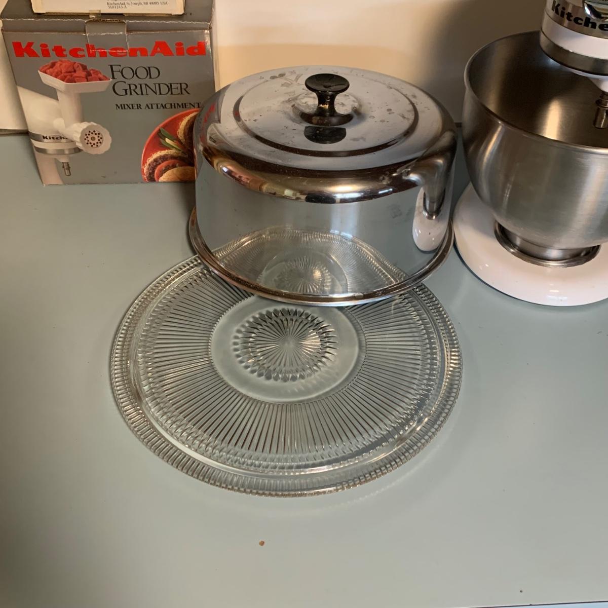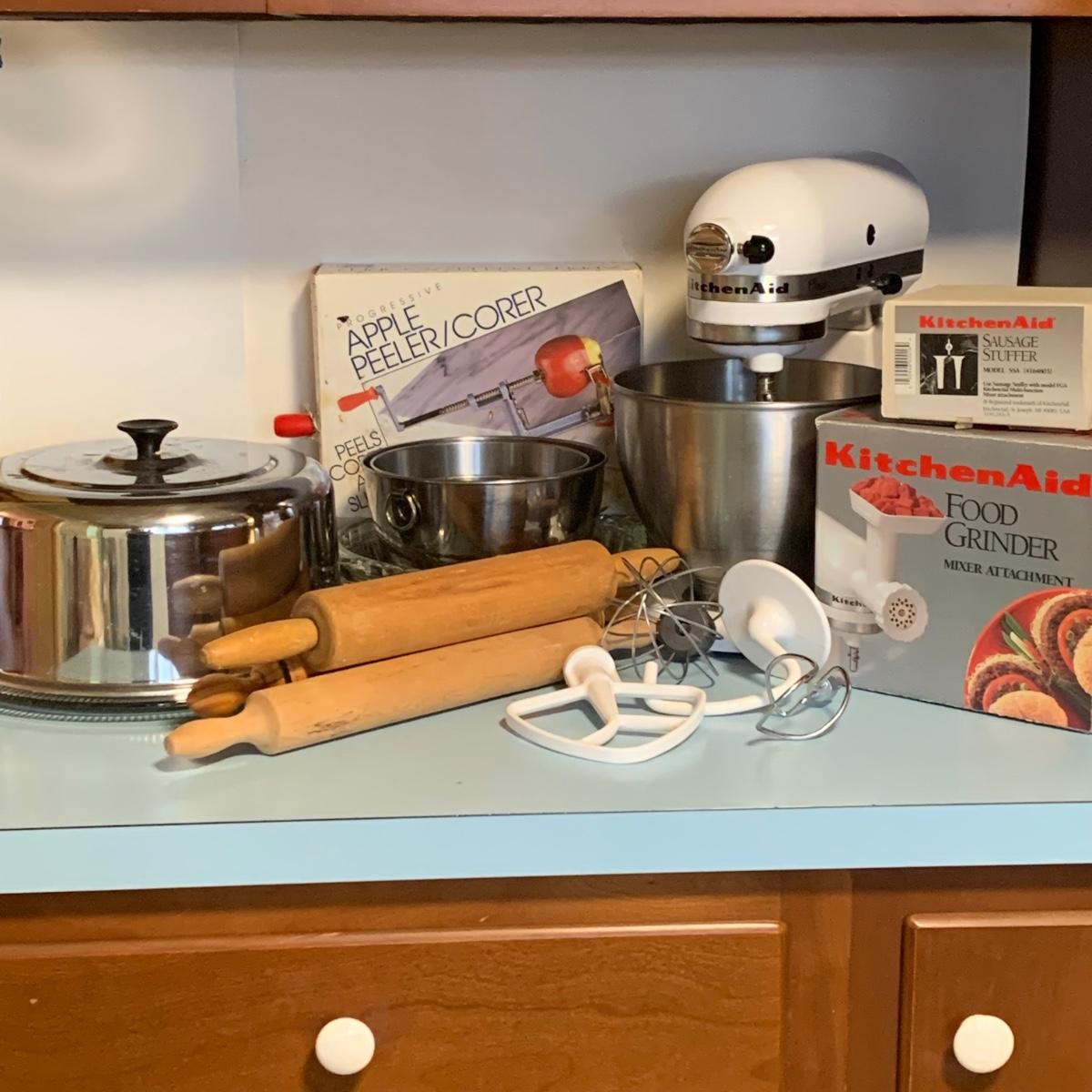 LOT 57K: Kitchen Aid Mixer w/Beaters, Food Grinder & Sausage Stuffer, Apple Peeler/Corer, Rolling Pins, Metal Bowls and a Vintage Covered Cake Plate