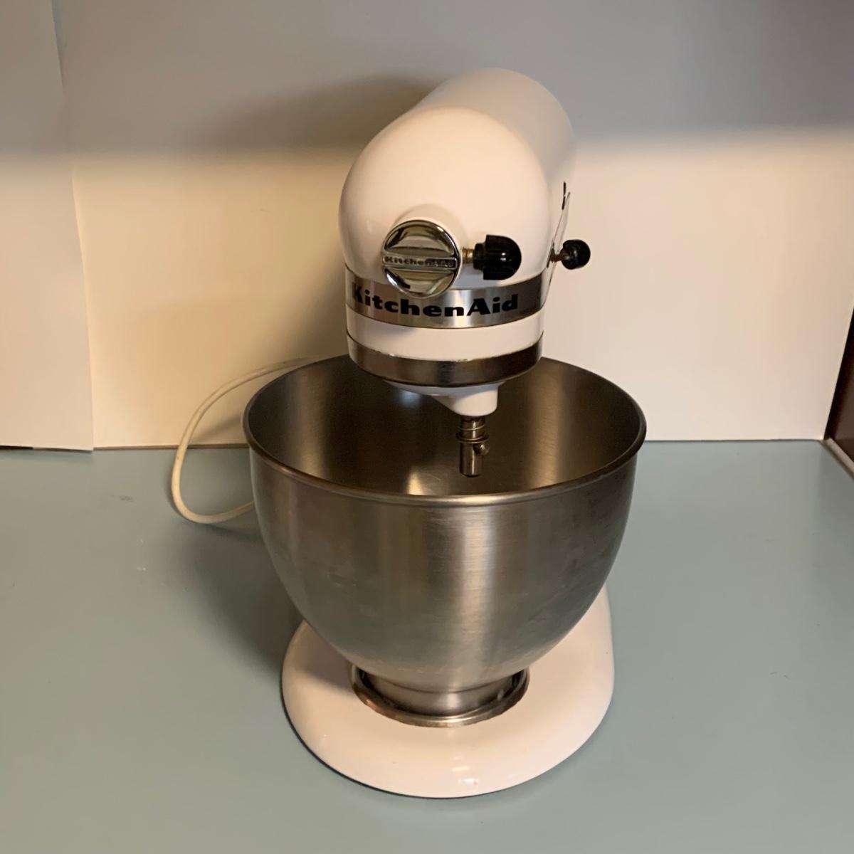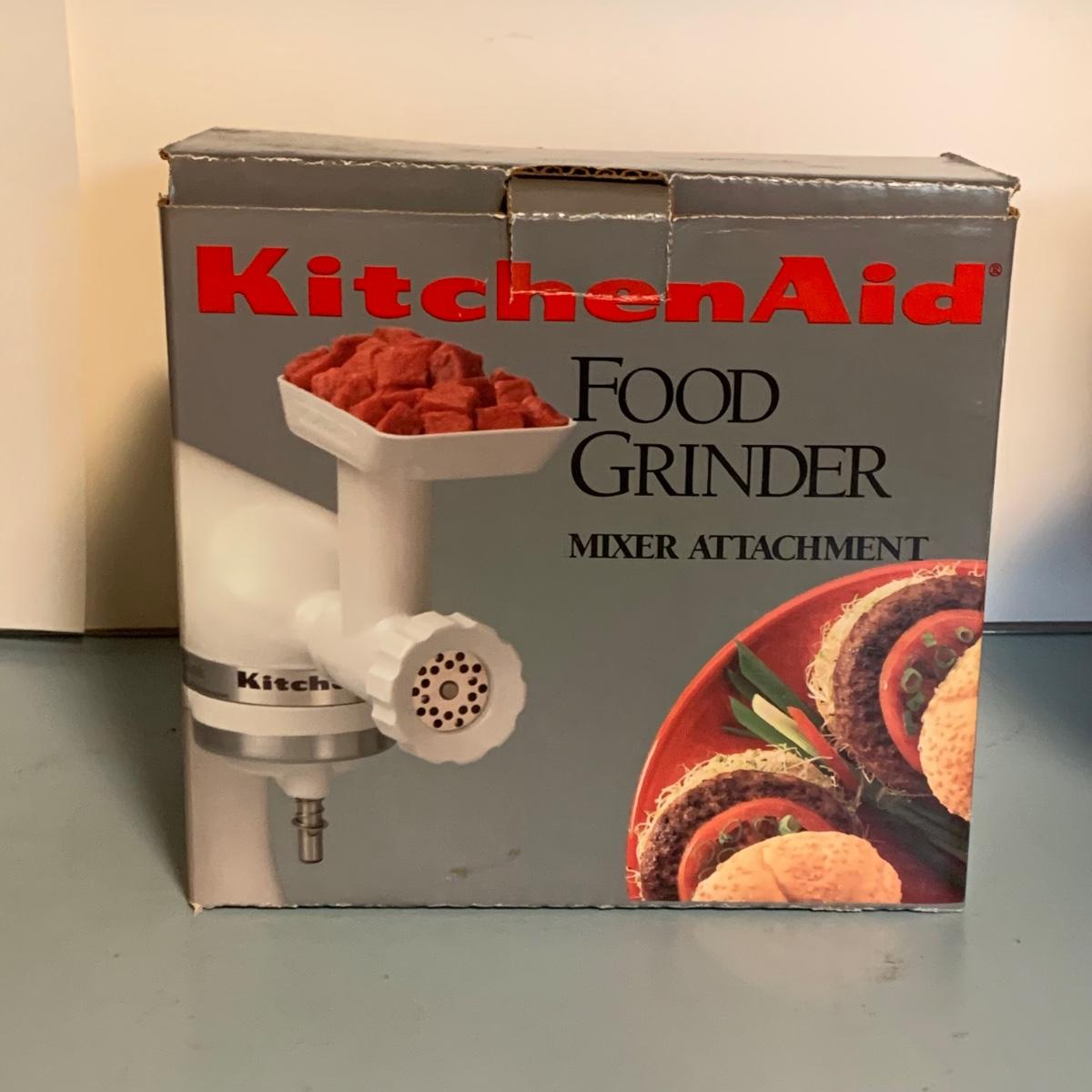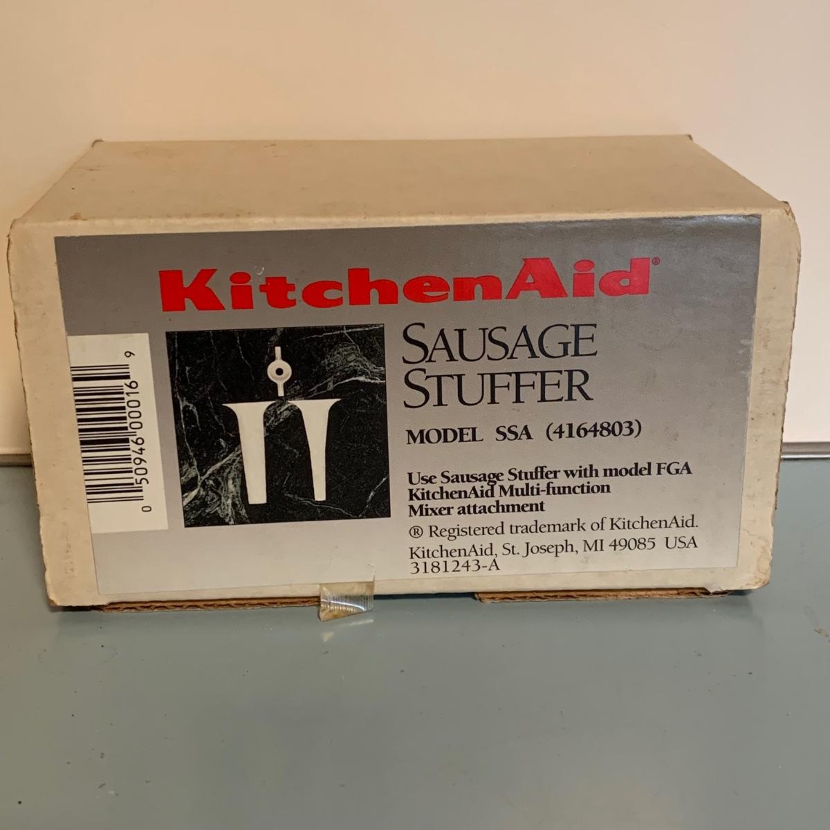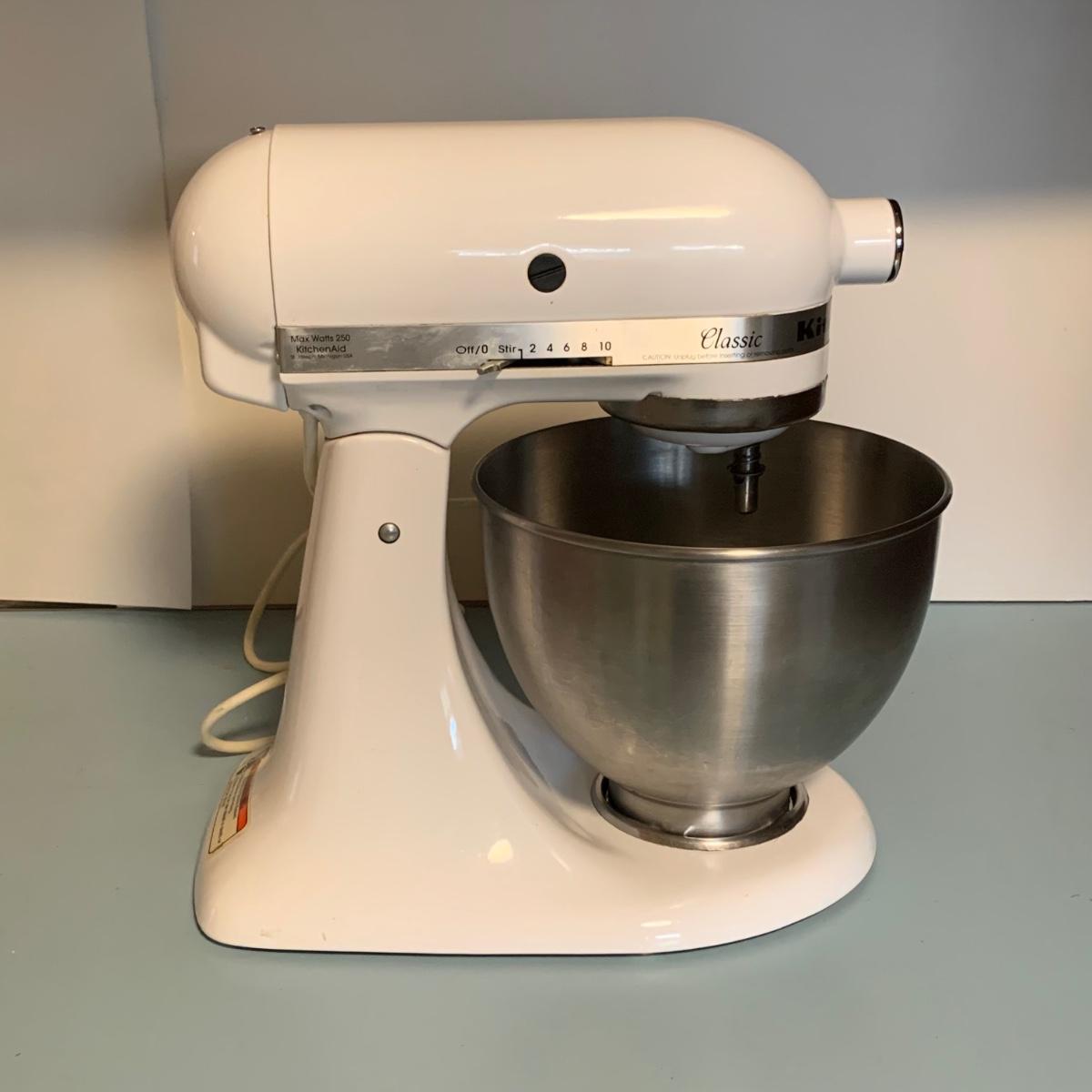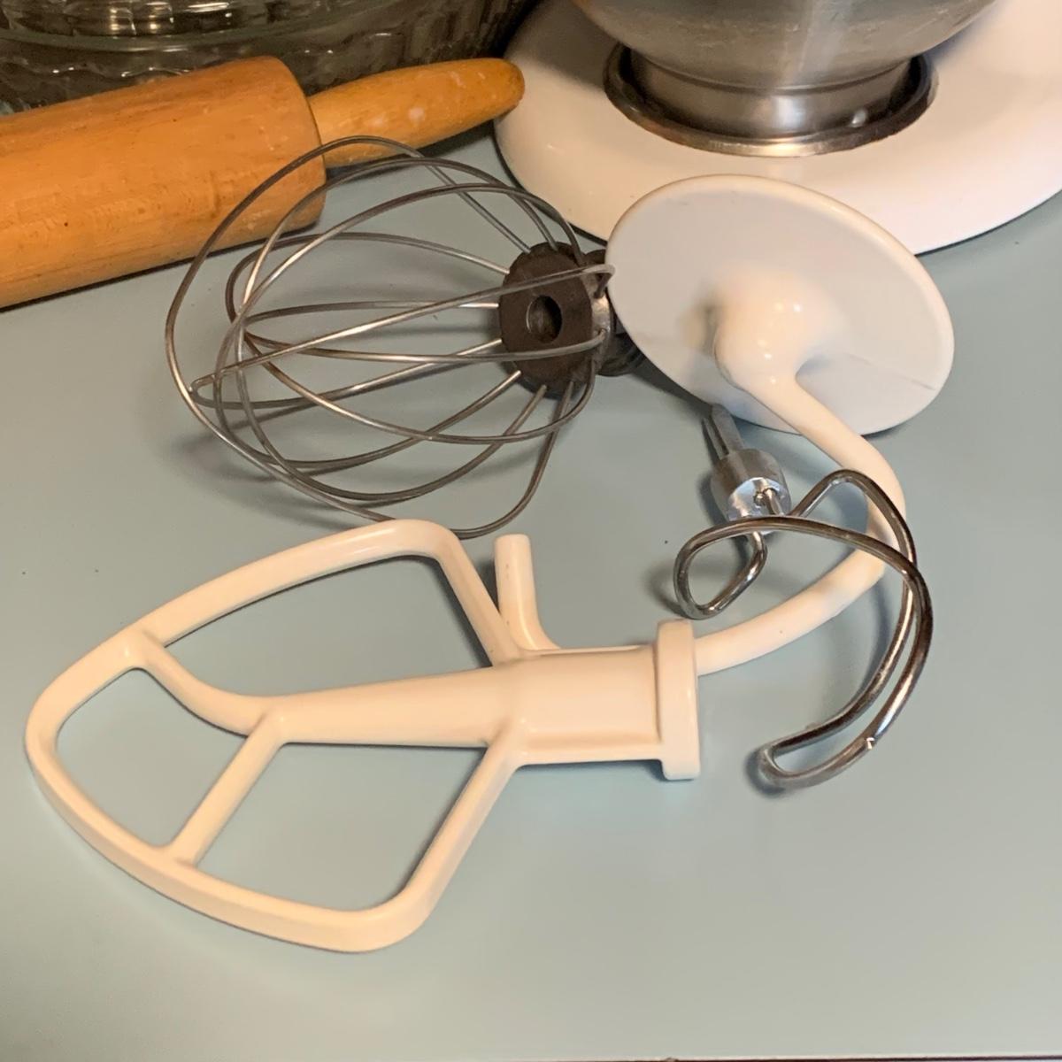 LOT 57K: Kitchen Aid Mixer w/Beaters, Food Grinder & Sausage Stuffer, Apple Peeler/Corer, Rolling Pins, Metal Bowls and a Vintage Covered Cake Plate