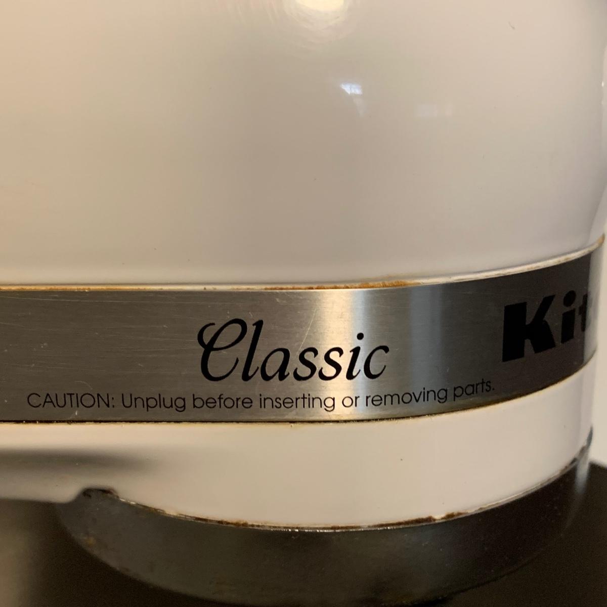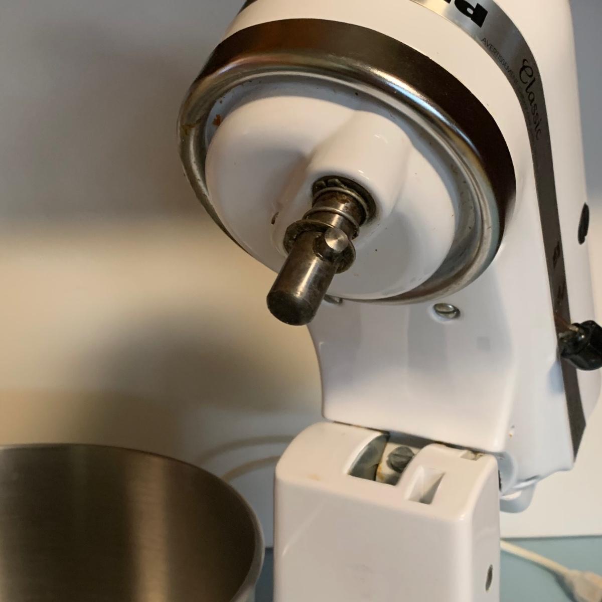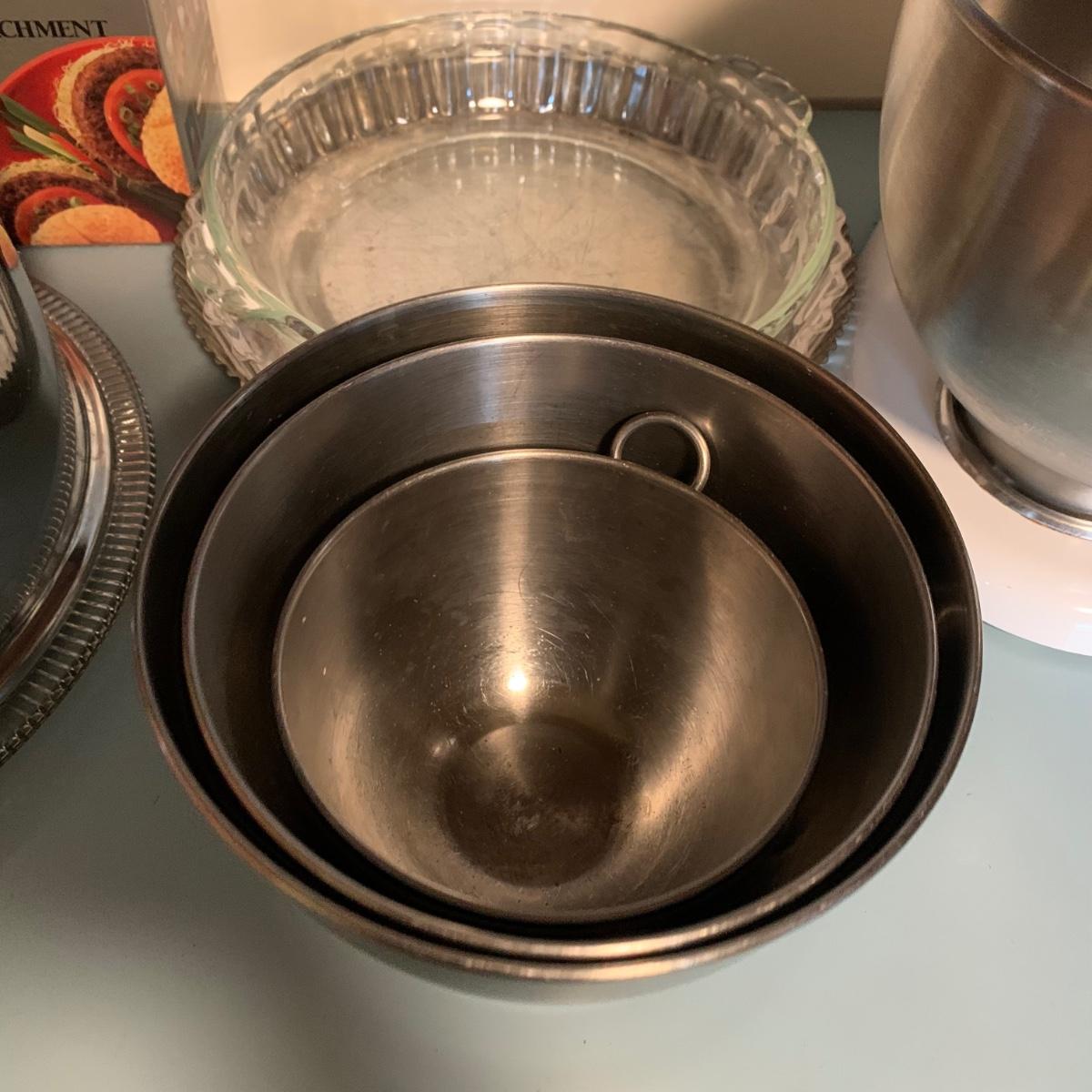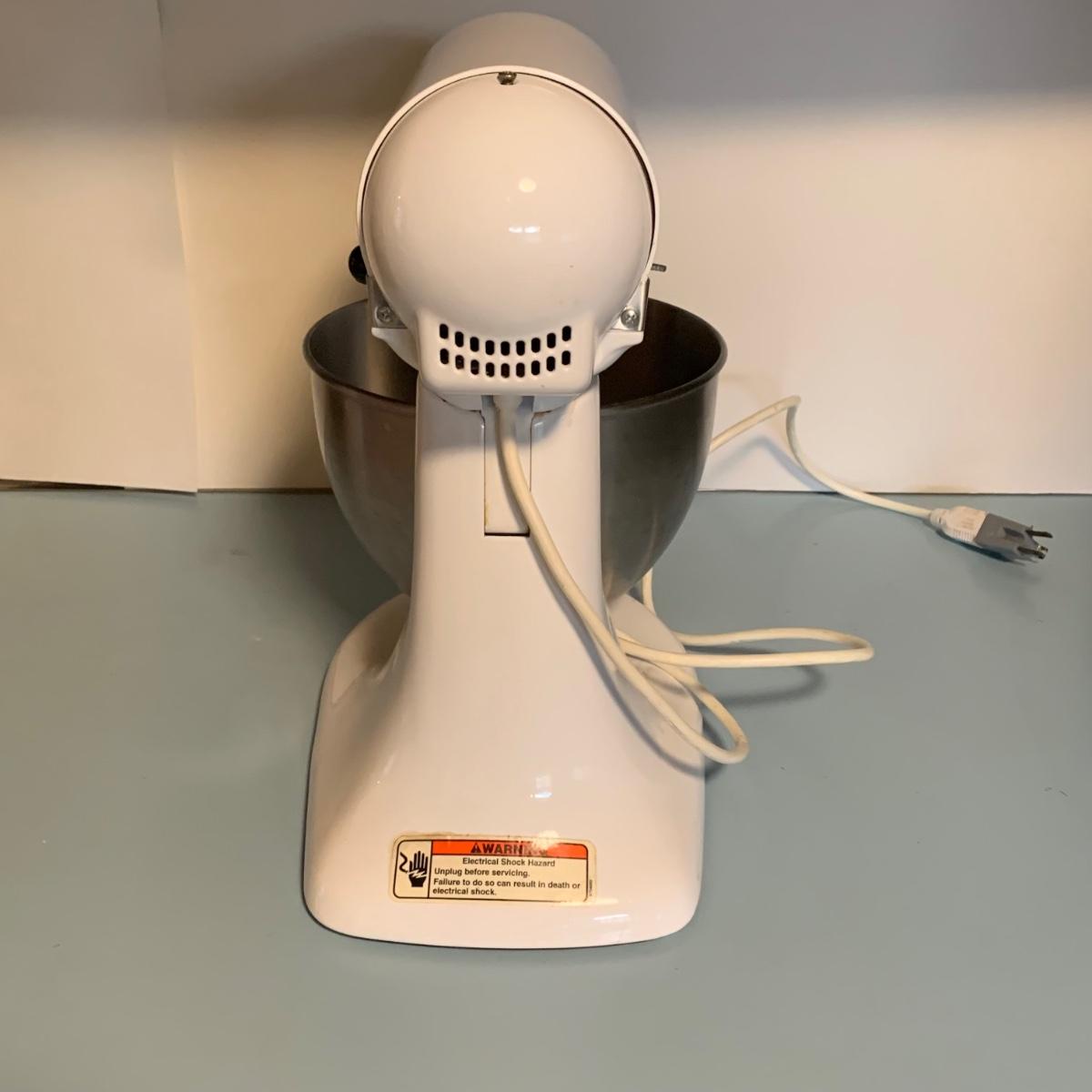 LOT 57K: Kitchen Aid Mixer w/Beaters, Food Grinder & Sausage Stuffer, Apple Peeler/Corer, Rolling Pins, Metal Bowls and a Vintage Covered Cake Plate
