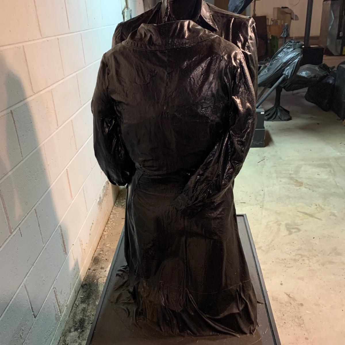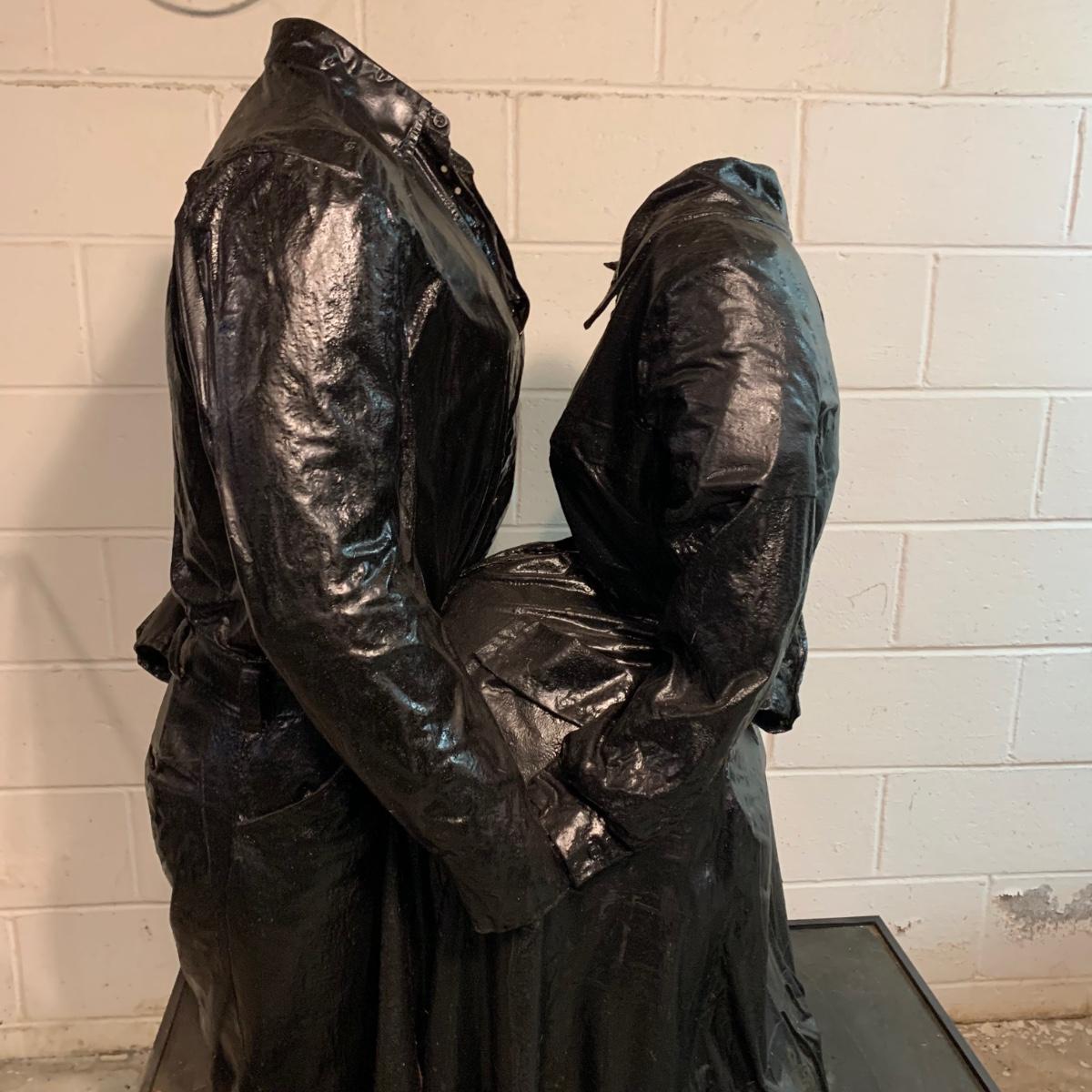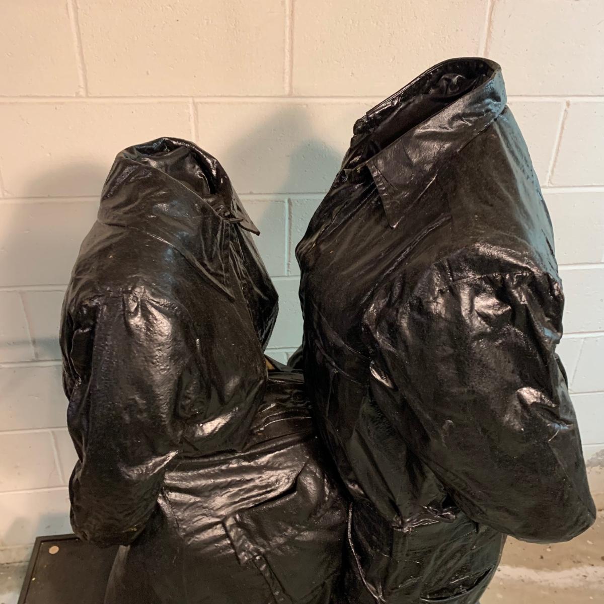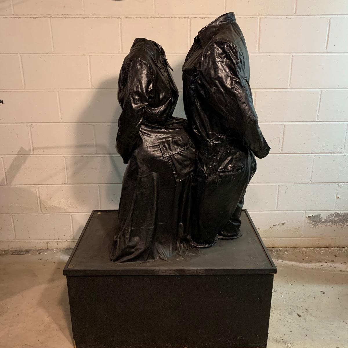 The exact composition of the sculptures is unknown. Some appear to be actual articles of clothing while others may be cloth which has been hardened then painted. They are life-size, lighter in weight.