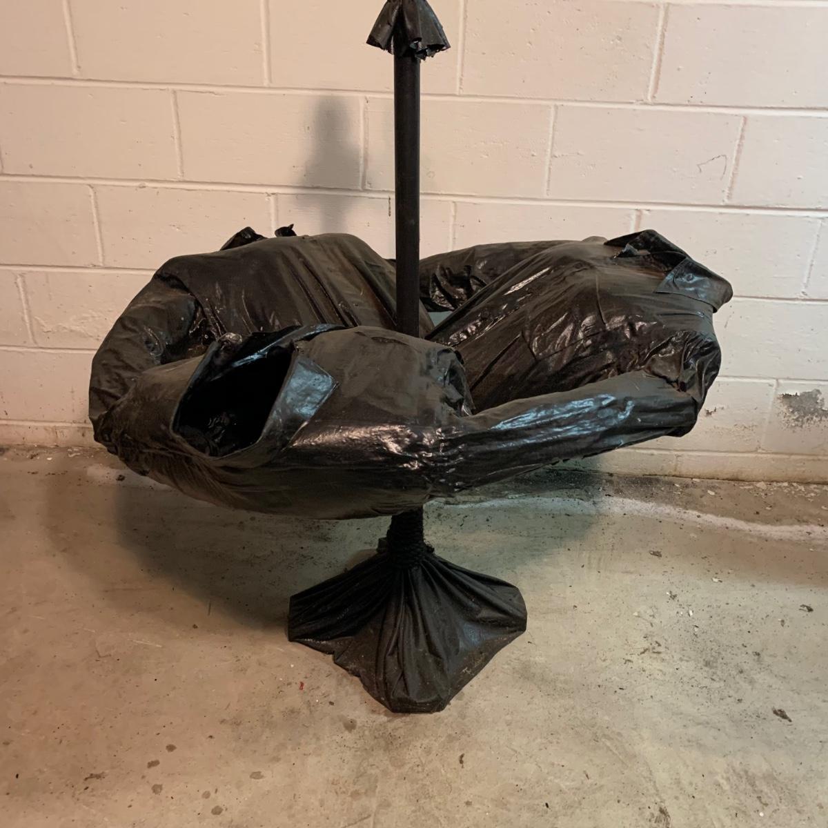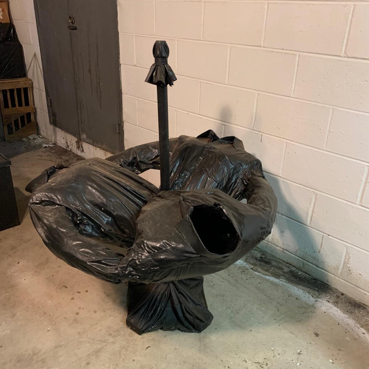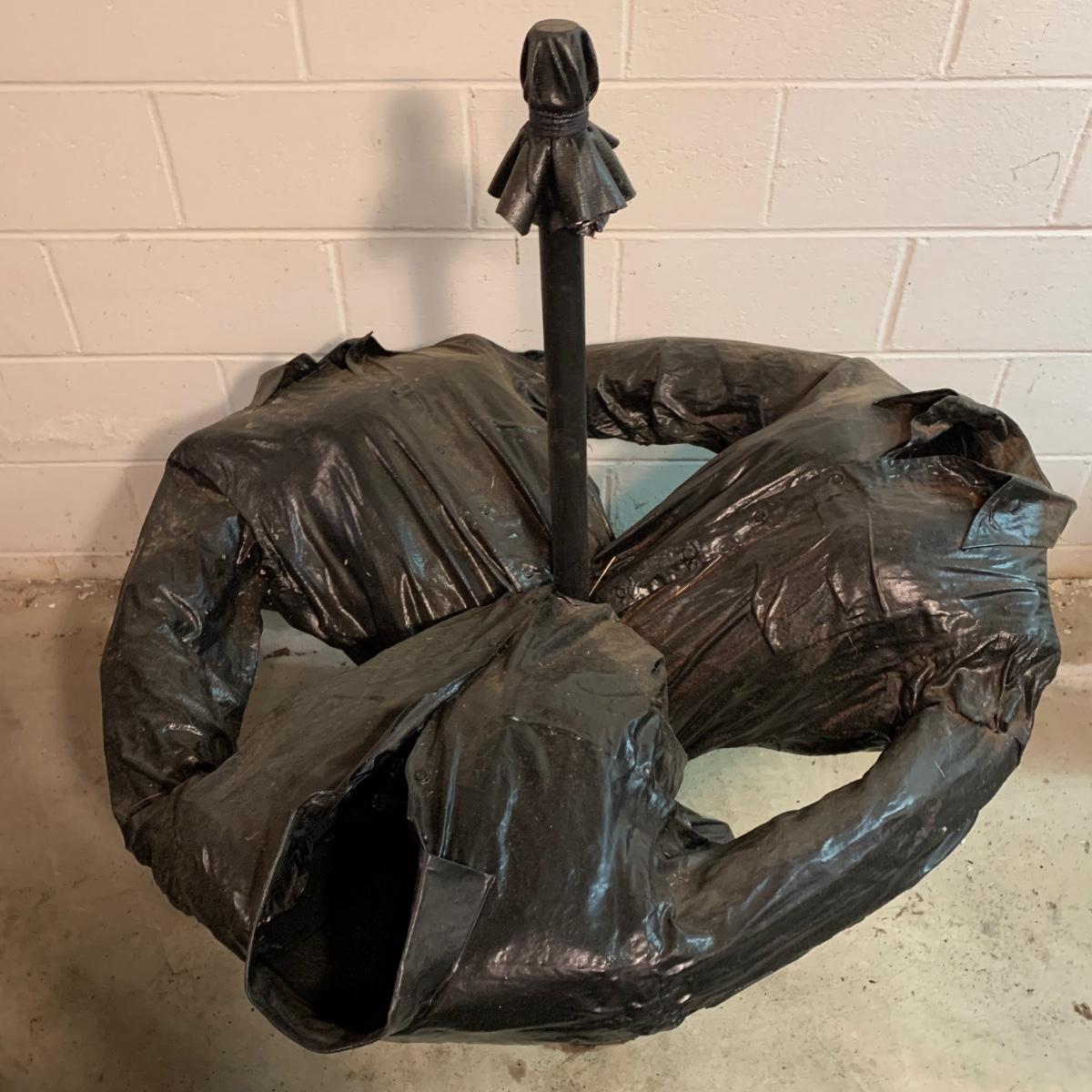 The exact composition of the sculptures is unknown. Some appear to be actual articles of clothing while others may be cloth which has been hardened then painted. They are life-size, lighter in weight.