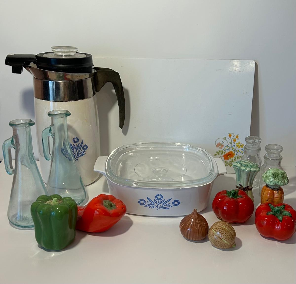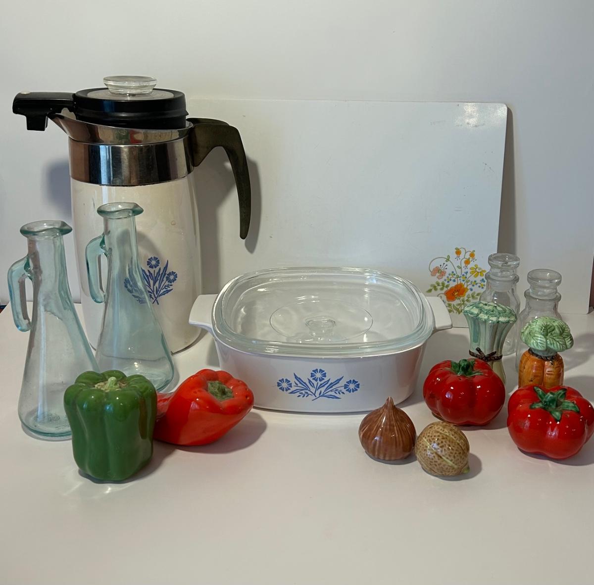 Corning Ware, cutting board, vegetable salt & pepper shakers, herb bottles, oil & vinegar bottles and more in this vintage kitchen lot.