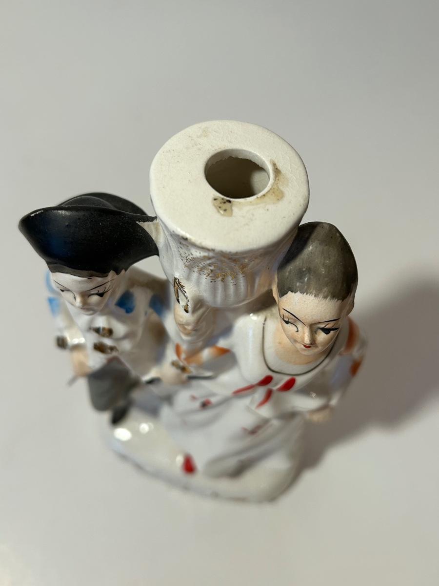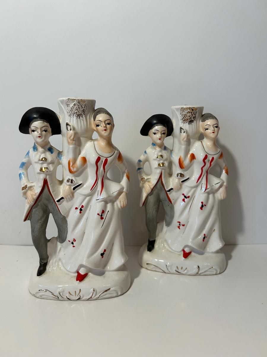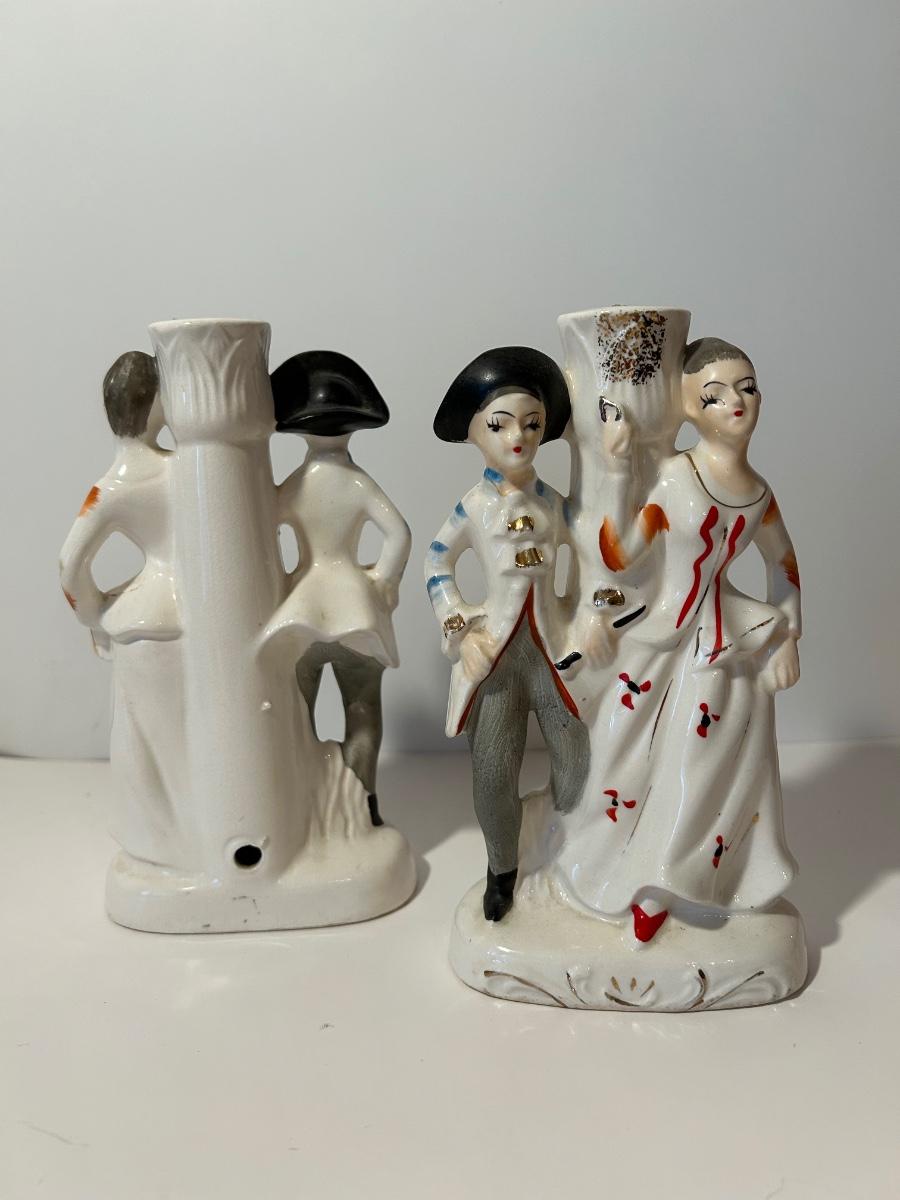 Decorative bowl has been repaired. Pair of Colonial couple lamp base used as decor and no longer has wiring/shade but can be added.