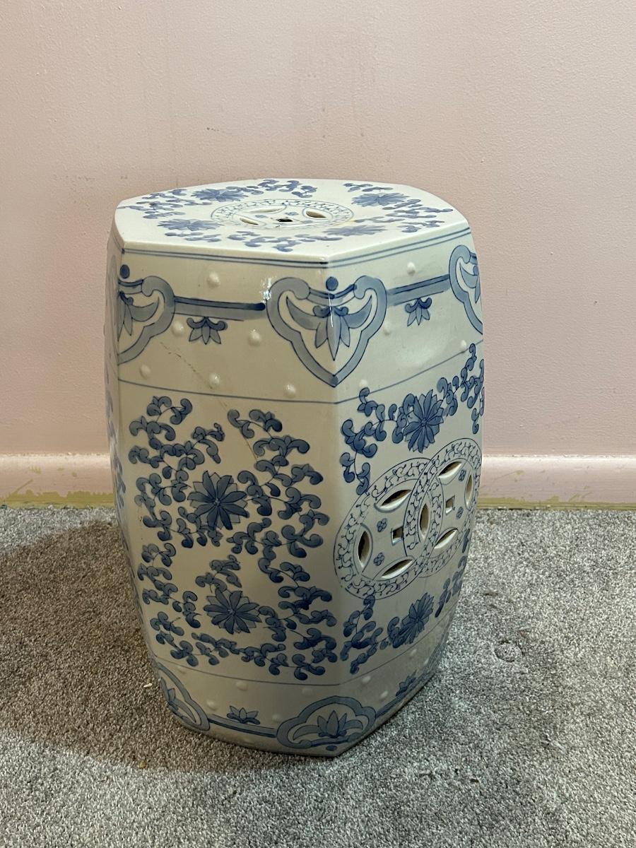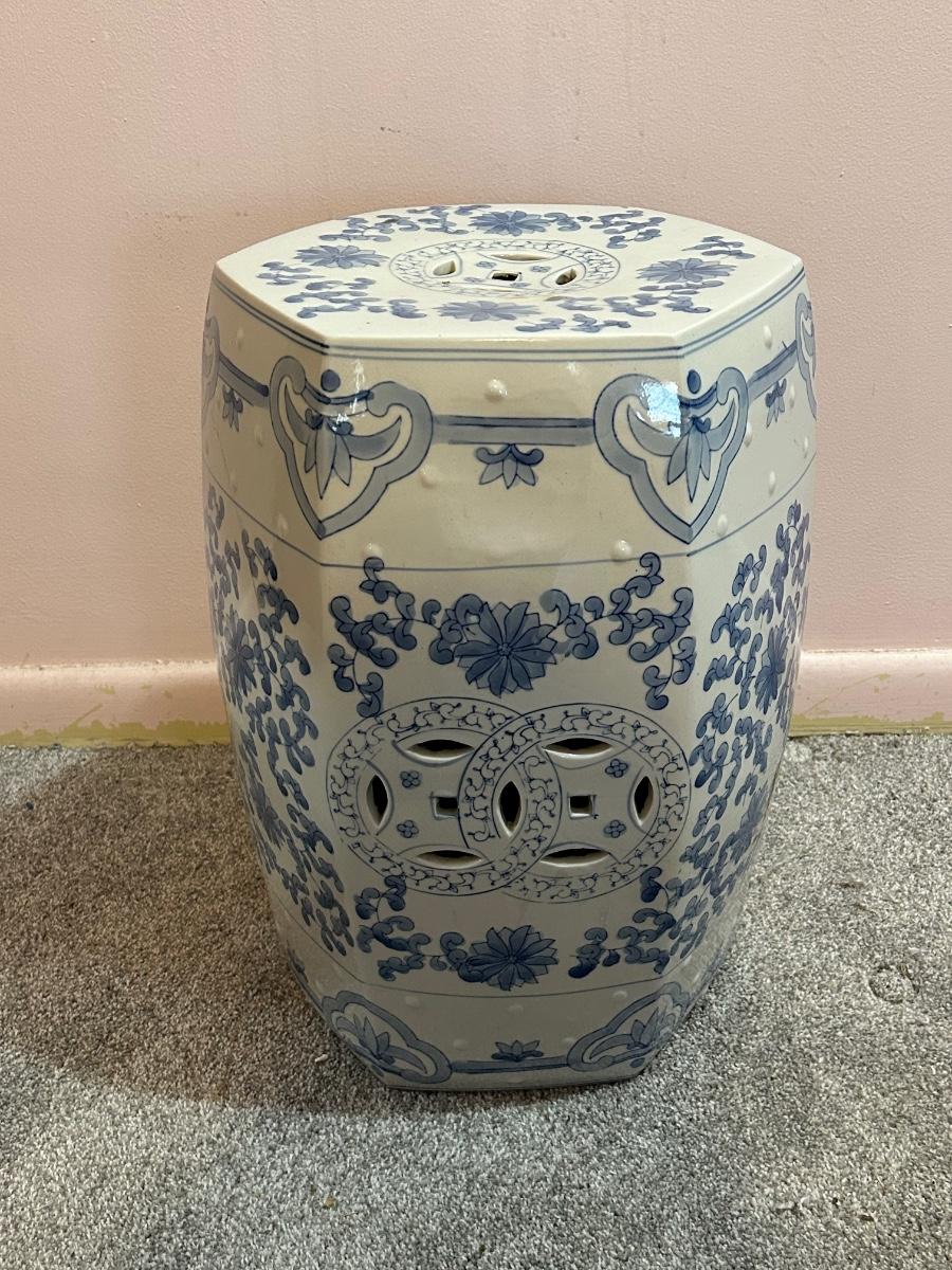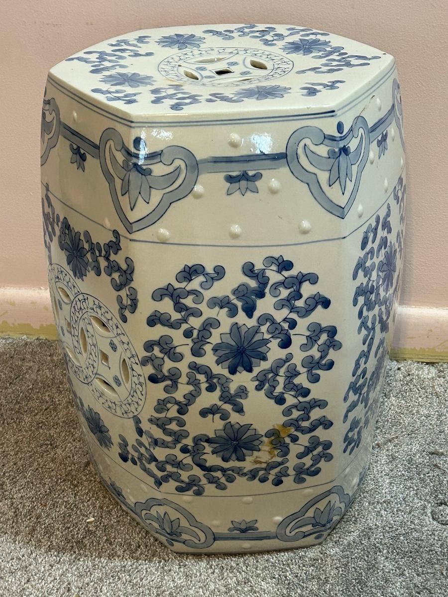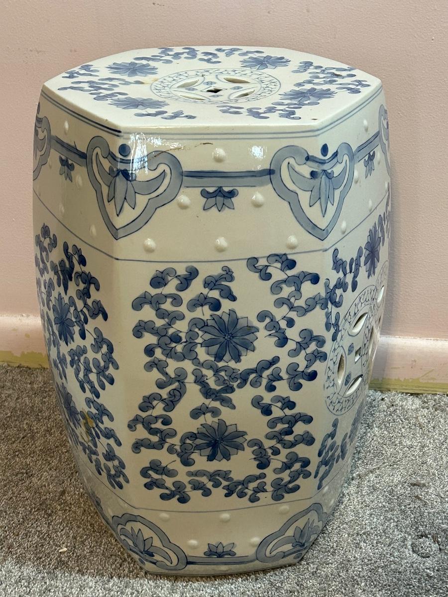 LOT 115H: Small Accent Table With Ornate Blue and White Detailing