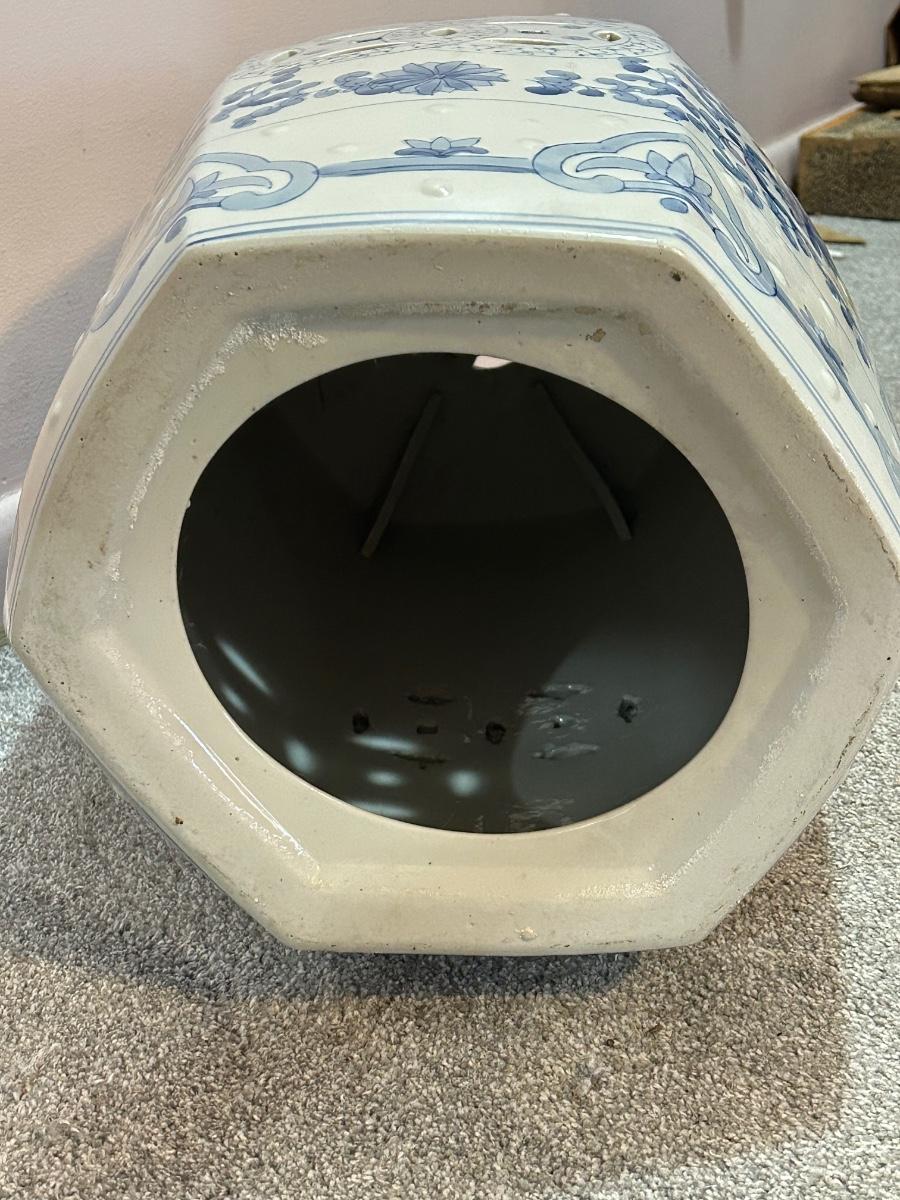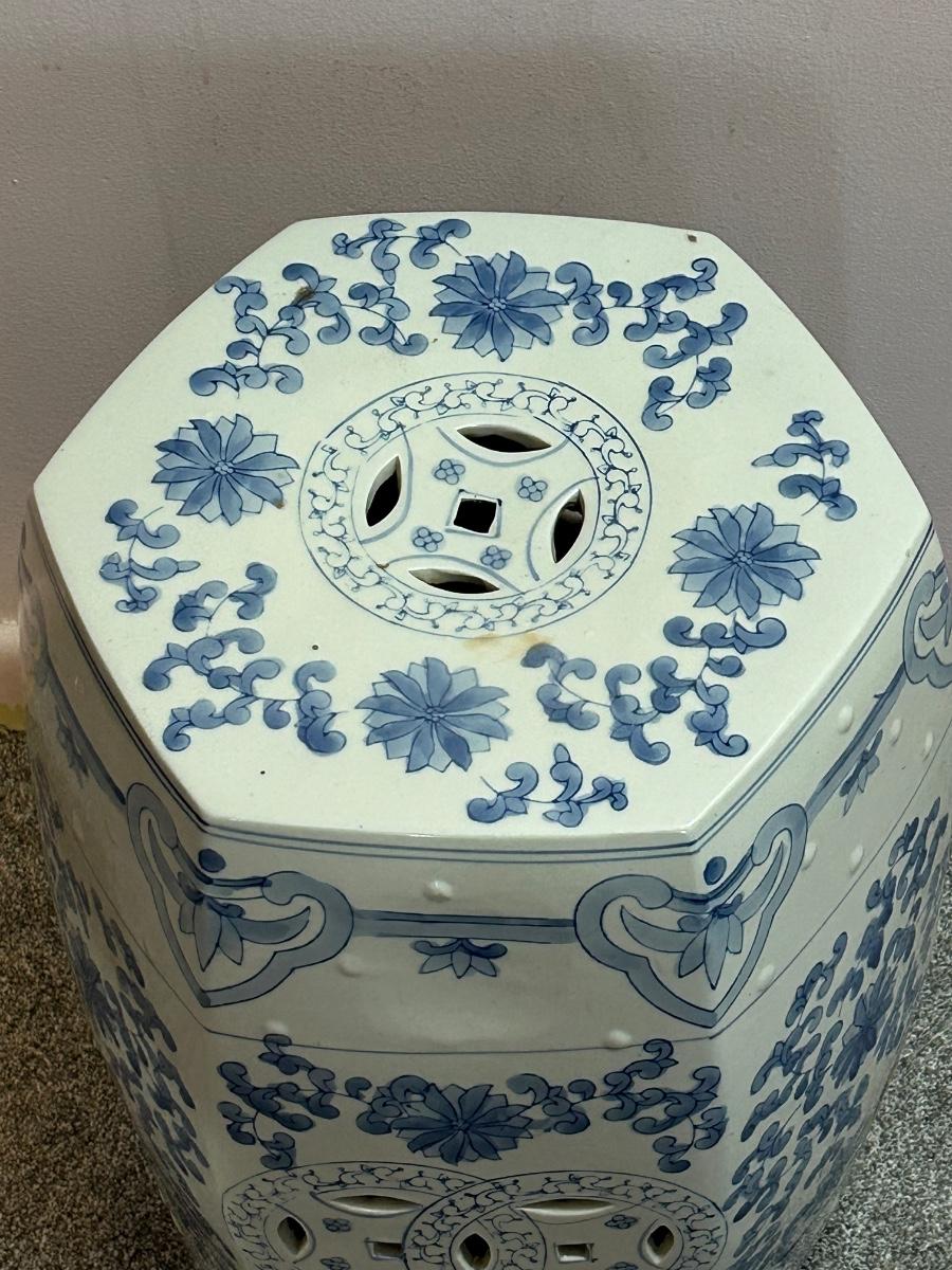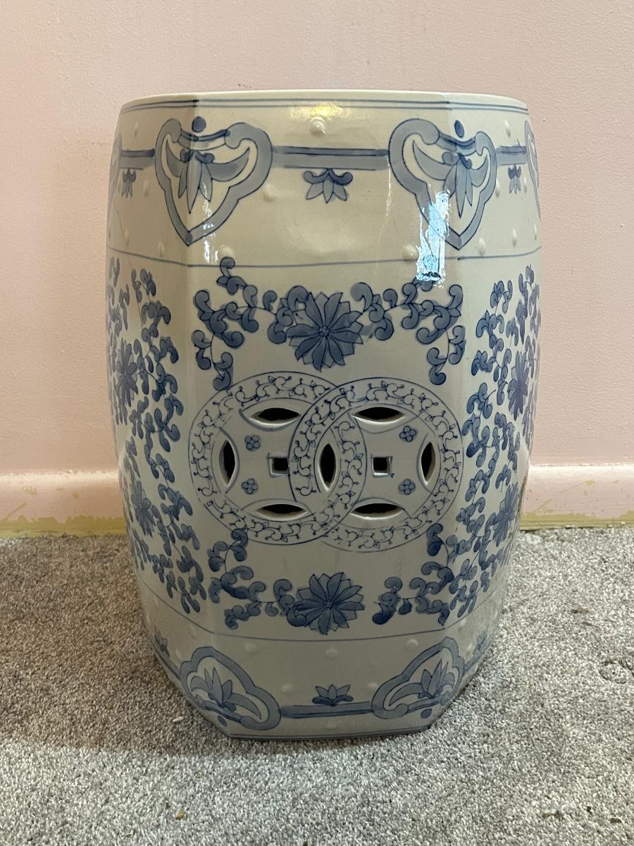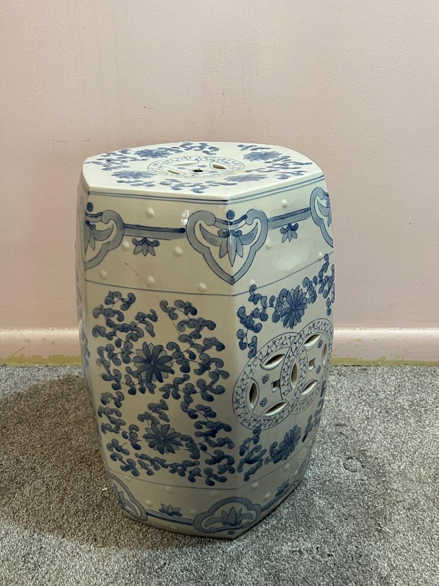 LOT 115H: Small Accent Table With Ornate Blue and White Detailing