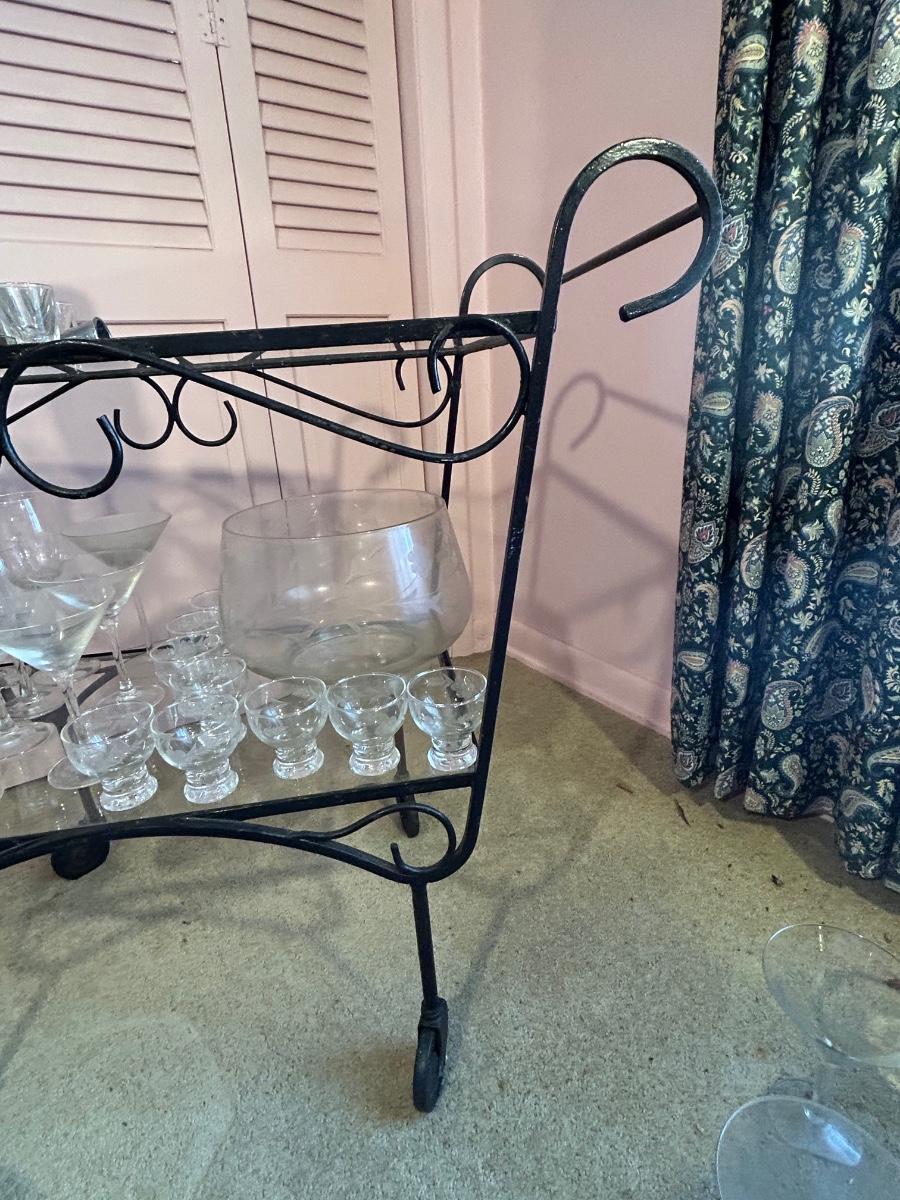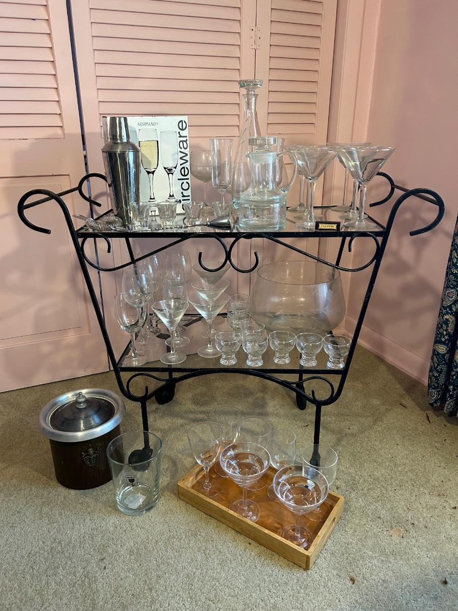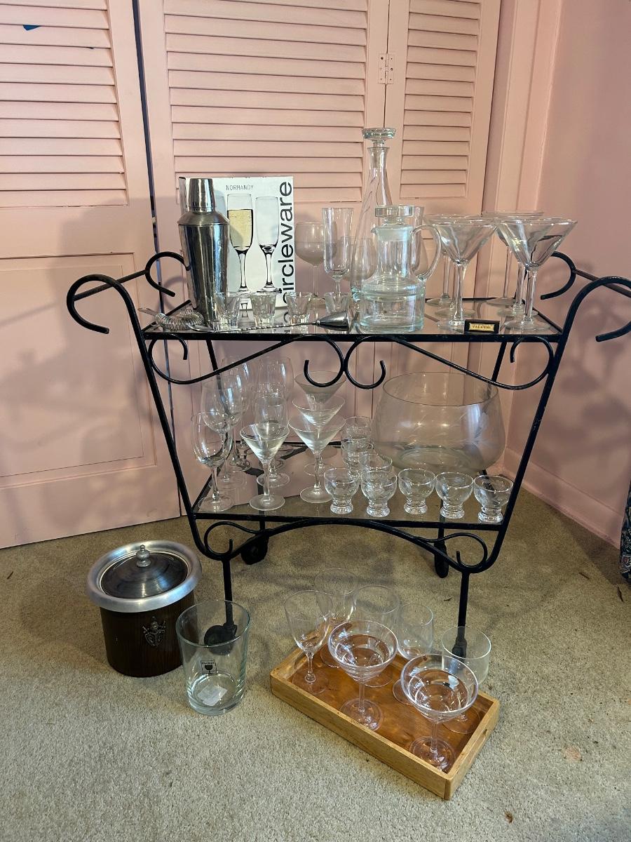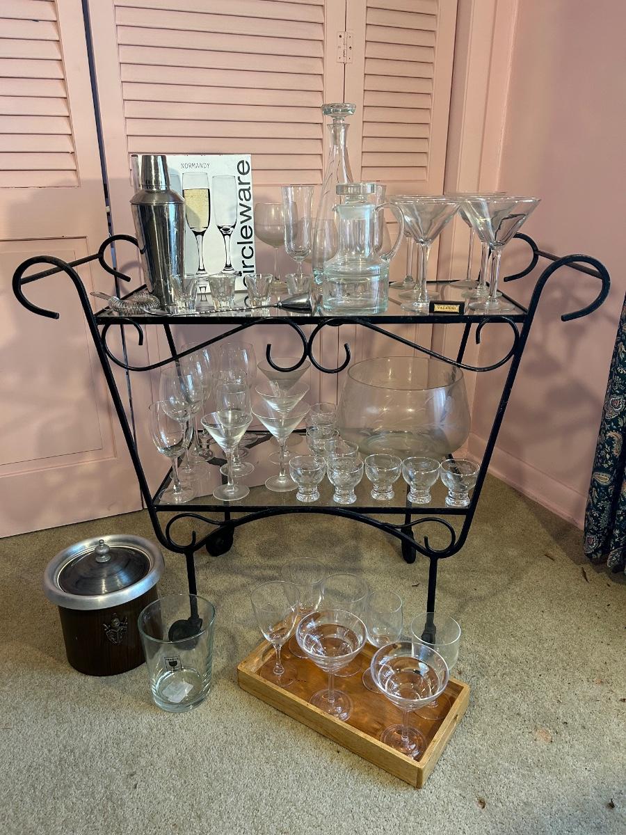 Bar cart and large collection of bar accessories including ice box, tray, shaker, decanter, punch bowl and many glasses. Shot glasses, martini glasses new in box wine glasses and more.