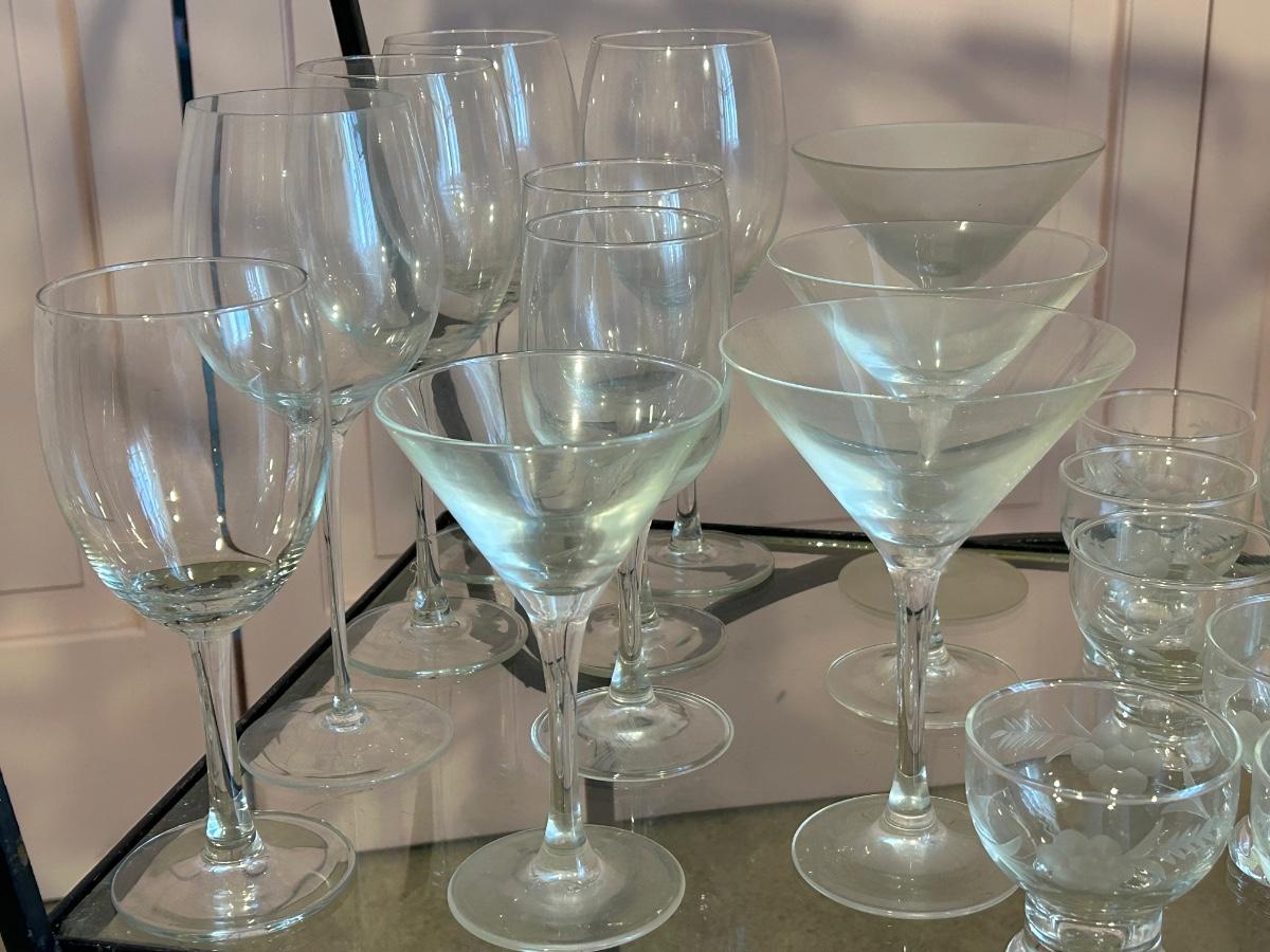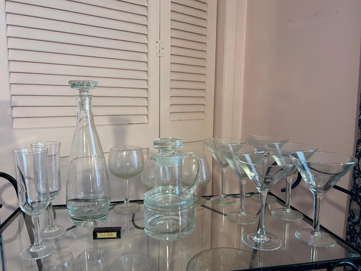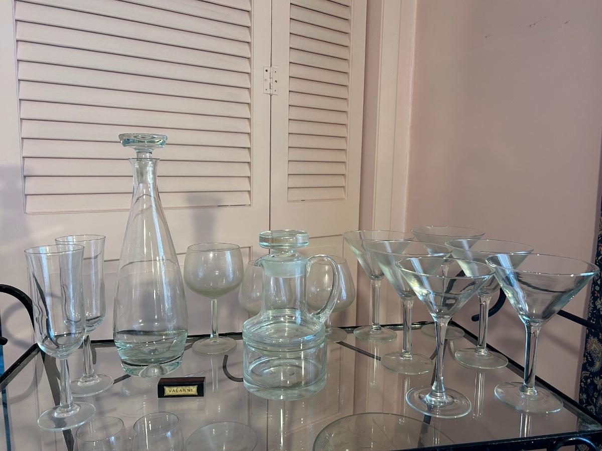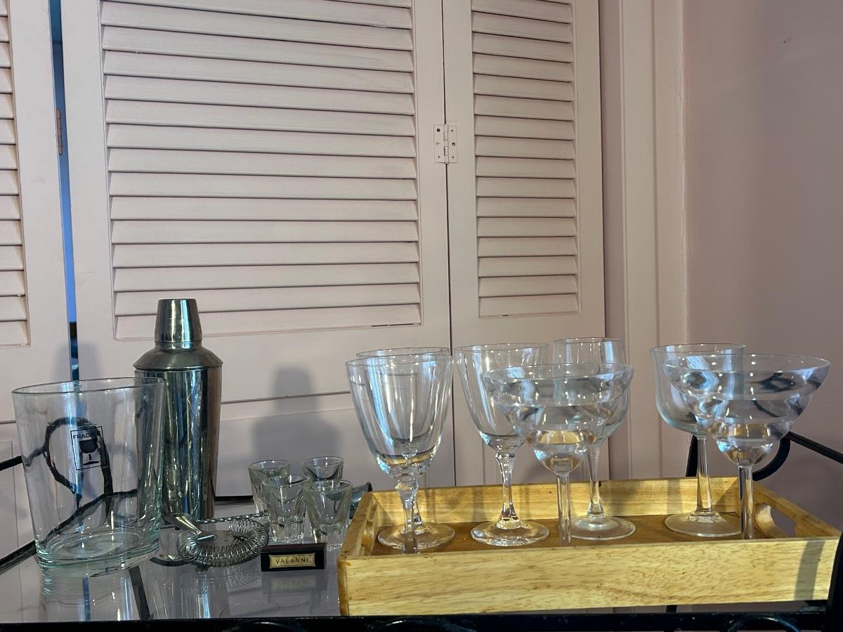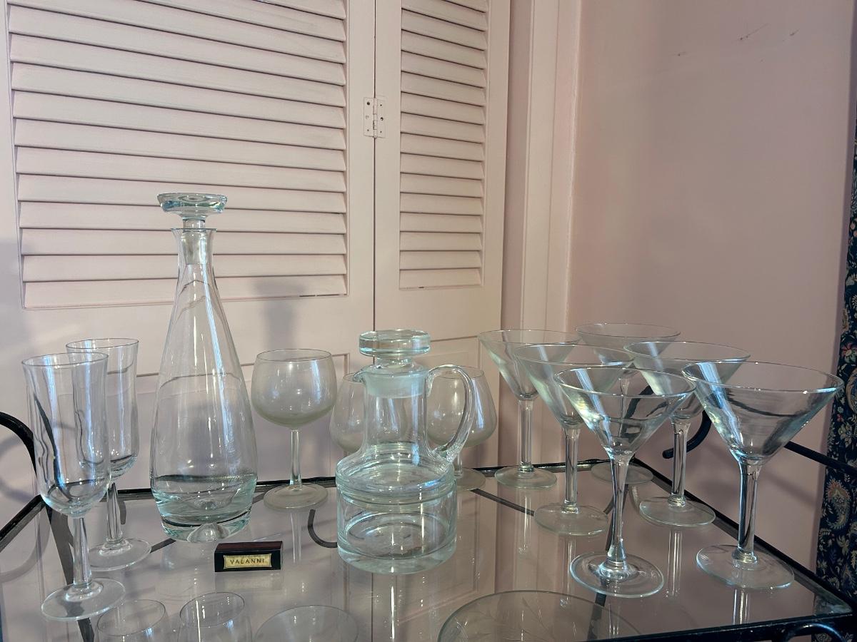 Bar cart and large collection of bar accessories including ice box, tray, shaker, decanter, punch bowl and many glasses. Shot glasses, martini glasses new in box wine glasses and more.