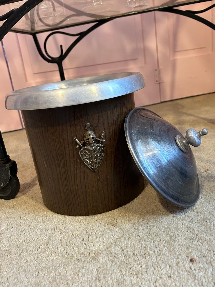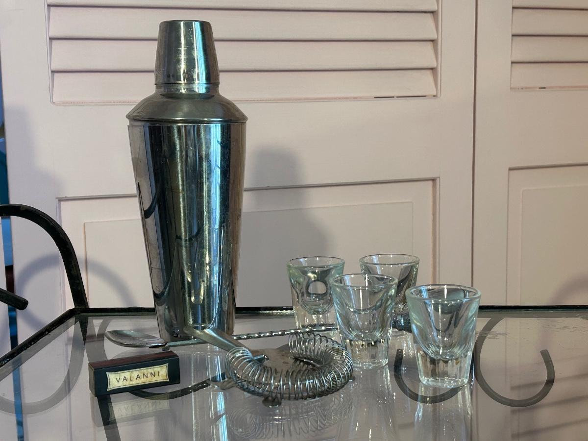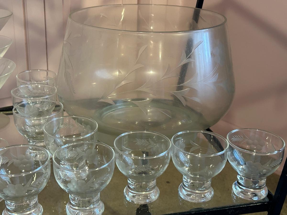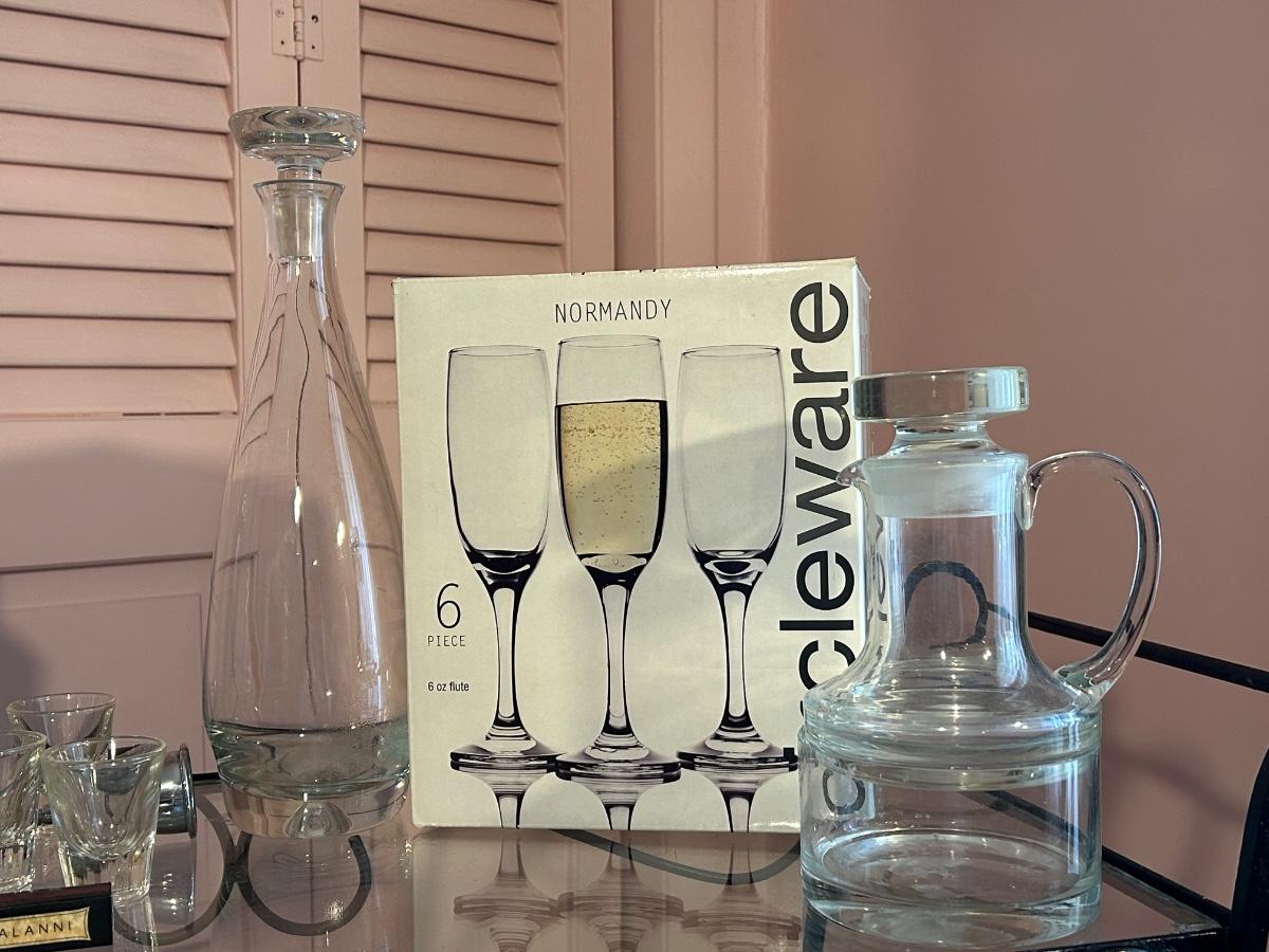 Bar cart and large collection of bar accessories including ice box, tray, shaker, decanter, punch bowl and many glasses. Shot glasses, martini glasses new in box wine glasses and more.