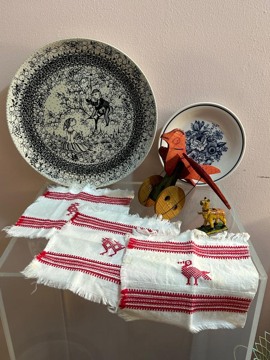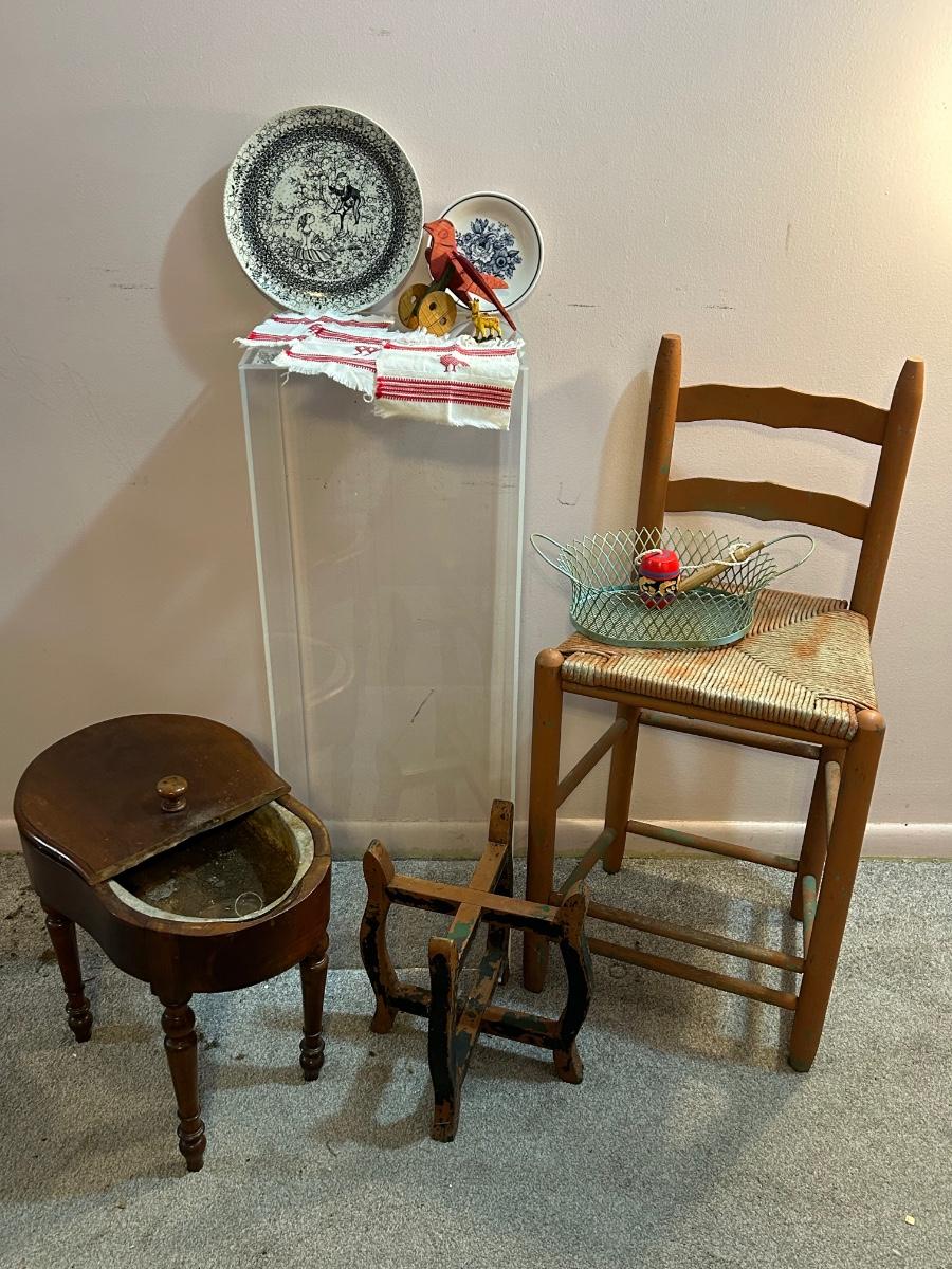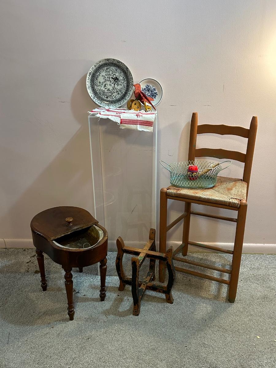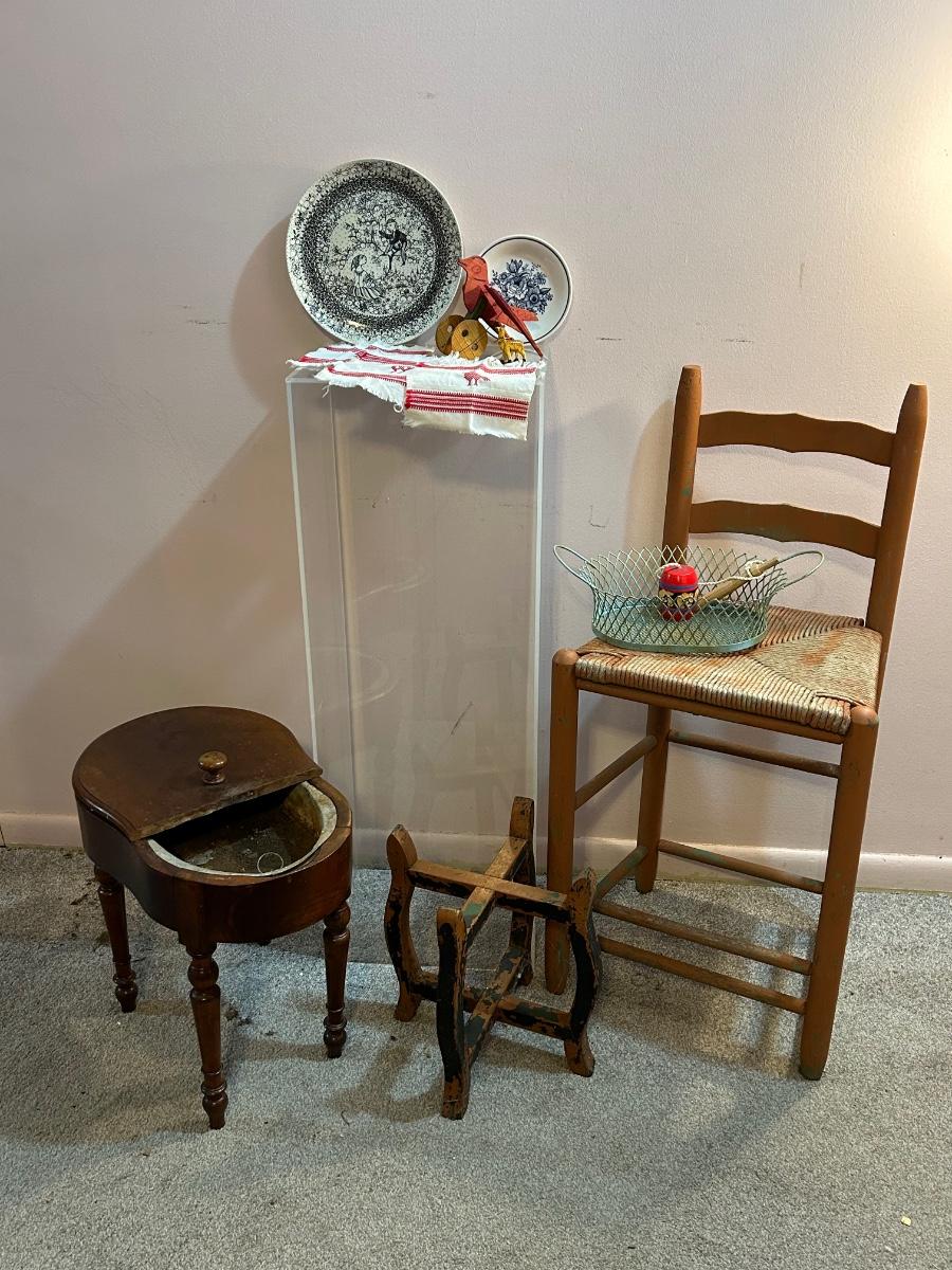 LOT 126H: Eclectic Collection; Acrylic Accent Table, Signed Plates, Chair, And More