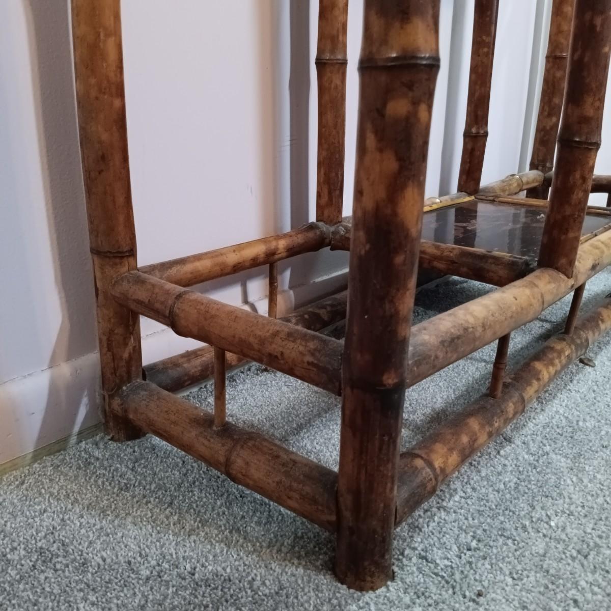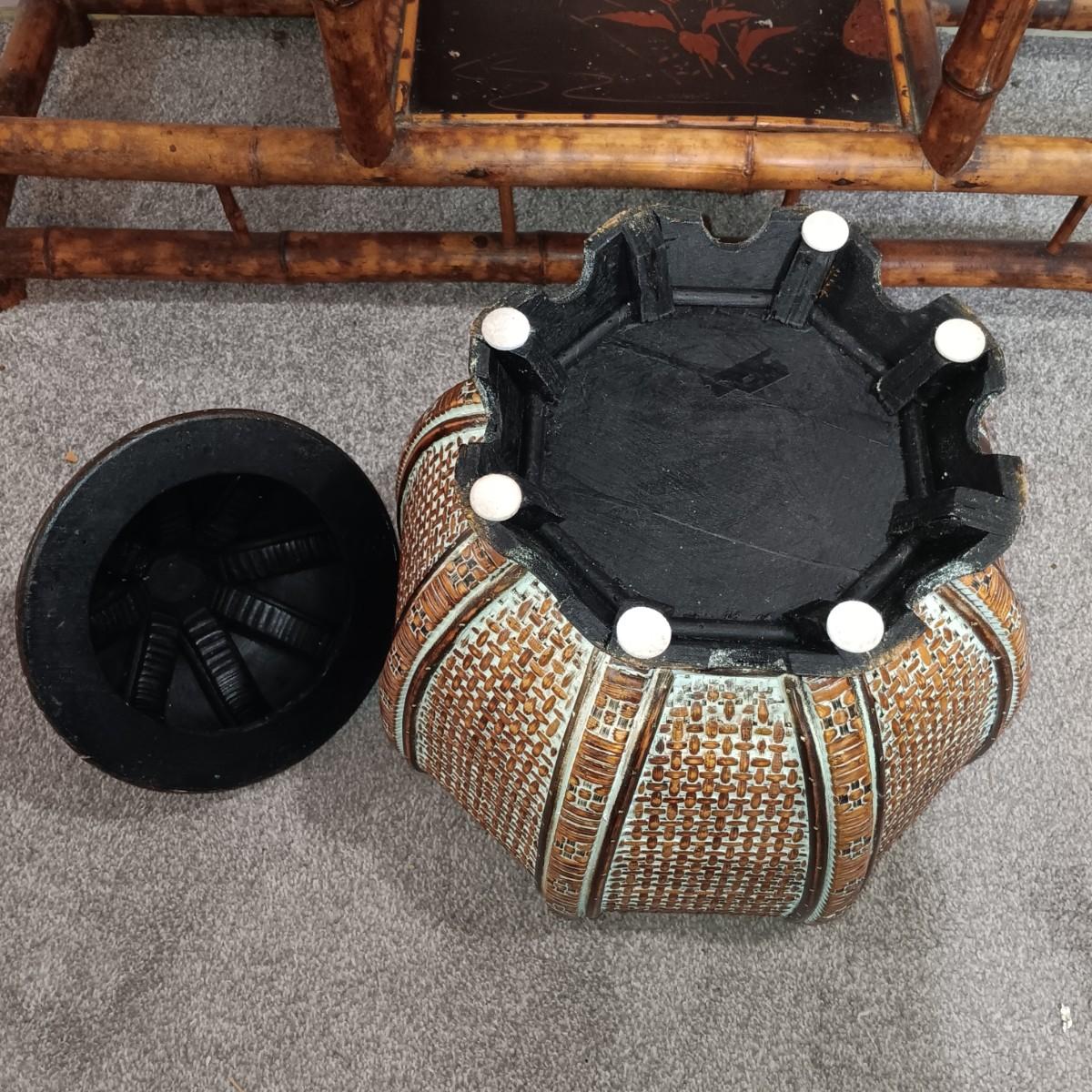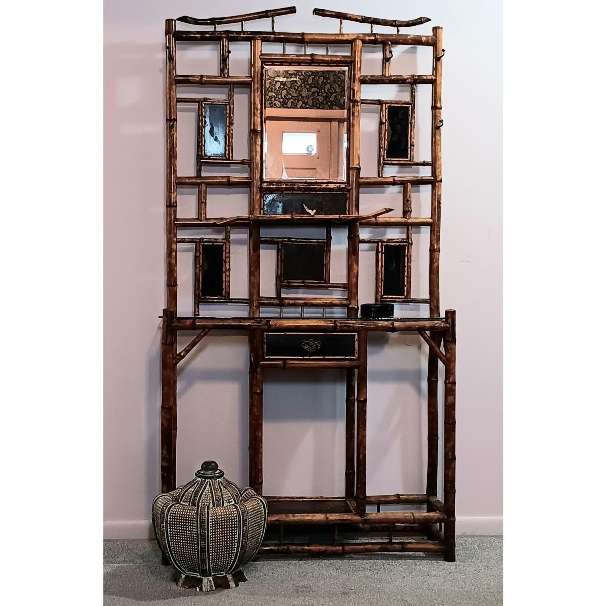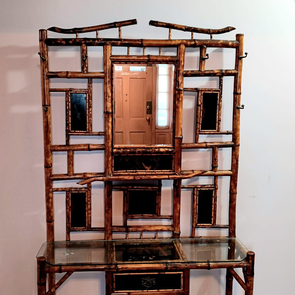 LOT 172H: Vintage Bamboo Hall Tree with Wooden Basket & Lacquered Box
