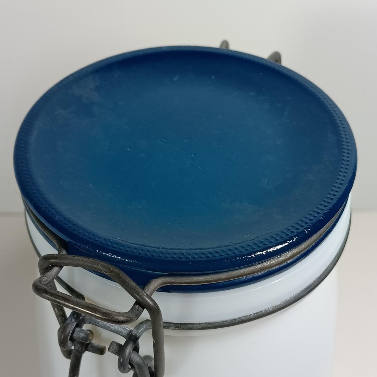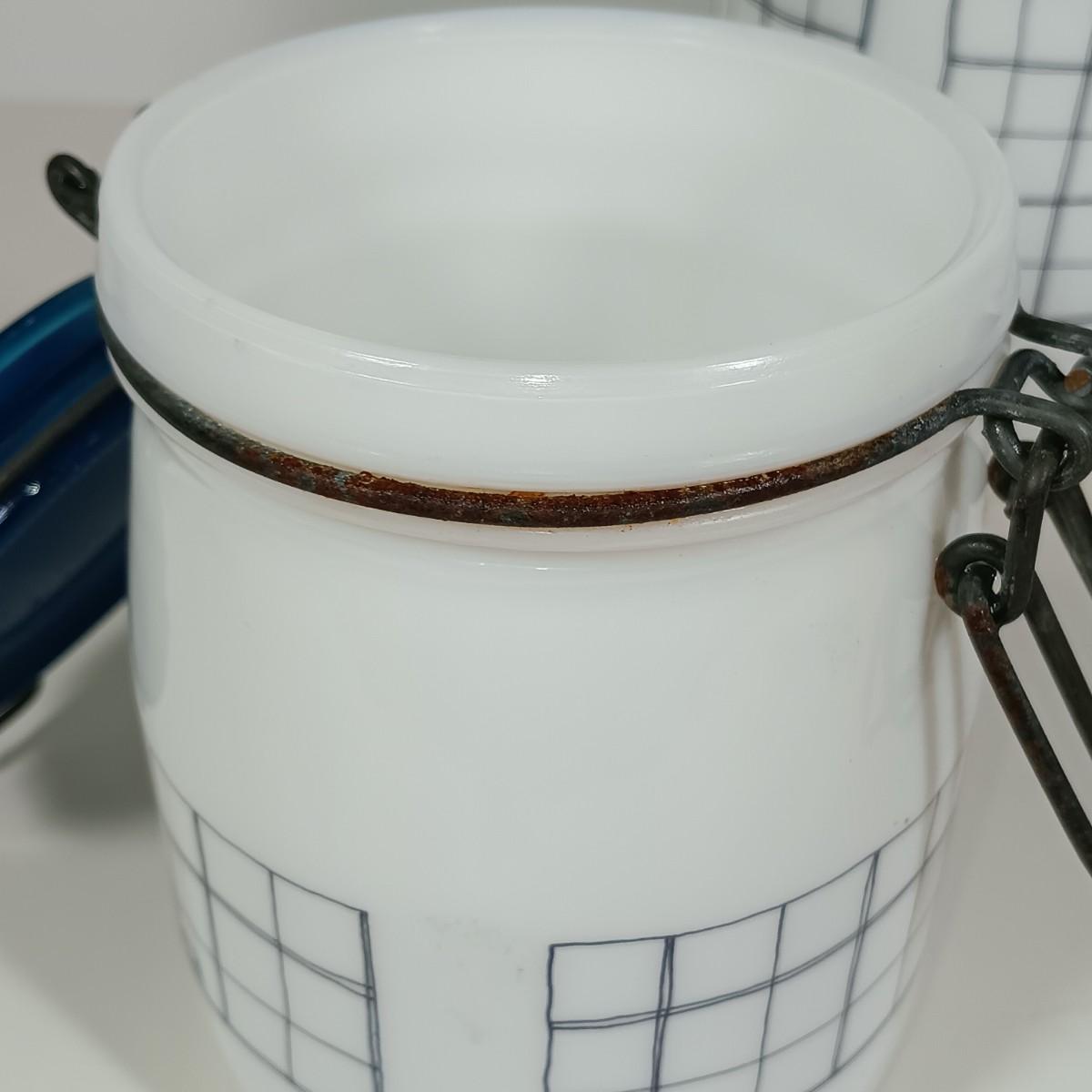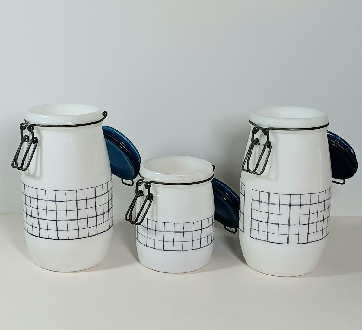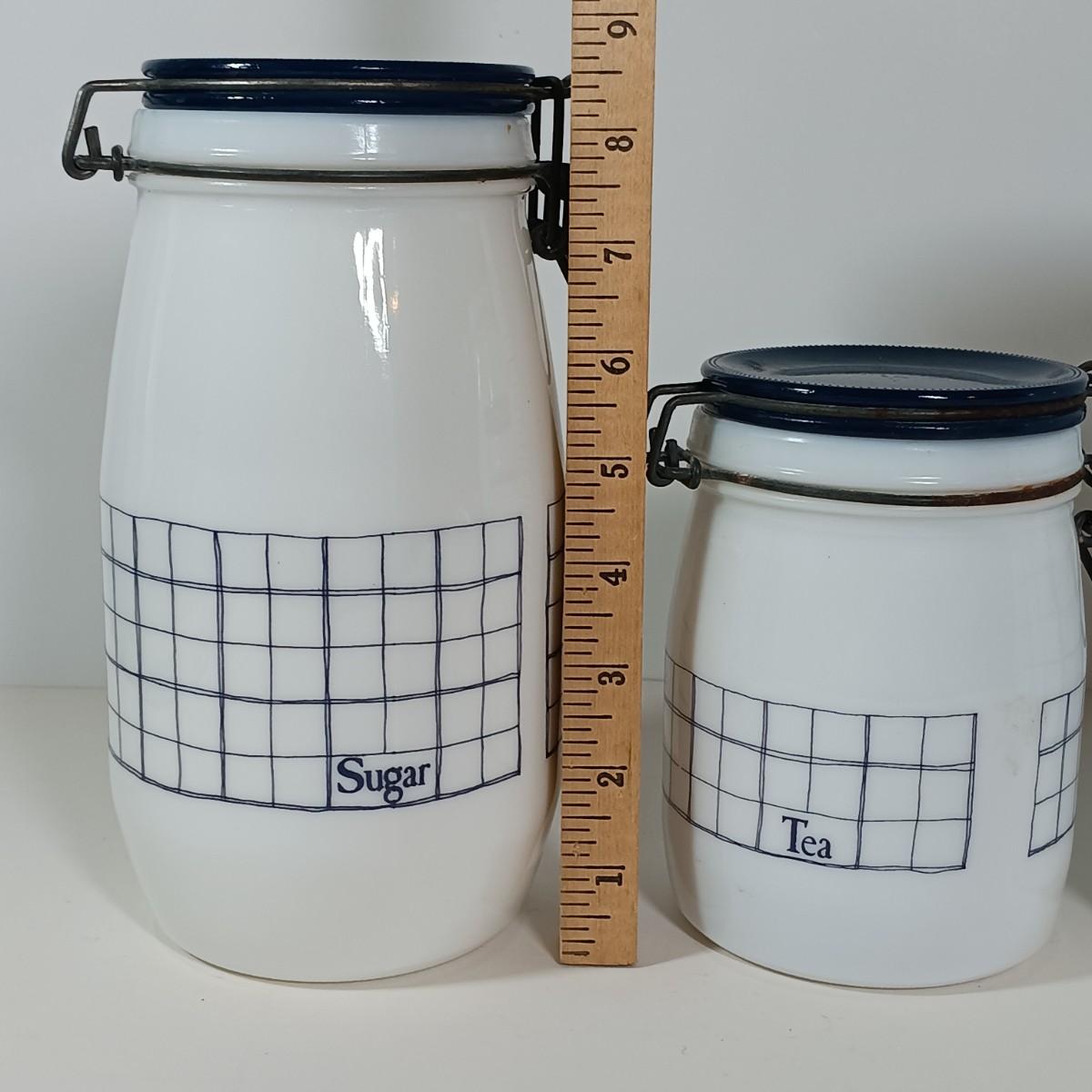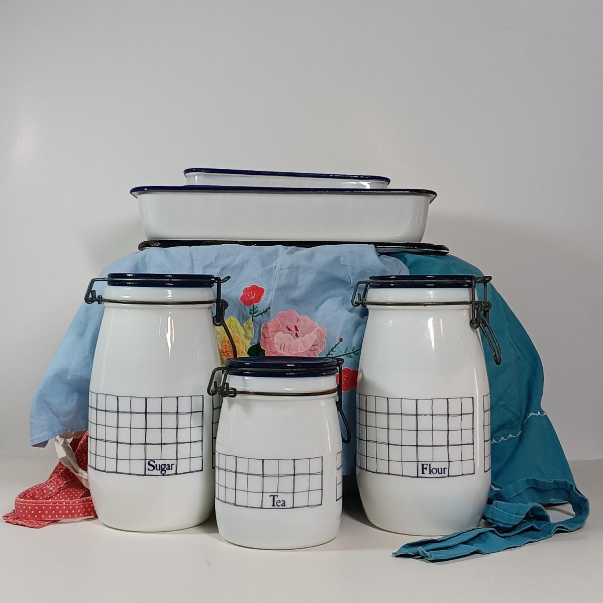 LOT 178L: Vintage Milk Glass Cannister Set w/ Enamelware & Vintage Aprons