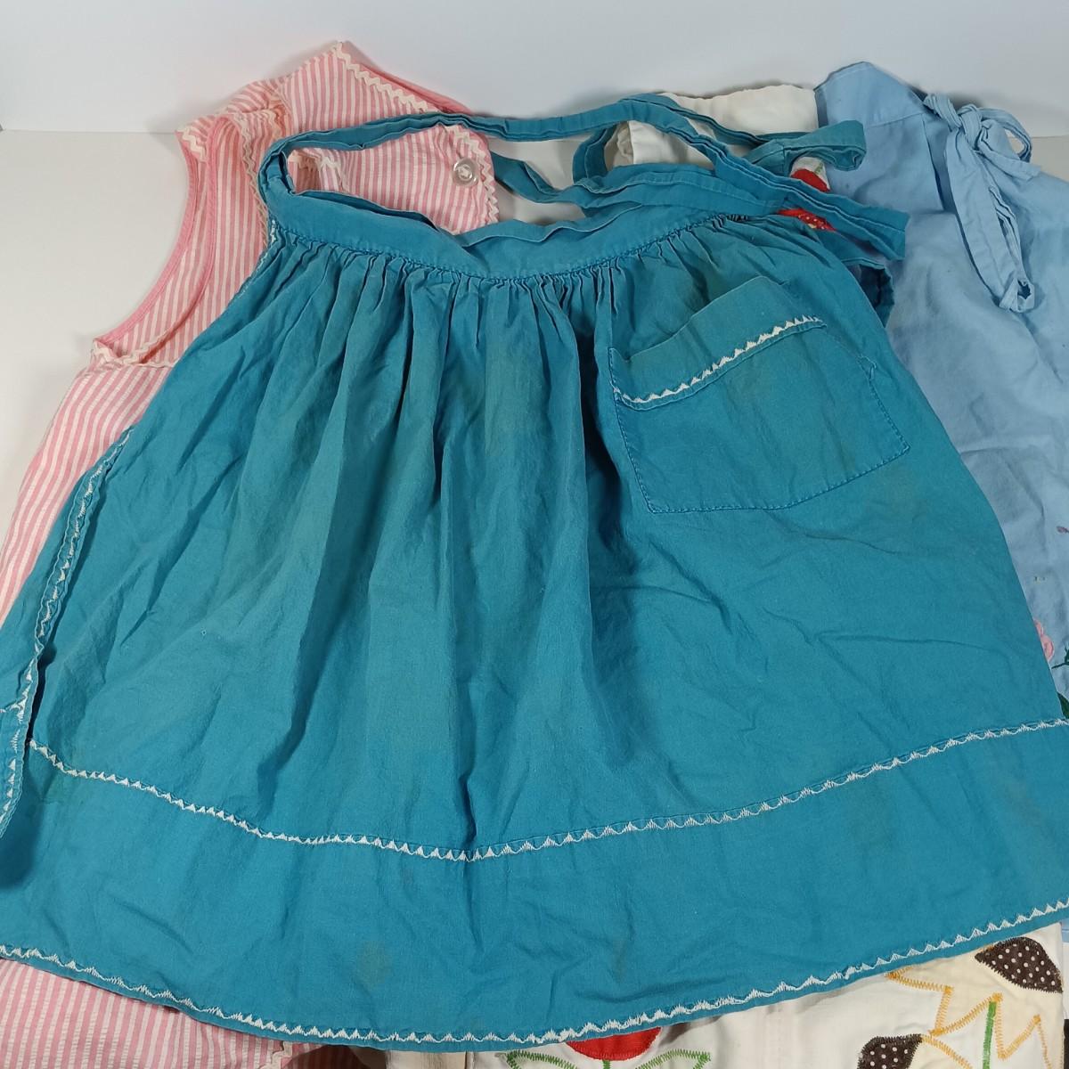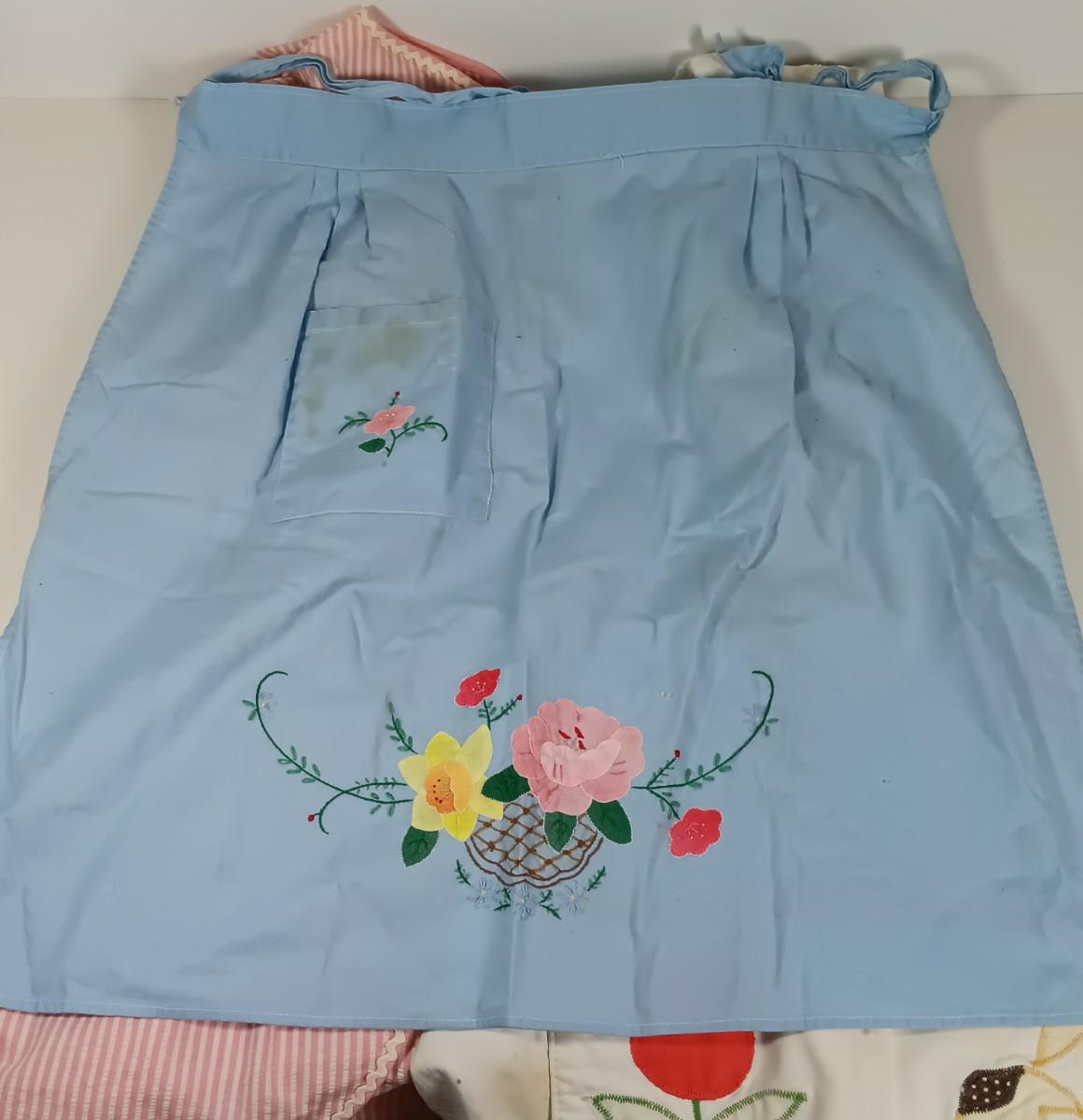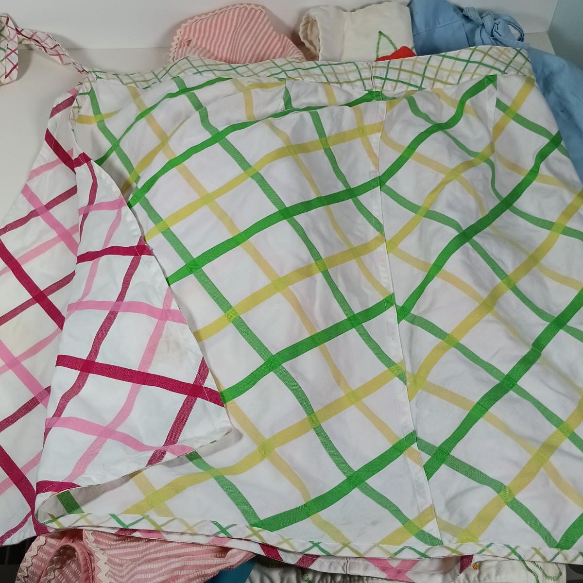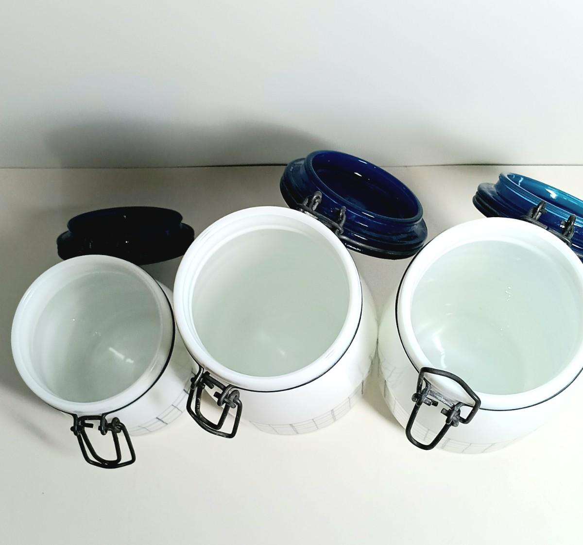 LOT 178L: Vintage Milk Glass Cannister Set w/ Enamelware & Vintage Aprons