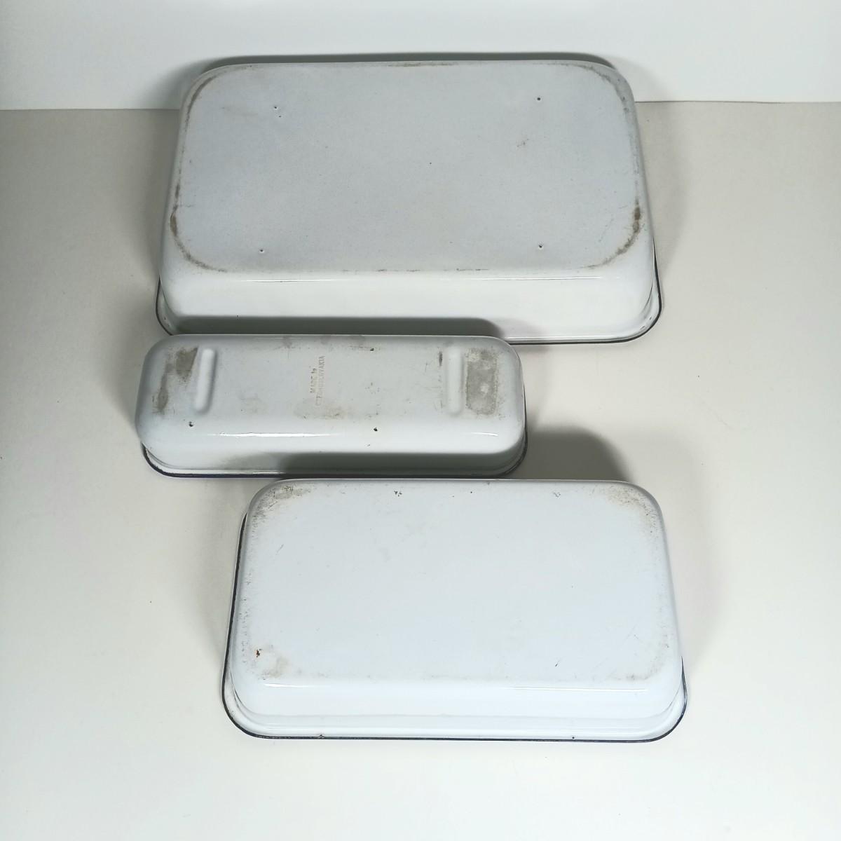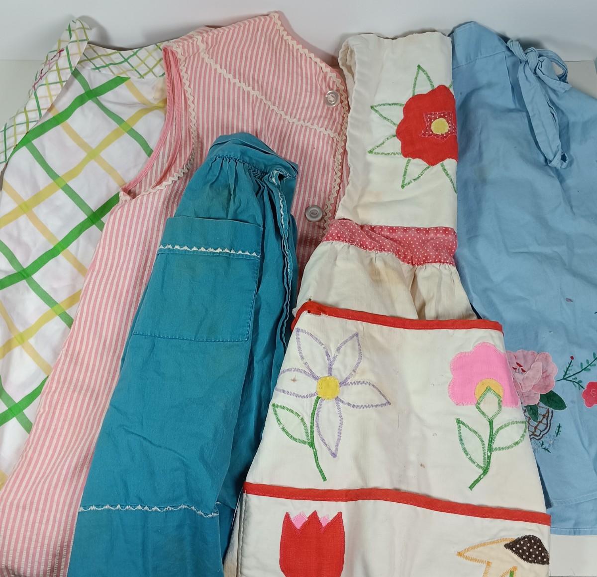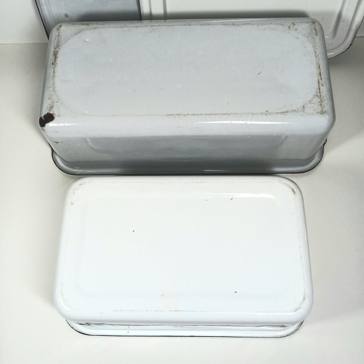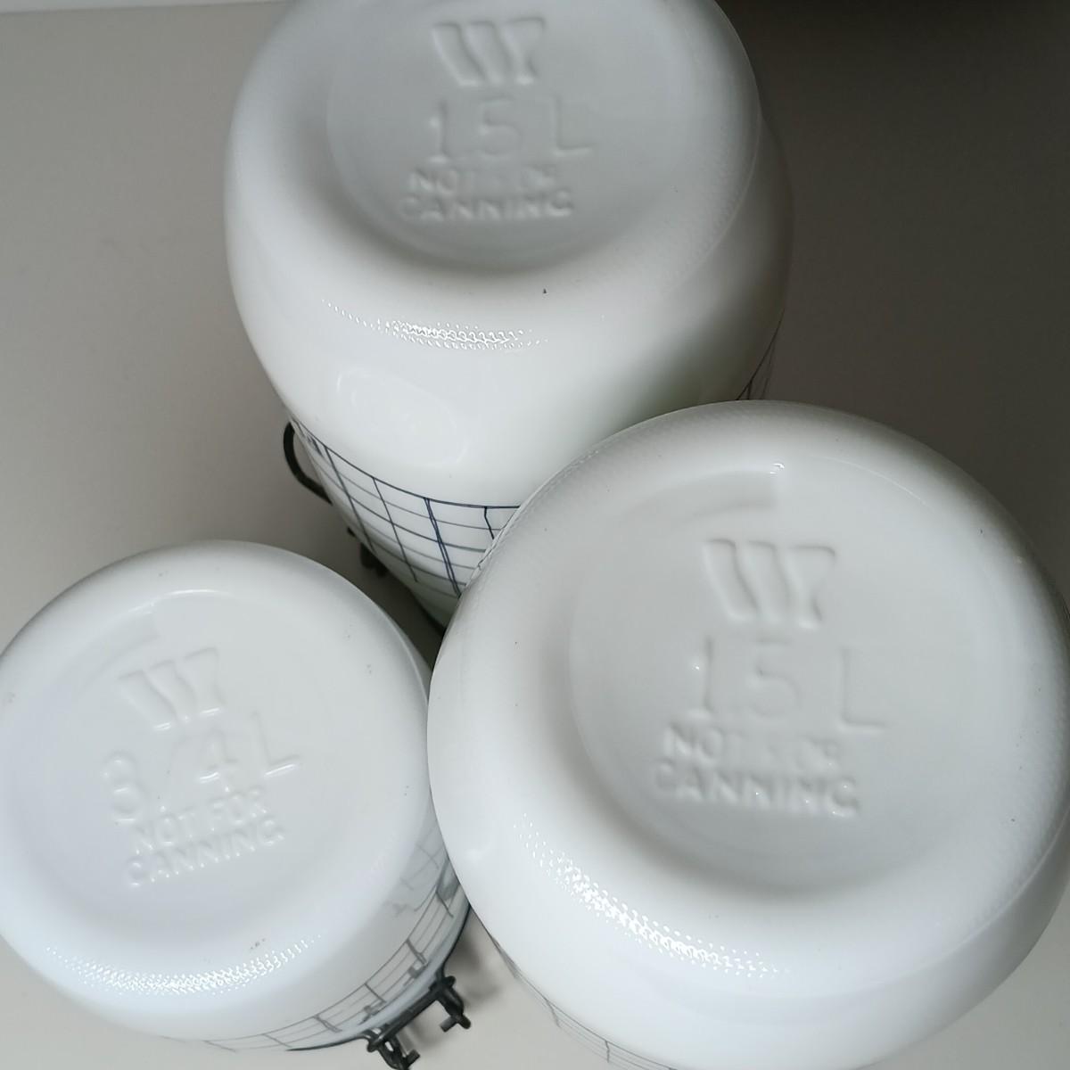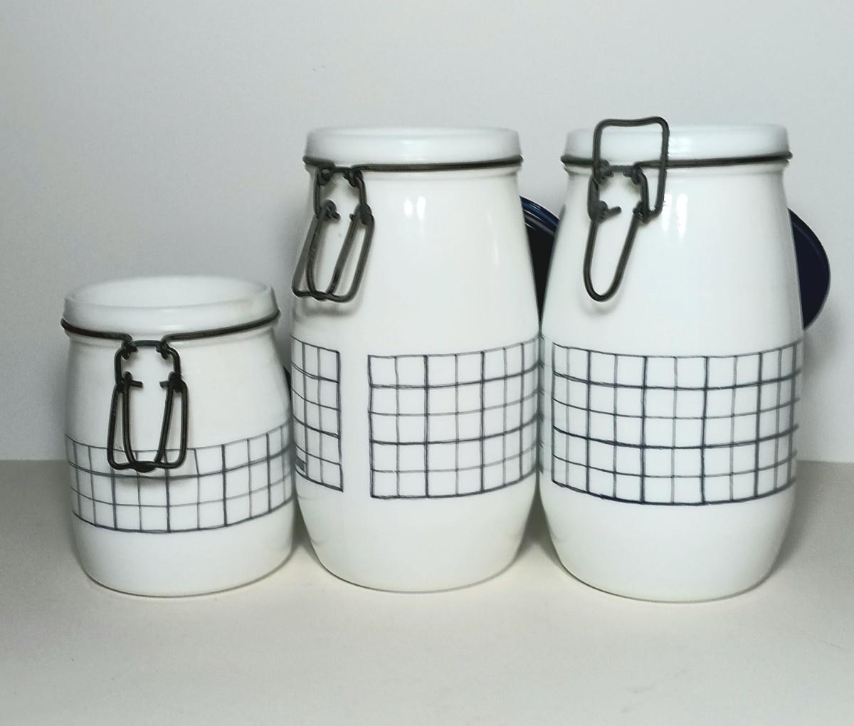 LOT 178L: Vintage Milk Glass Cannister Set w/ Enamelware & Vintage Aprons