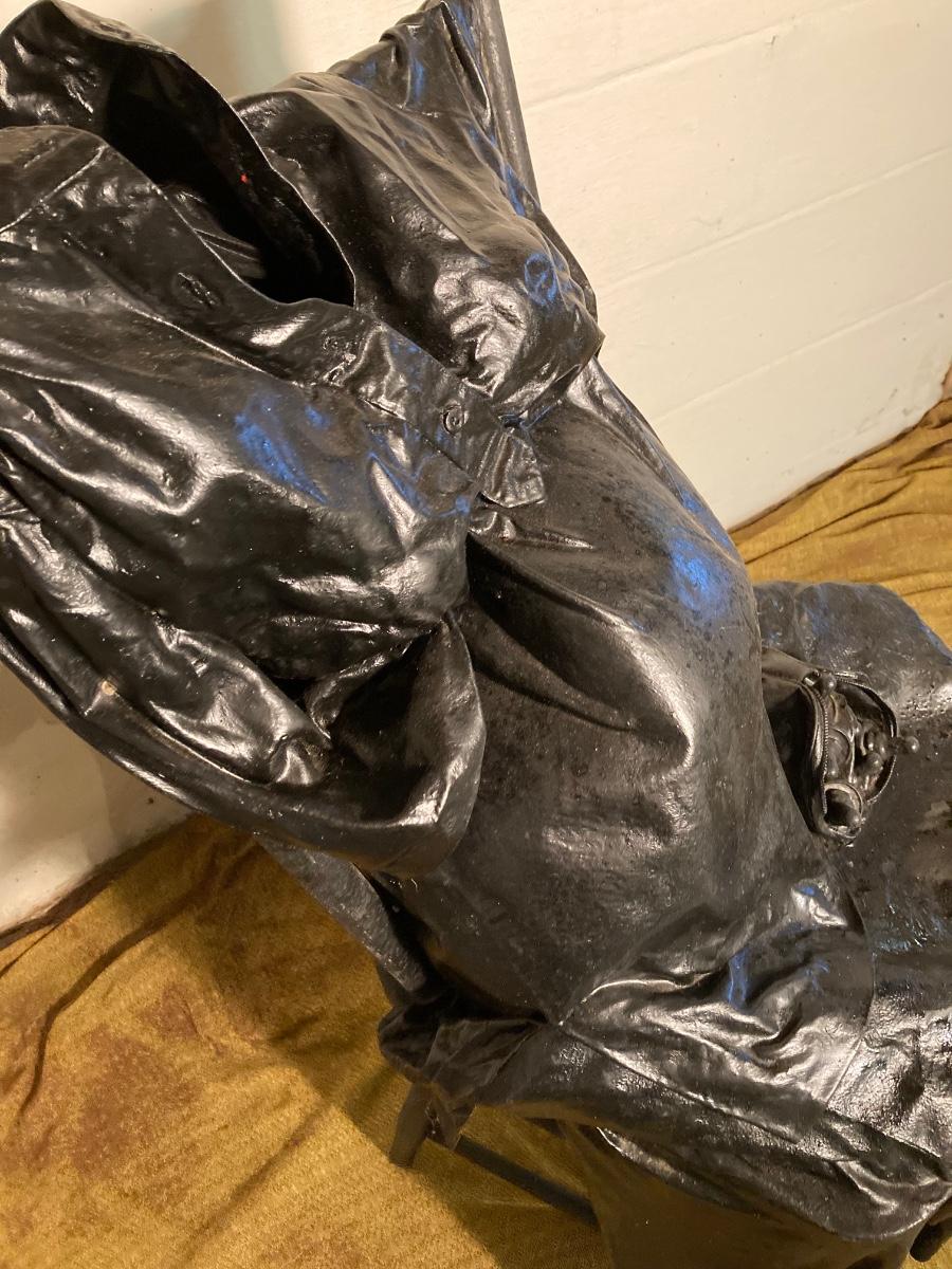 The exact composition of the sculptures is unknown. Some appear to be actual articles of clothing while others may be cloth which has been hardened then painted. They are life-size, lighter in weight.