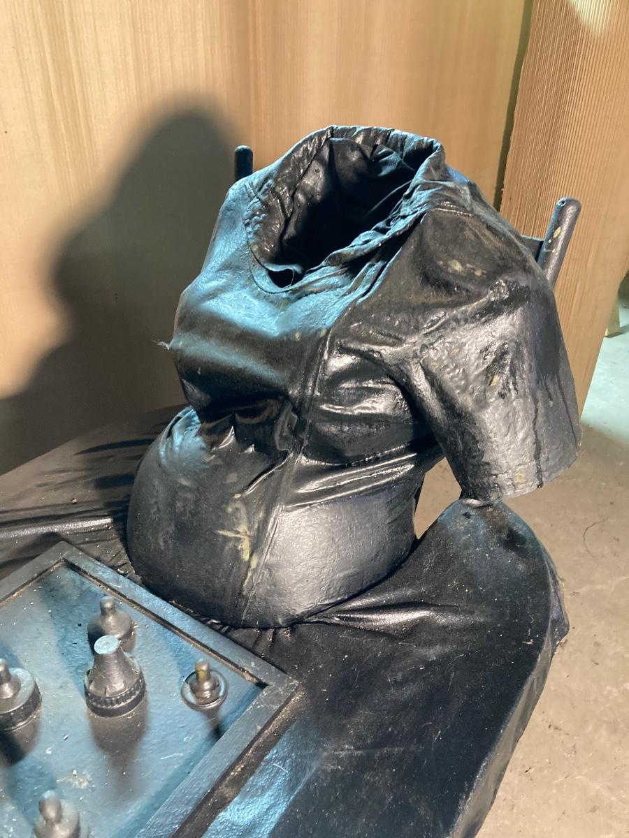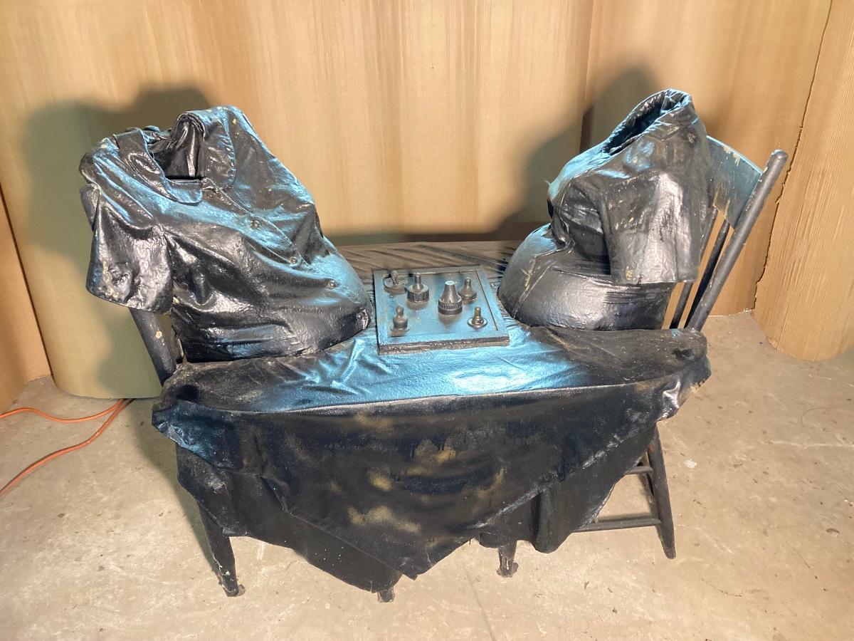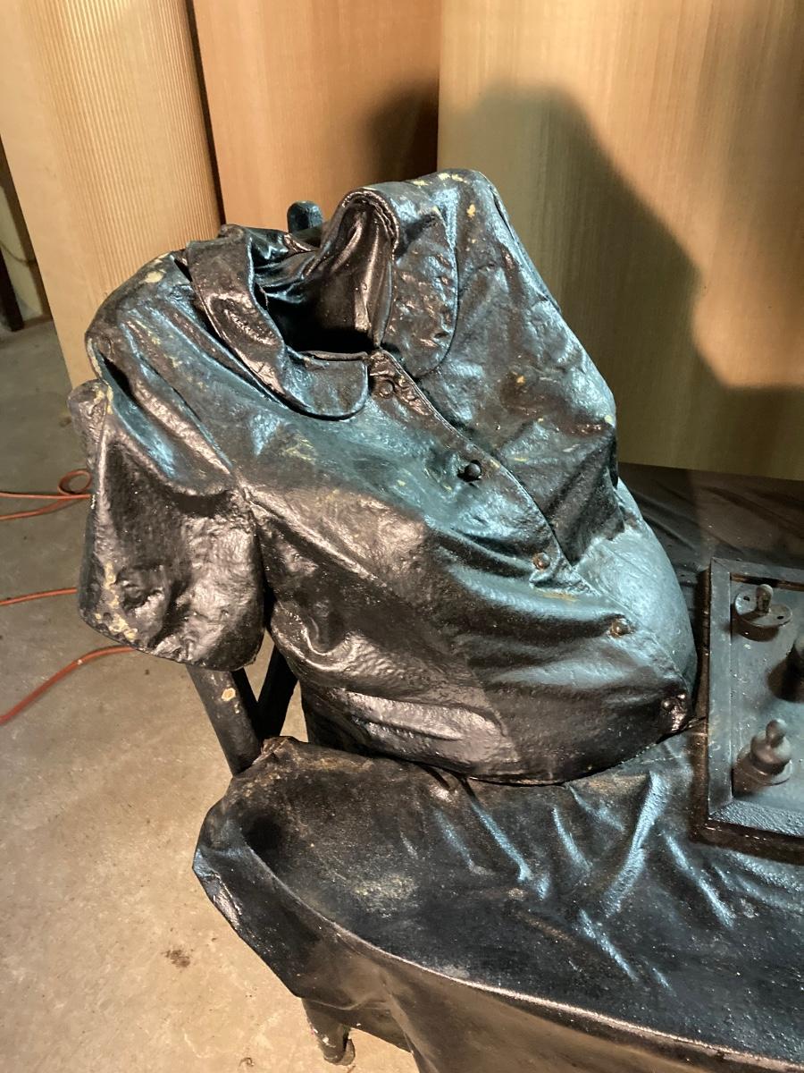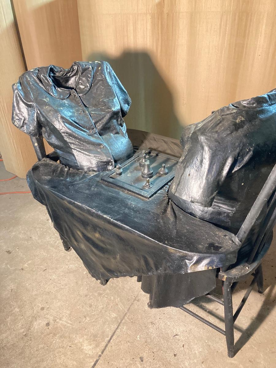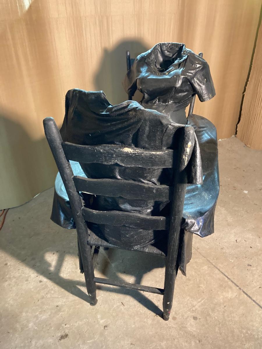 The exact composition of the sculptures is unknown. Some appear to be actual articles of clothing while others may be cloth which has been hardened then painted. They are life-size, lighter in weight.