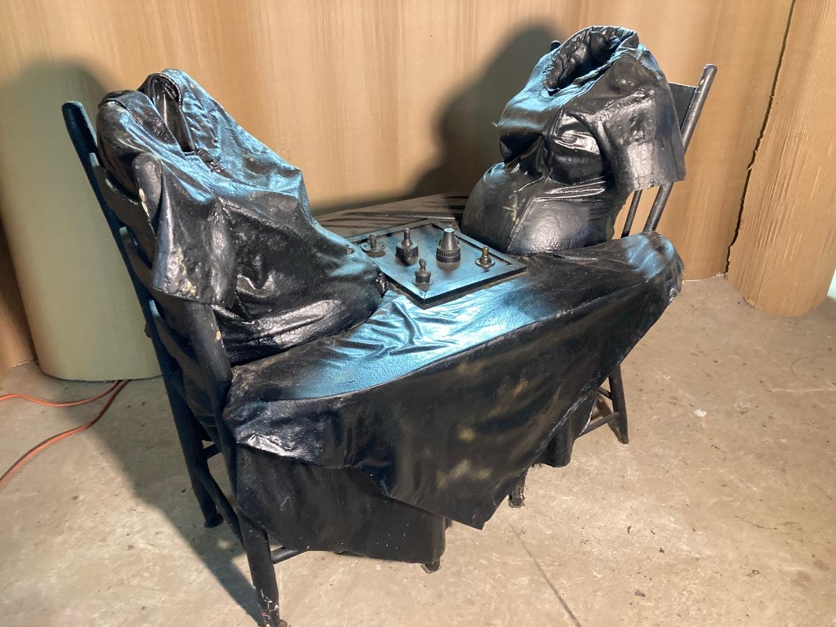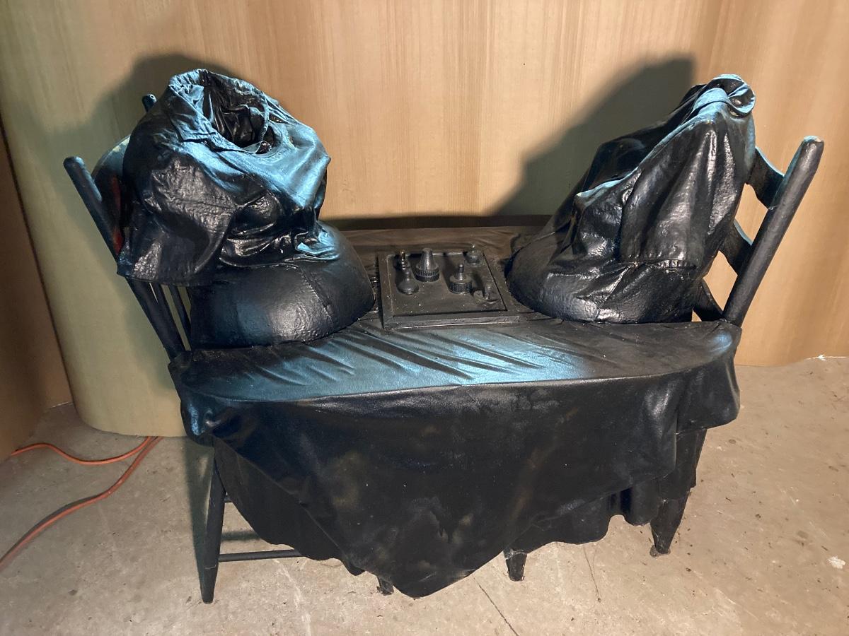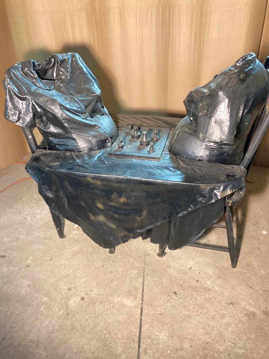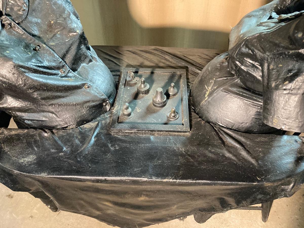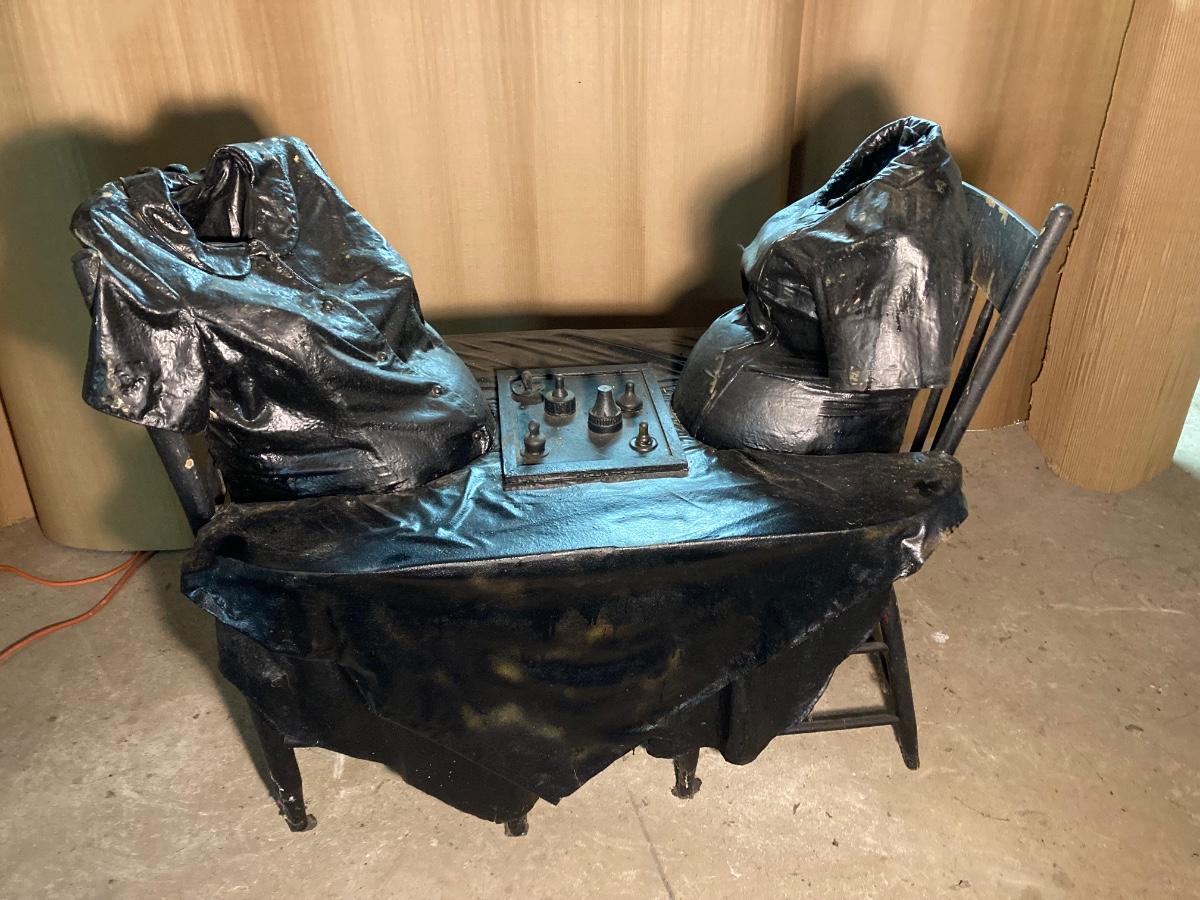 The exact composition of the sculptures is unknown. Some appear to be actual articles of clothing while others may be cloth which has been hardened then painted. They are life-size, lighter in weight.