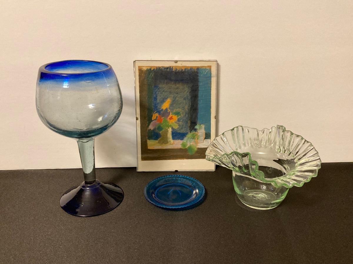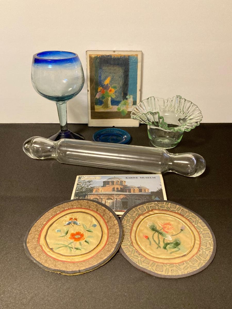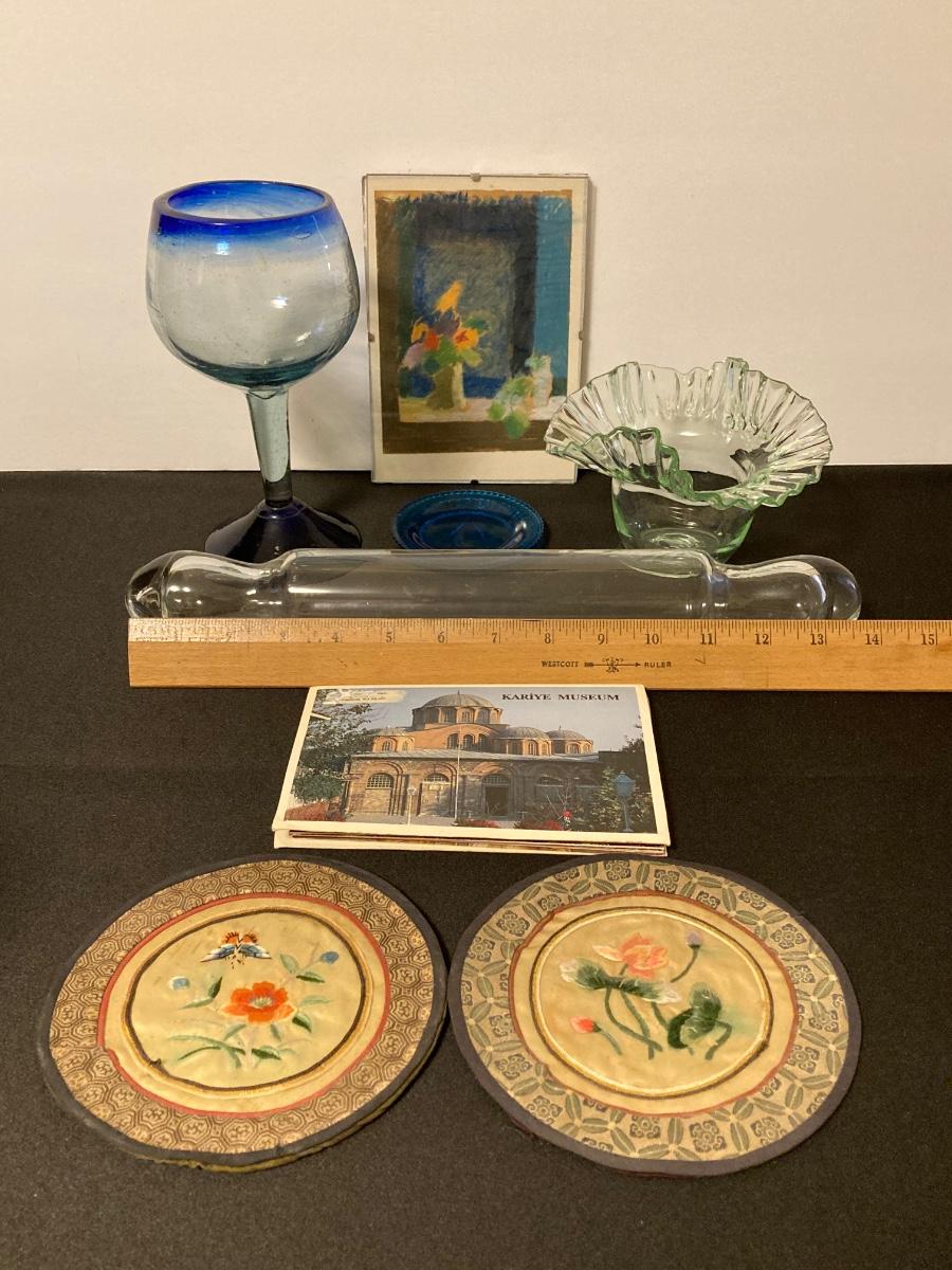 LOT 221F: Hand Blown Rolling Pin, Candy Dish & Wine Glass, Vintage Marble Candle Stick & More