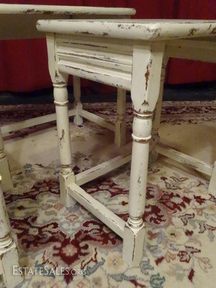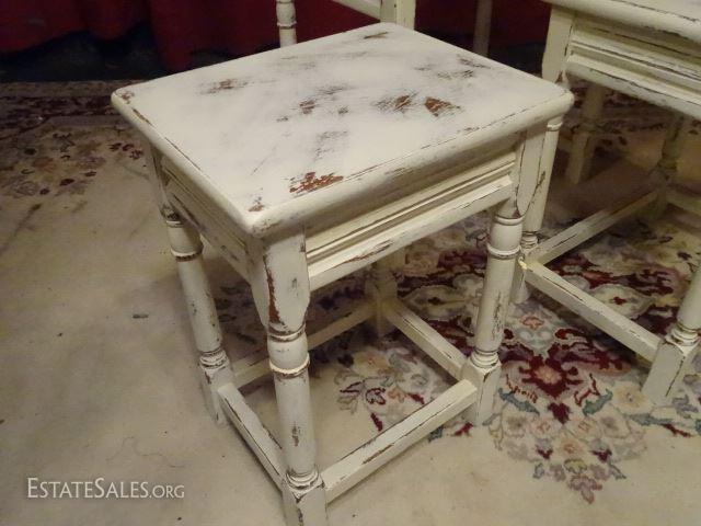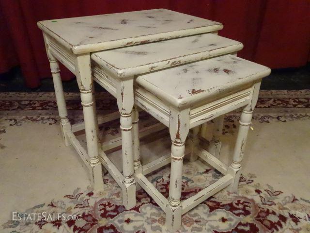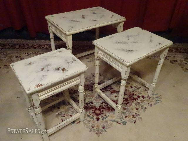LOT 97B: 3 PC STACKING TABLE SET, DISTRESSED WHITE PAINTED FINISH