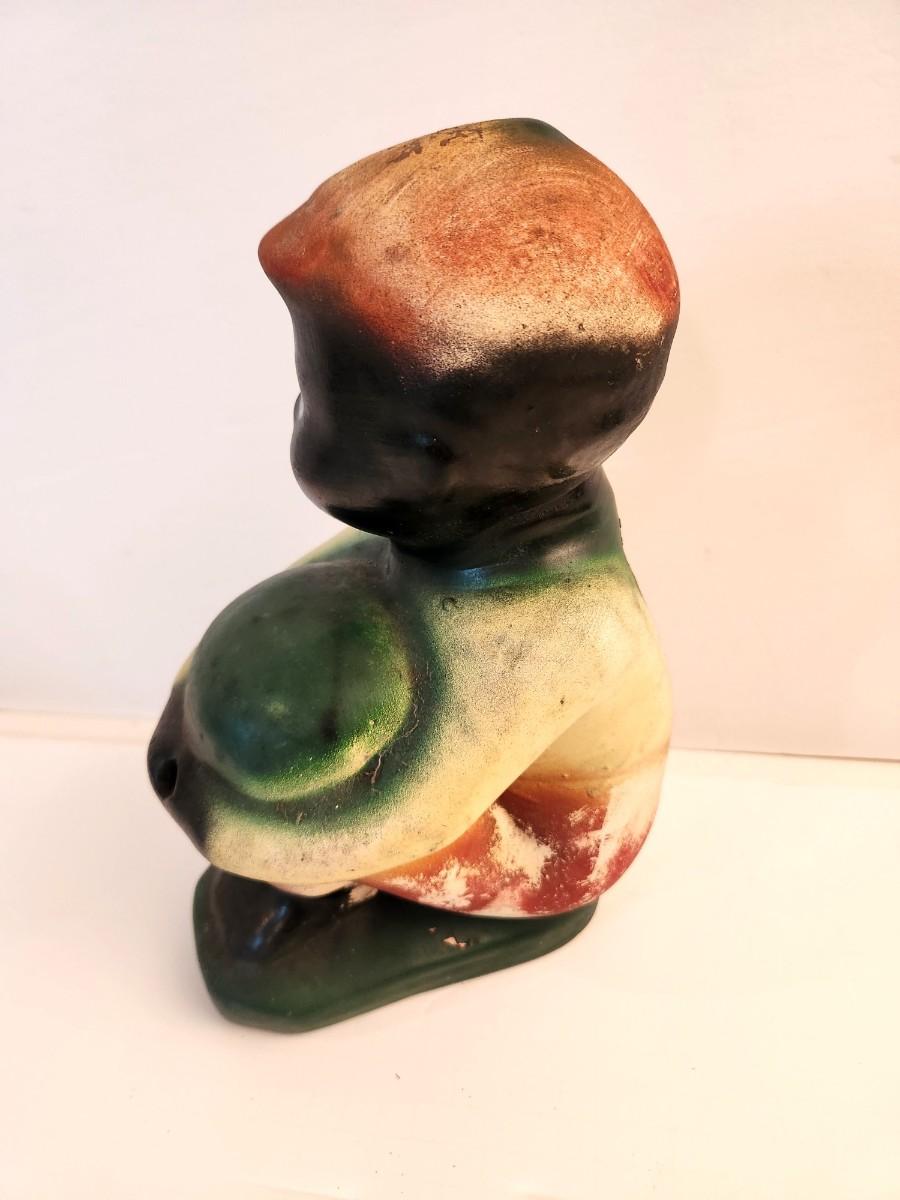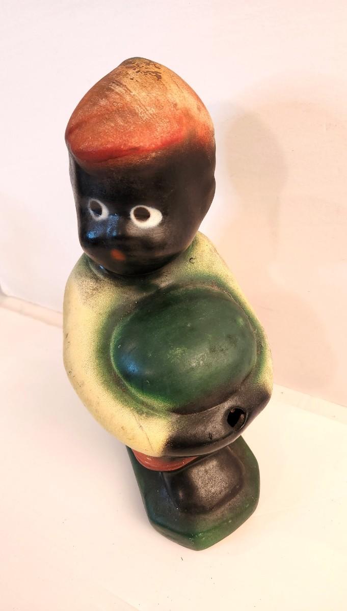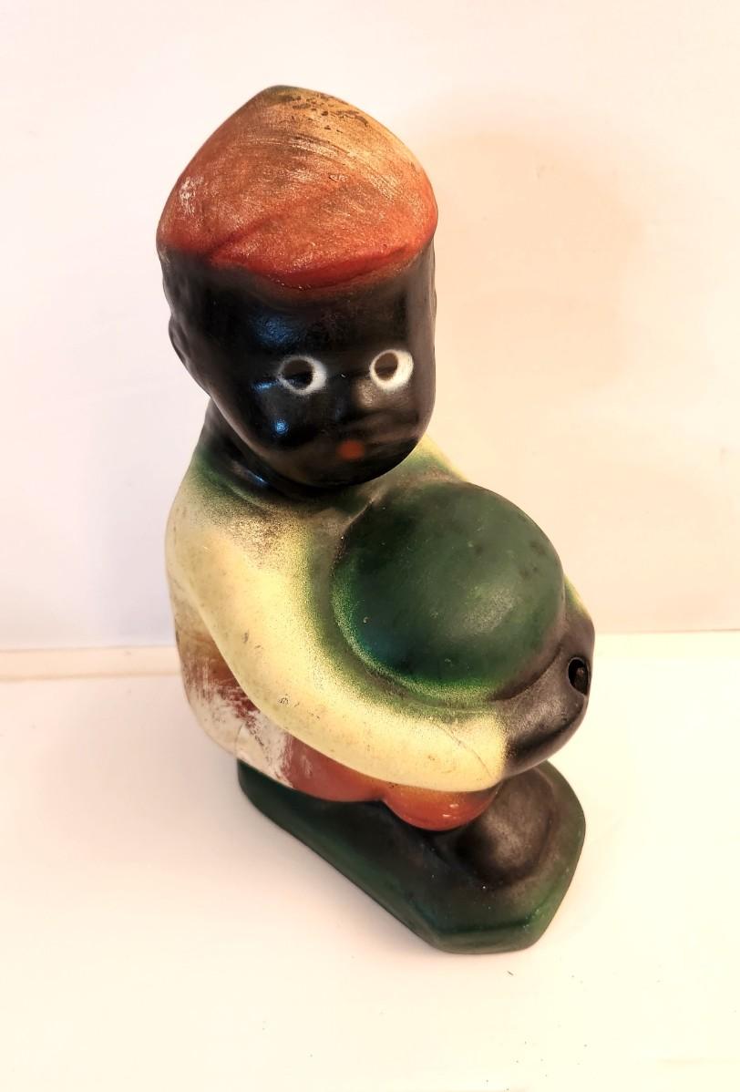 Chalkware Black Americana - little fisherman is missing his pole, but the hole is there - easy replacement. Would look so cute in your garden or in a birdbath or fish pond. 11" tall, 6" across - Good antique condition. Scarce.