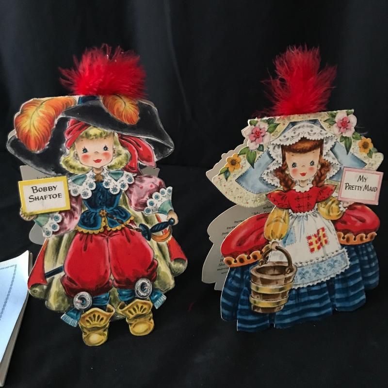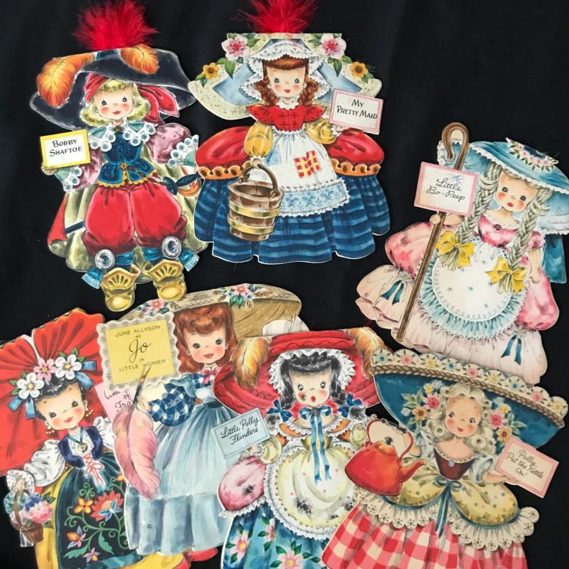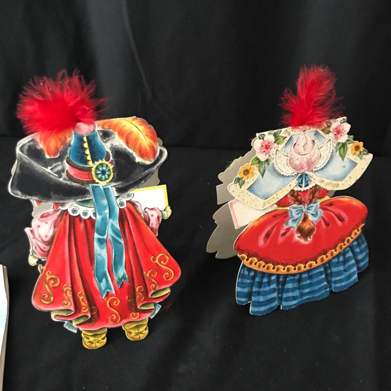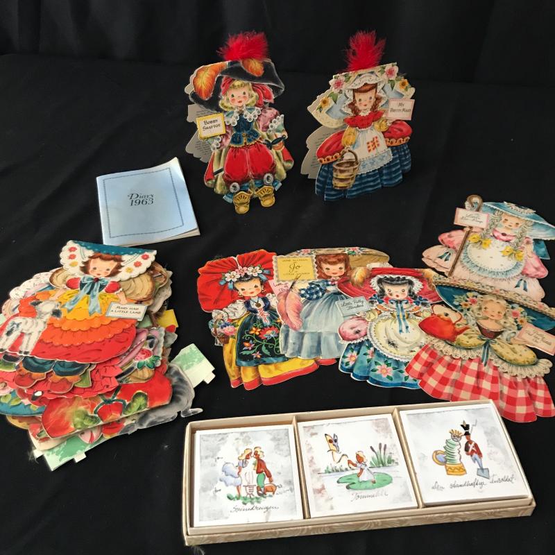 Approximately 23 paper doll cards that can stand or lay. Front and back of each Doll on cards with a story about them inside. Some have feathers intact. Lot also includes 6 handpainted coasters from Denmark in box, as well as a petite blank Diary from 1963. Shipping available.