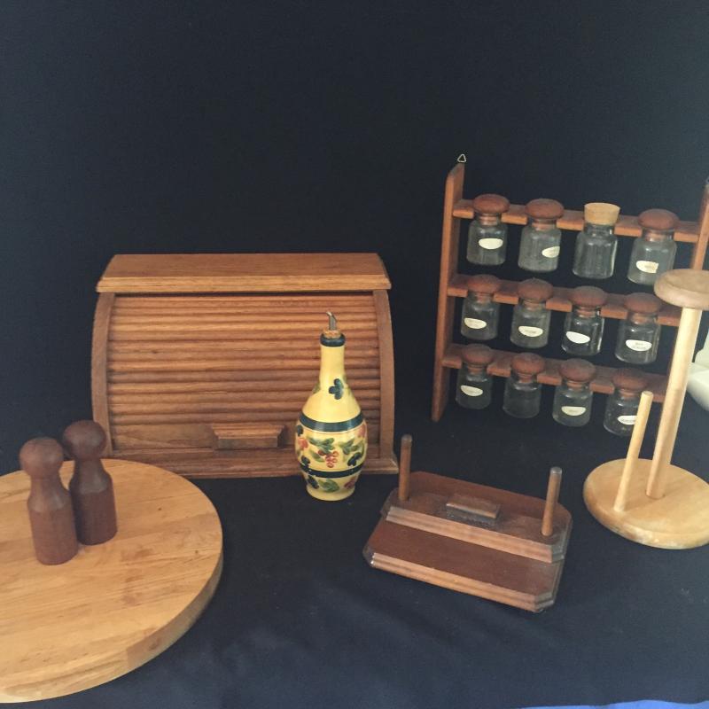 Array of Kitchen Accessories. Roll top Bread box,Napkin Holder,Paper Towel Holder,Spice Rack and More. Spice Rack Measures 14” x 16” x 3”. And is missing one top-See Pictures.