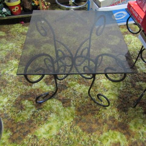 IRON BASE GLASS TOP TABLE AND A WOODEN SHELF