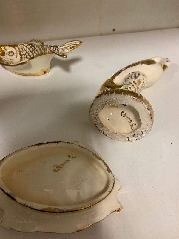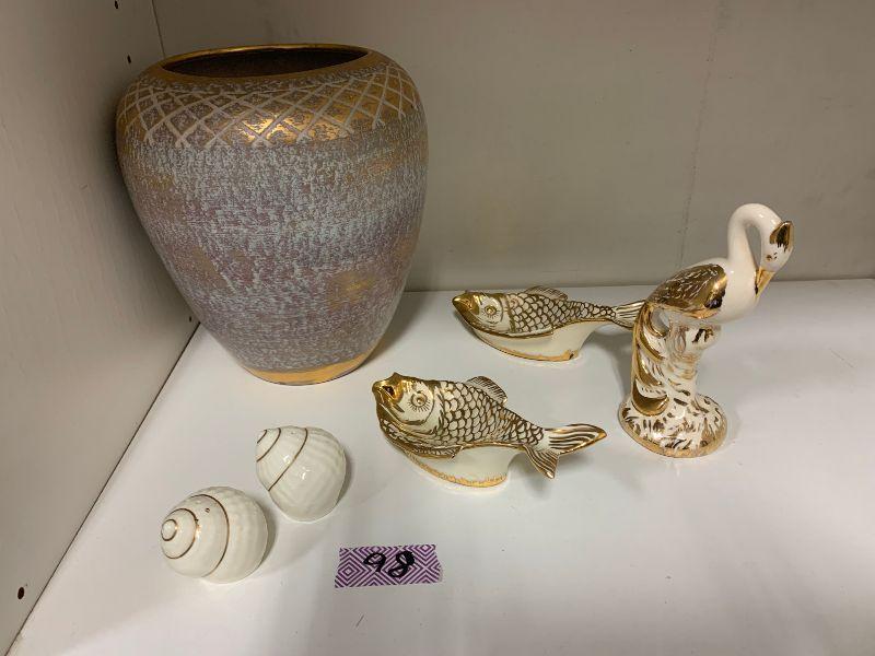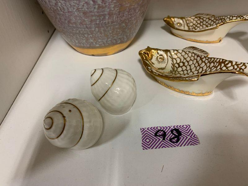 2 fish dishes, 1 salt and pepper, vase and a bird all with gold accents