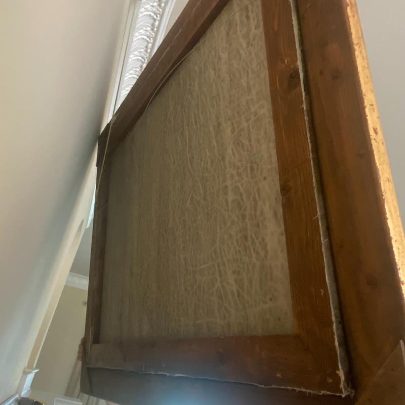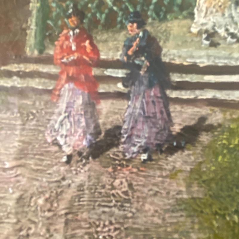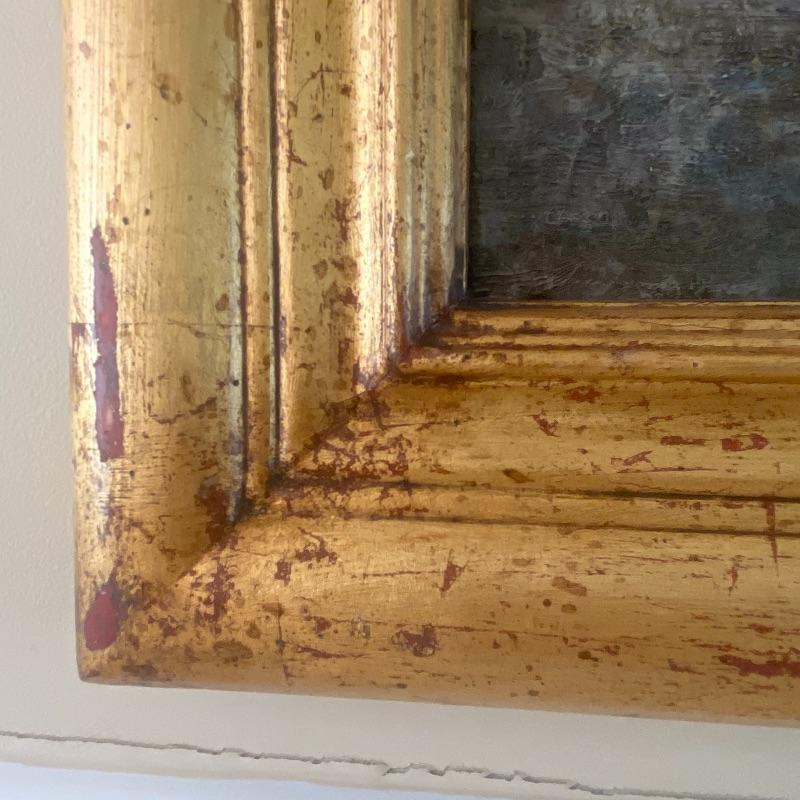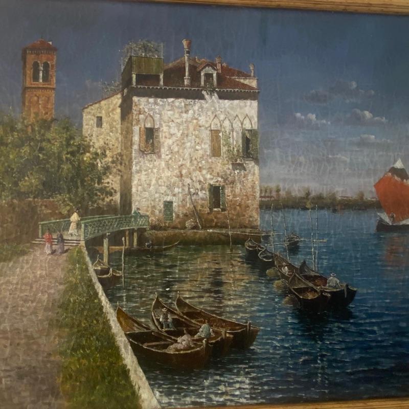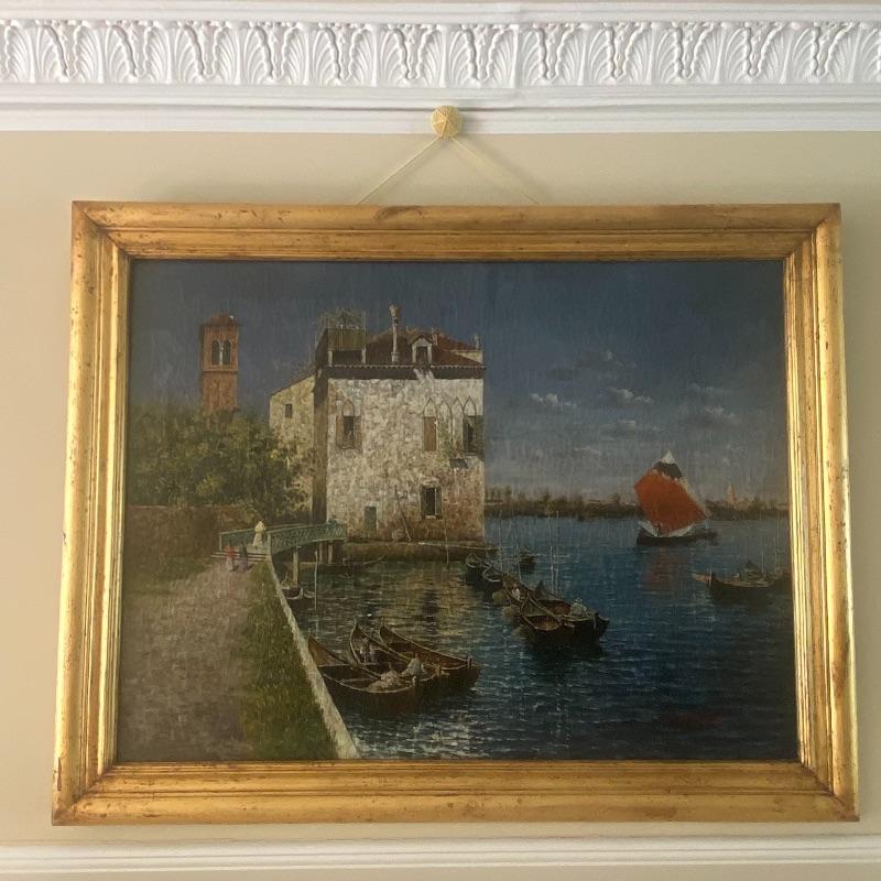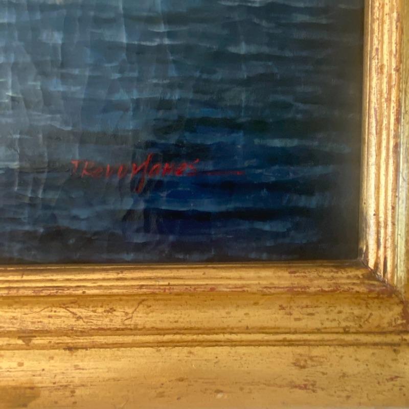 Large signed Trevor James art on a hand-stretched canvas will make a stunning impression on any wall. Oil painting shows signs of aging with paint cracks. Art is enclosed in a gorgeous golden painted frame. Measuring out to be approximately 46”x36”. See photos. Local pickup only.