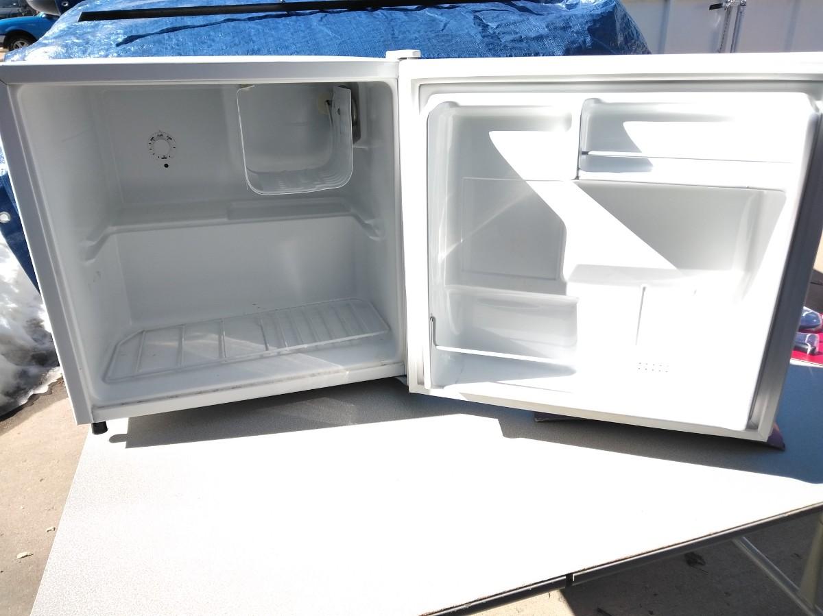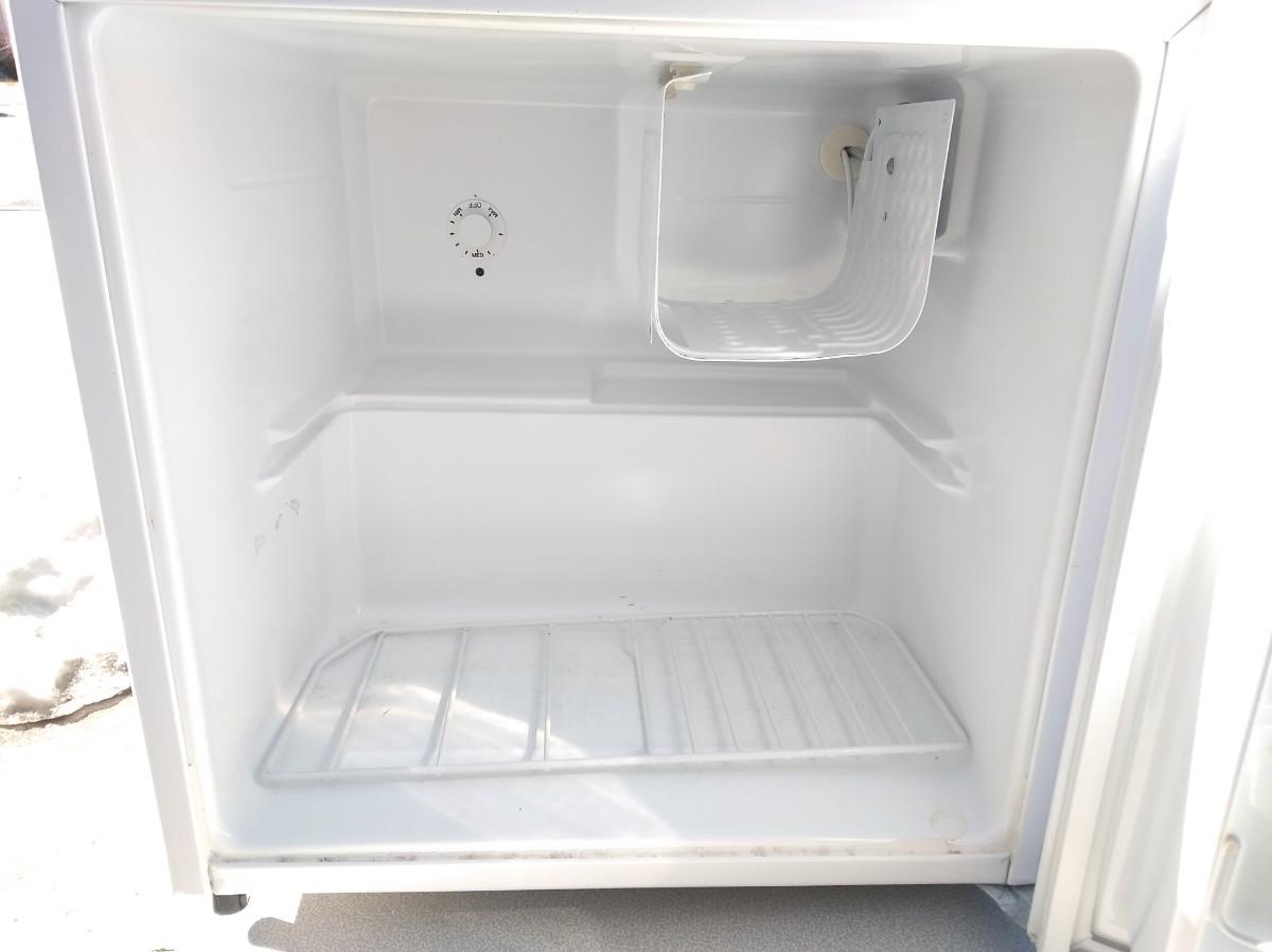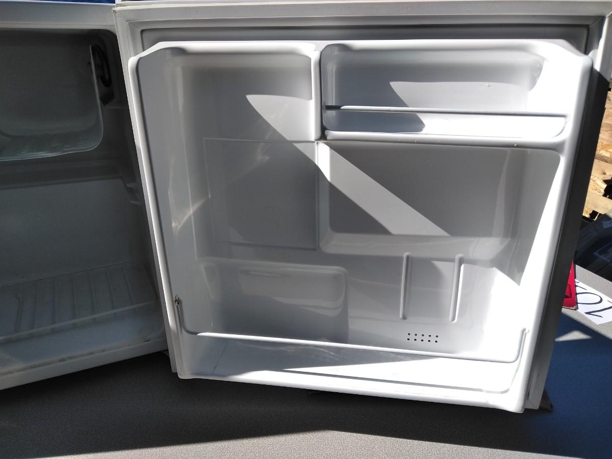 SMALL FRIDGE WITH SOME STICKERS ATTACHED AND MISSING THE WIRE RACK