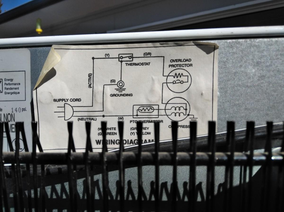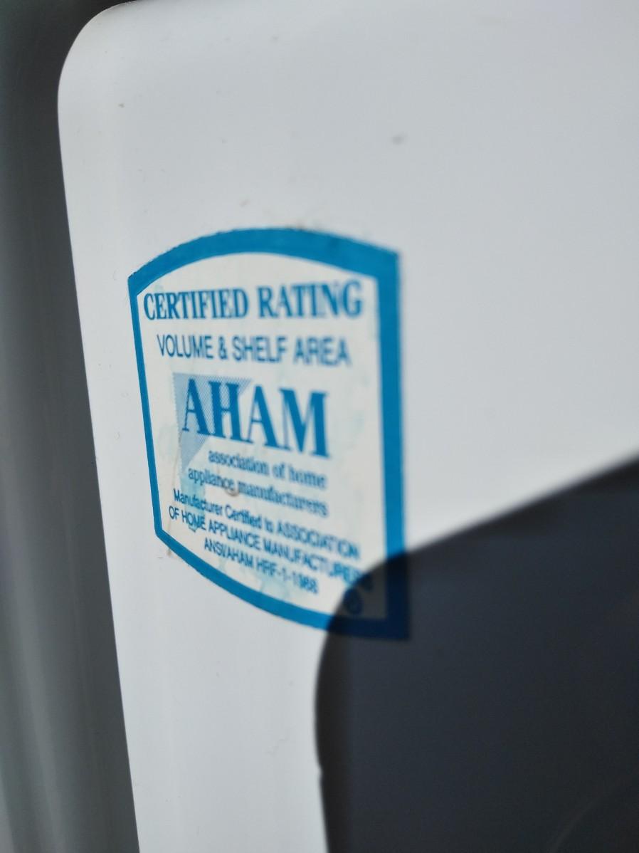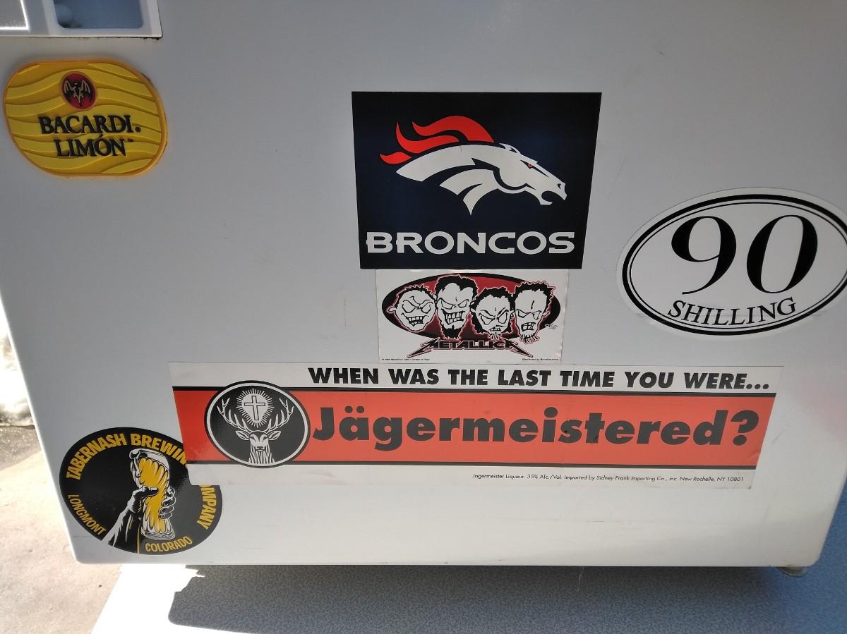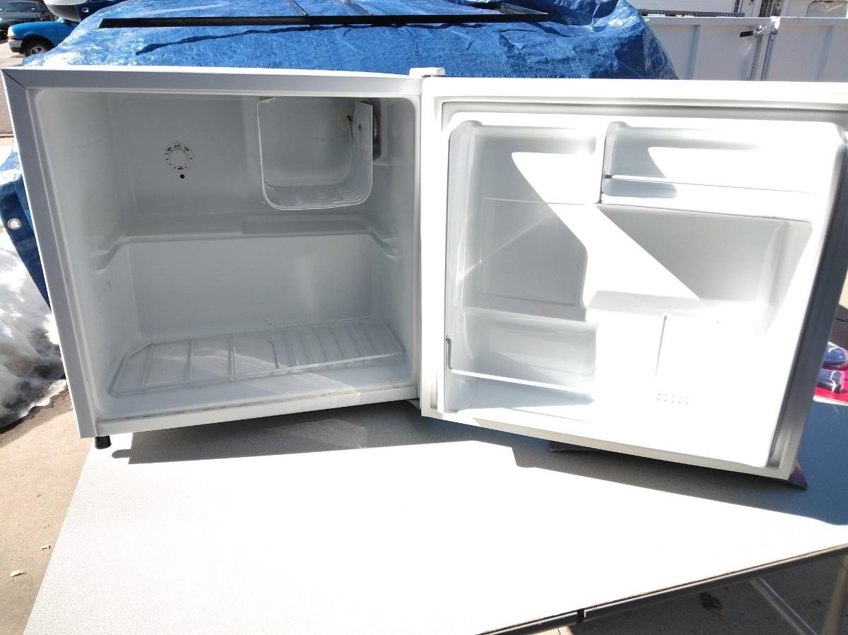 SMALL FRIDGE WITH SOME STICKERS ATTACHED AND MISSING THE WIRE RACK