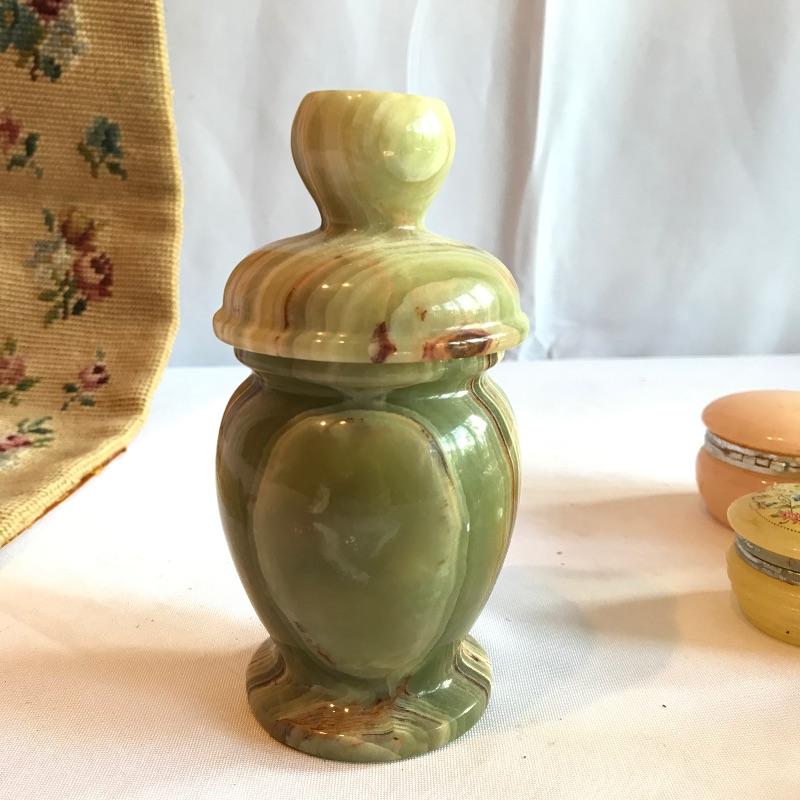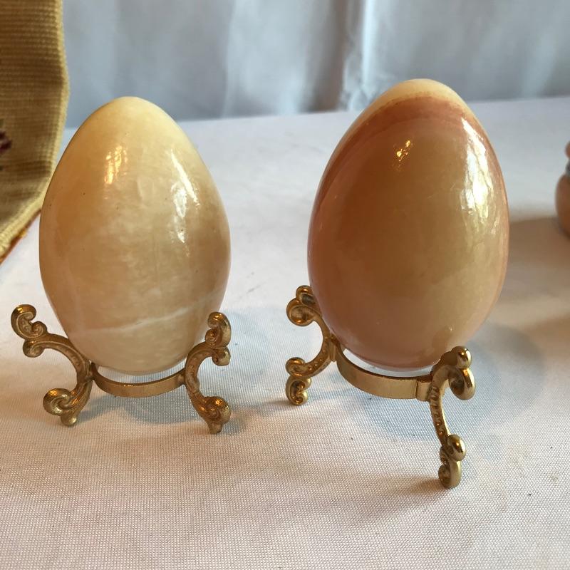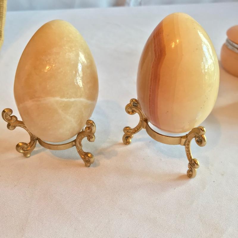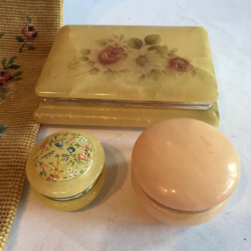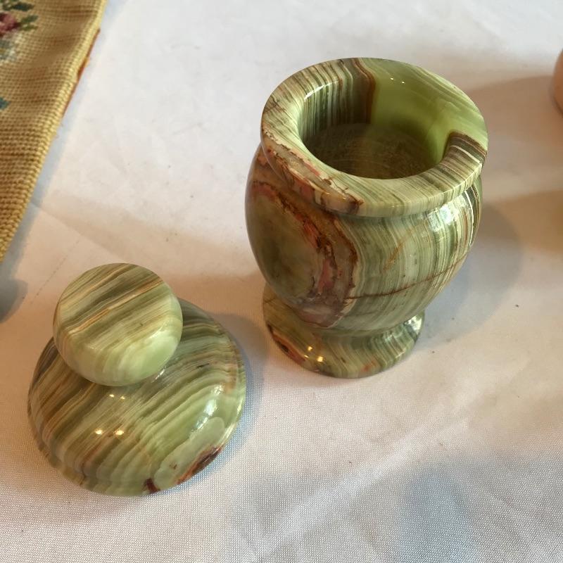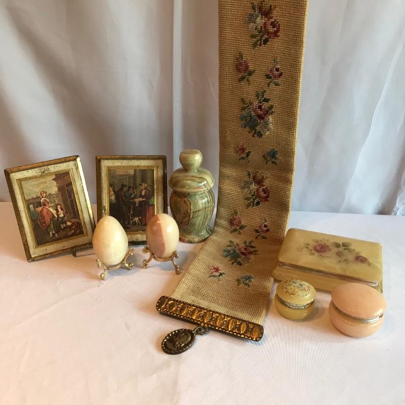 Sweet and delicate is how to describe this collection. Three pretty vanity boxes, two marked alabaster and the third appears hand painted. The smallest is 1.75”d and the larger rectangular box is 5.75” x 4” x 1.75”. Lot also contains two 3” stone eggs similar to alabaster or marble. The color of the eggs were difficult to capture. The images appear slightly off, the egg on the left side of the image is actually an ivory-pearled marble color, while the one on the right is a soft pink, with a darker mauve stripe and peachy-ivory. Come to the preview and see these beauties first hand! Each egg has a gold colored metal stand. Our final carved beauty is a natural wonder. The urn appears to be marble with pinks and oranges throughout its olive green body. The images make the piece look cracked, but the piece is smooth with no actual cracks found. This lot also features two old world style wood art measuring 4.25” x 5.5” and a long needlepoint banner perfect for the long skinny space needing some color. Piece measures 5.25” x 52.5”. See photos. Shipping available.