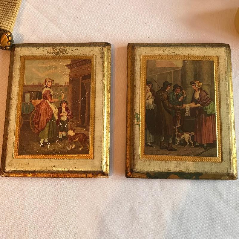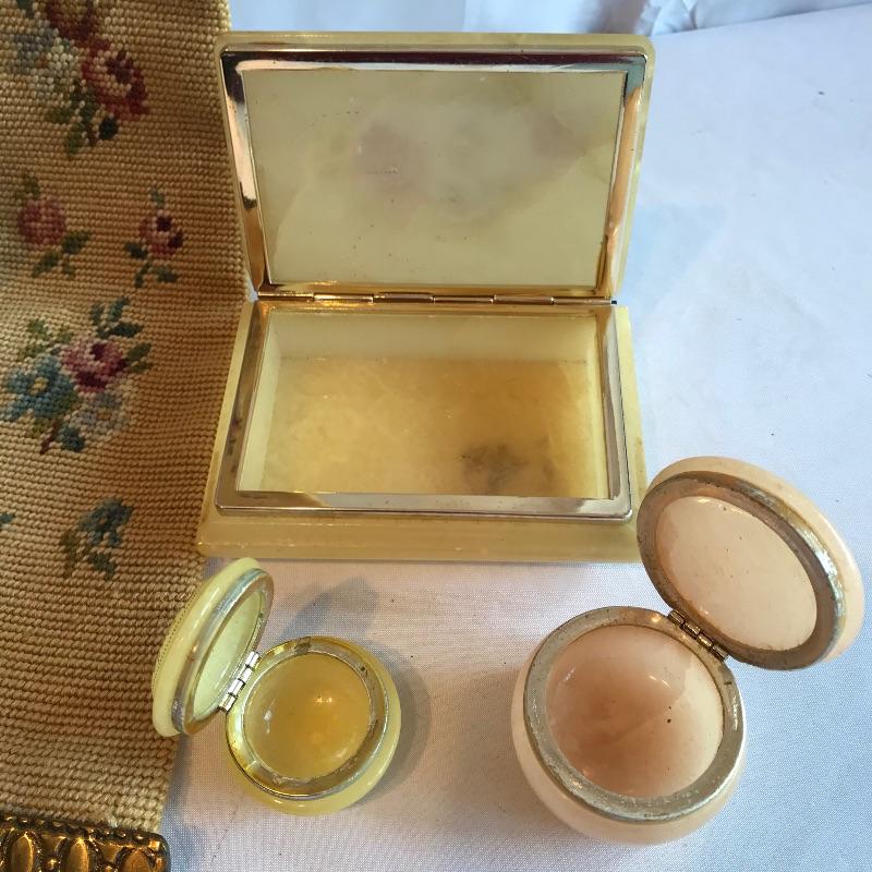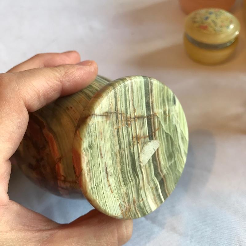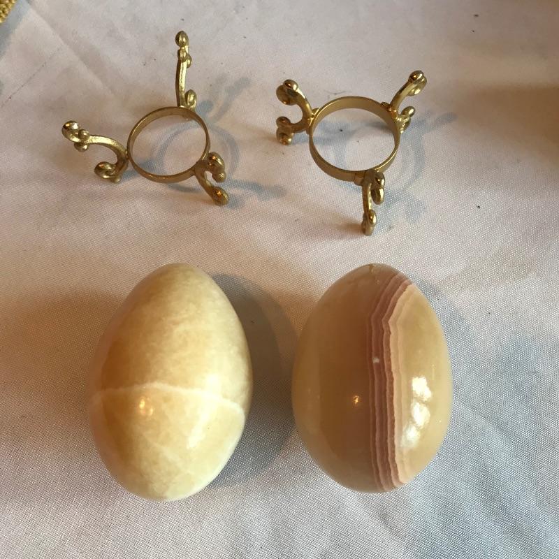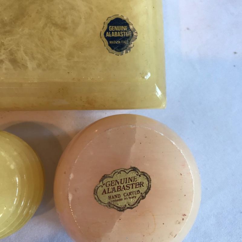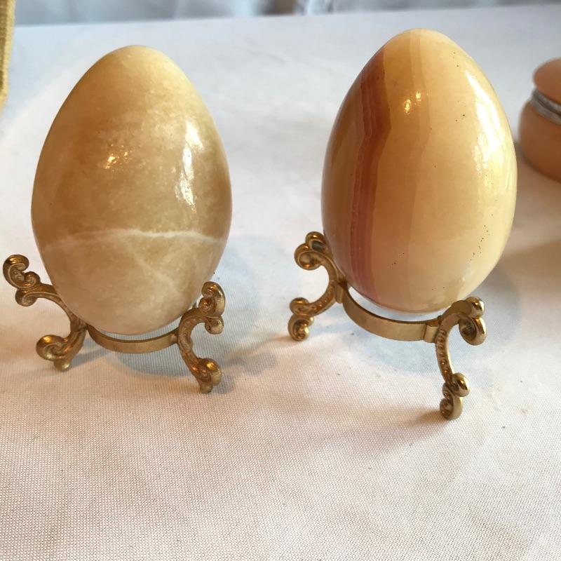 Sweet and delicate is how to describe this collection. Three pretty vanity boxes, two marked alabaster and the third appears hand painted. The smallest is 1.75”d and the larger rectangular box is 5.75” x 4” x 1.75”. Lot also contains two 3” stone eggs similar to alabaster or marble. The color of the eggs were difficult to capture. The images appear slightly off, the egg on the left side of the image is actually an ivory-pearled marble color, while the one on the right is a soft pink, with a darker mauve stripe and peachy-ivory. Come to the preview and see these beauties first hand! Each egg has a gold colored metal stand. Our final carved beauty is a natural wonder. The urn appears to be marble with pinks and oranges throughout its olive green body. The images make the piece look cracked, but the piece is smooth with no actual cracks found. This lot also features two old world style wood art measuring 4.25” x 5.5” and a long needlepoint banner perfect for the long skinny space needing some color. Piece measures 5.25” x 52.5”. See photos. Shipping available.