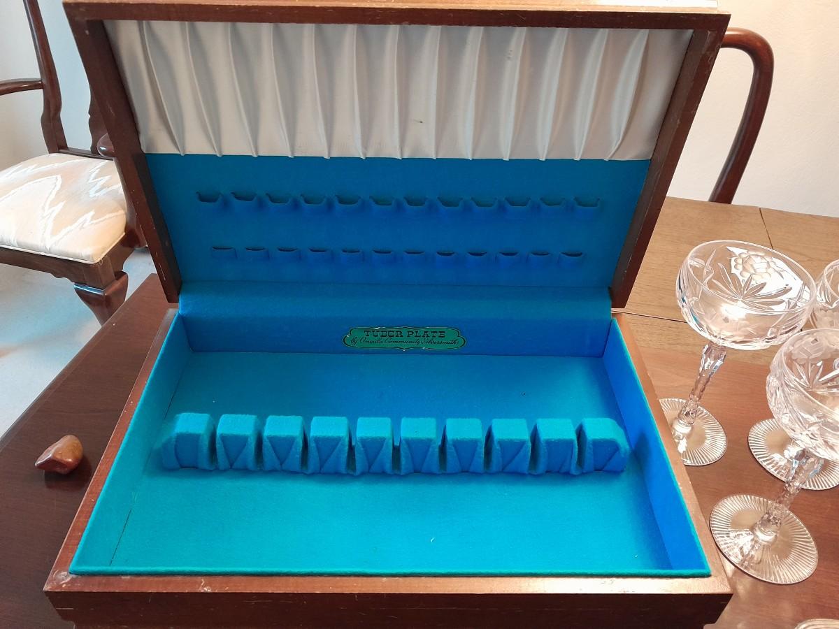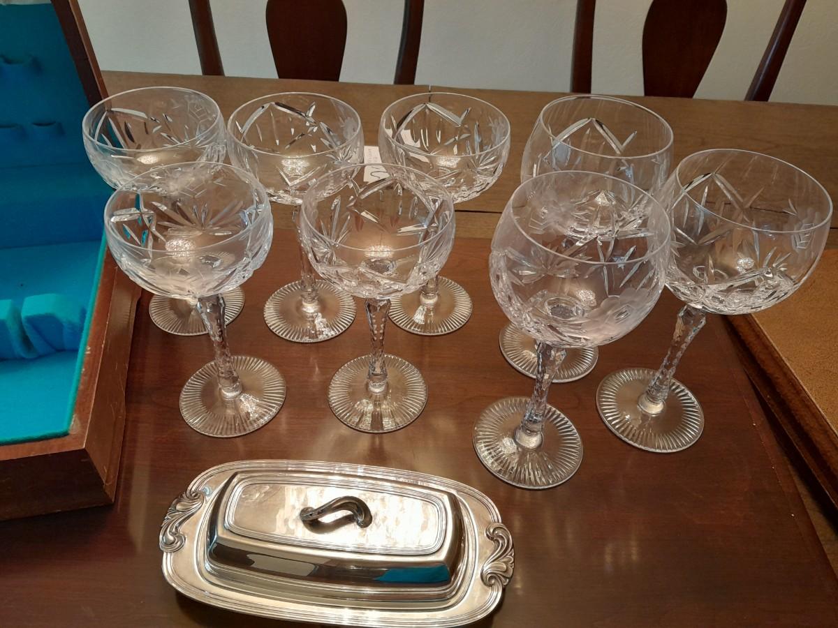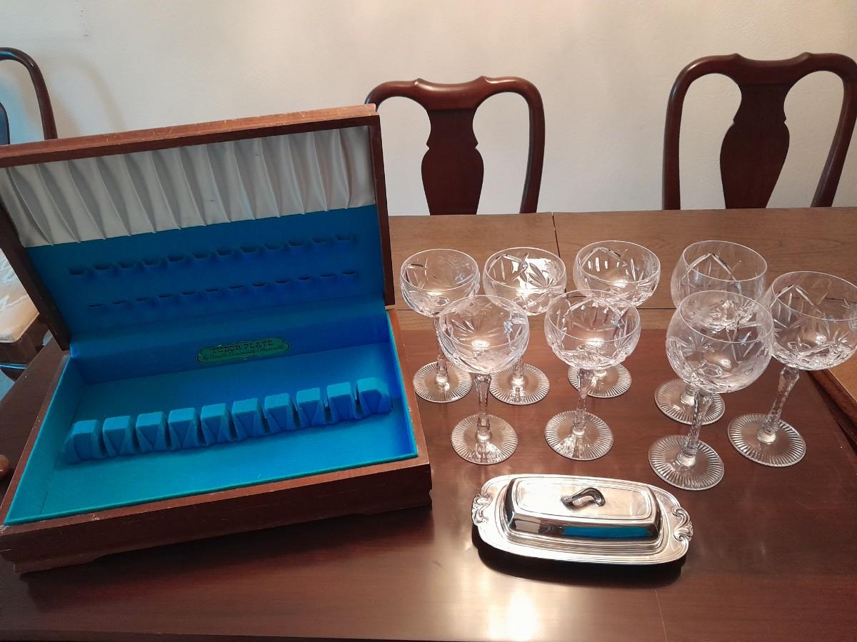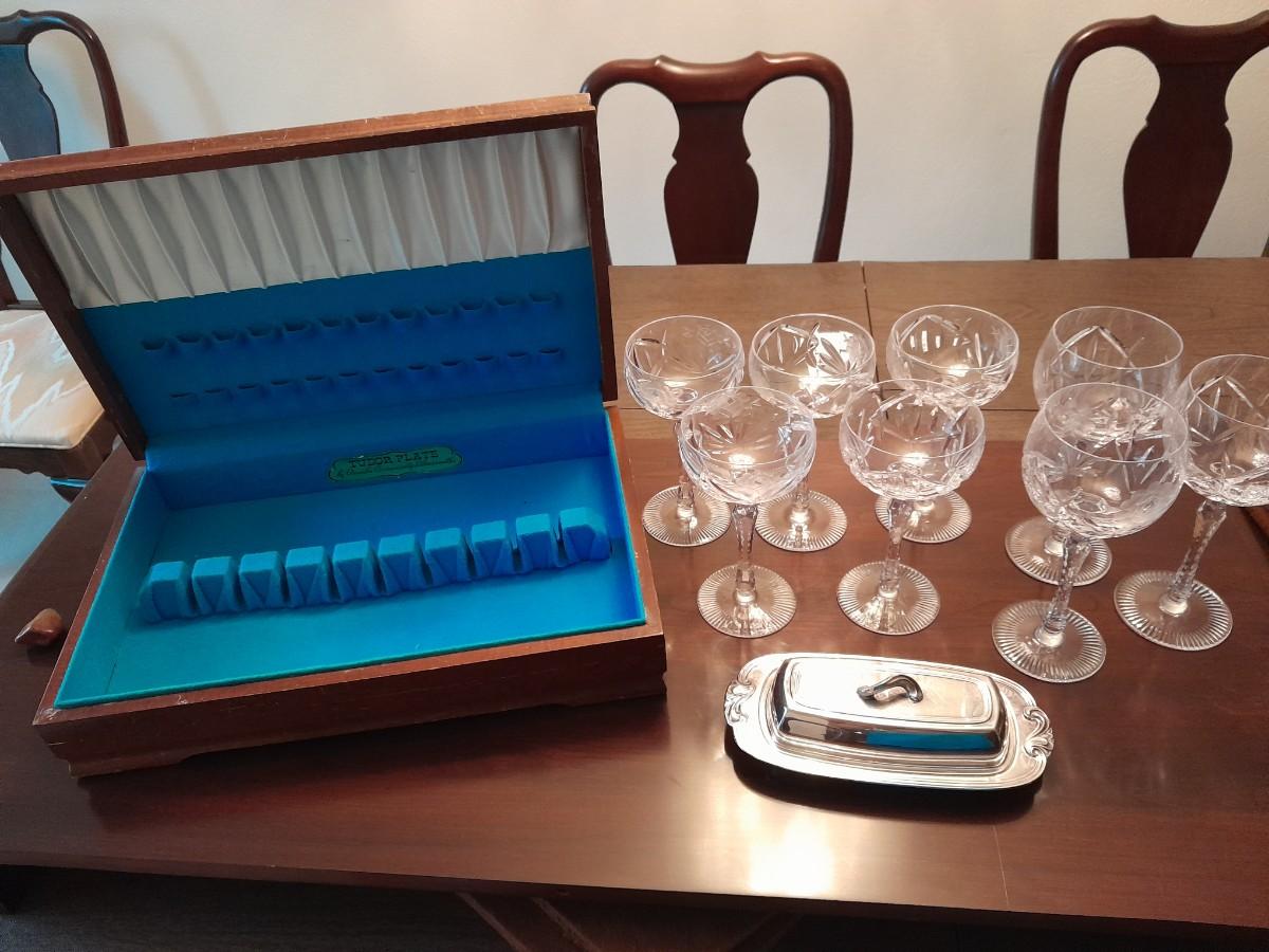 BEAUTIFUL STEMWARE GLASSES WITH WOODEN FLATWARE CHEST AND TUDOR PLATE BUTTER DISH