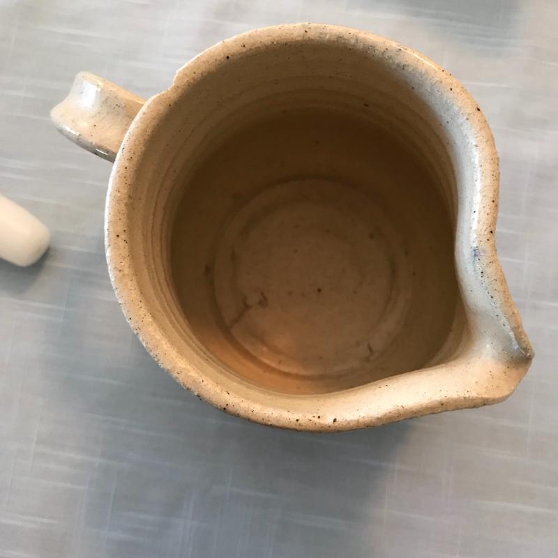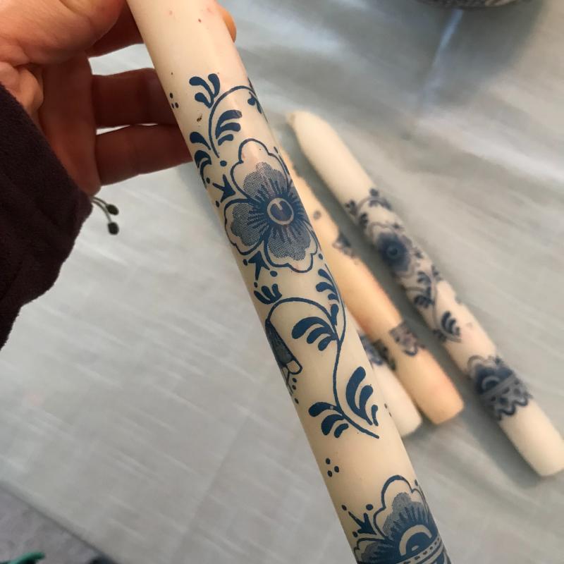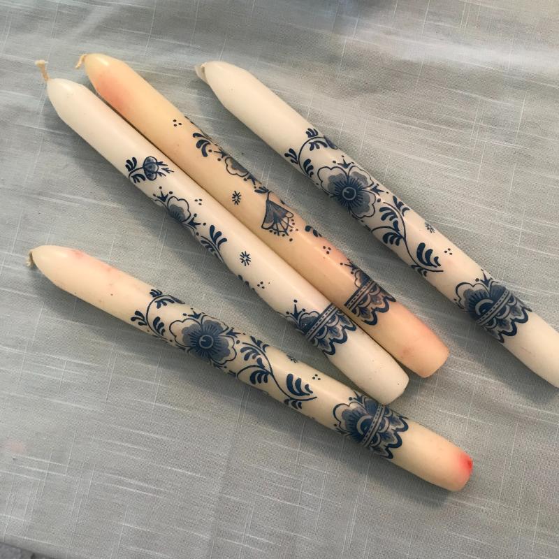 This lot includes three pitchers, one candle holder, and four candles. Largest pitcher is 6”tall x 10” wide across handle. Candles are 10” tall.