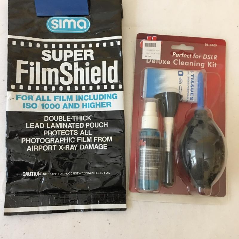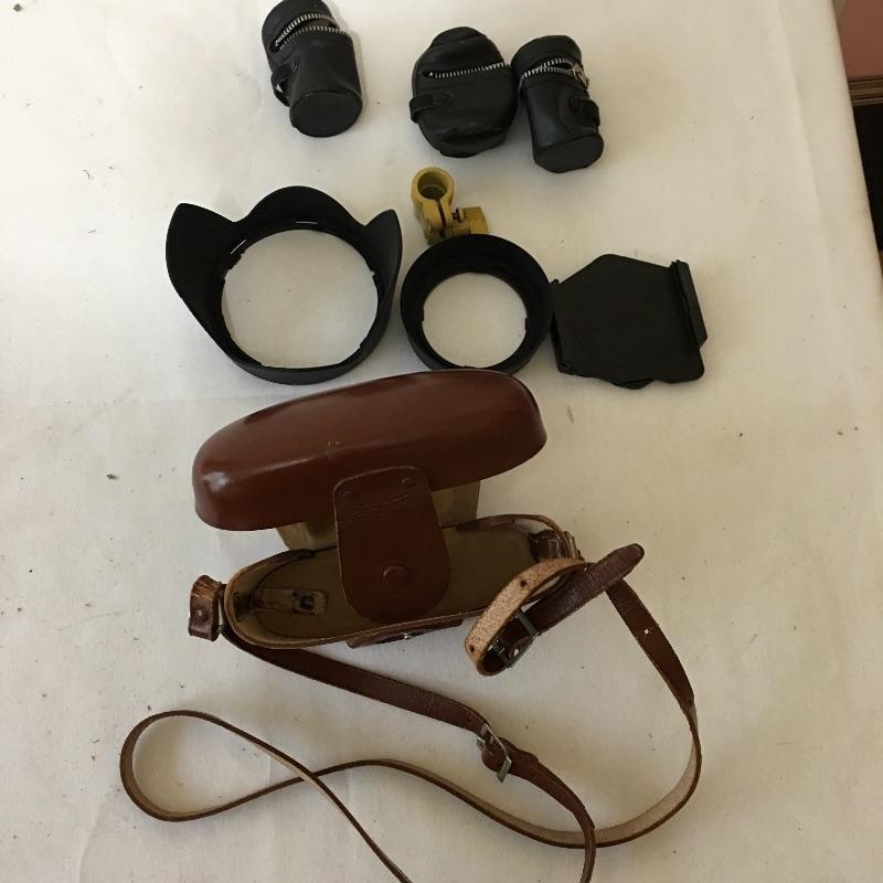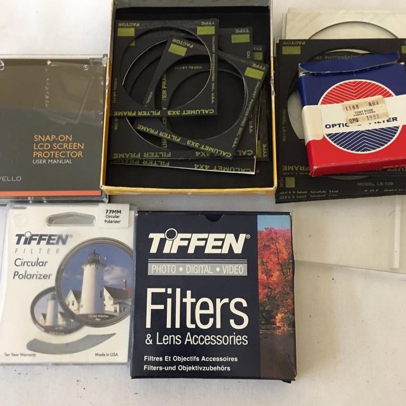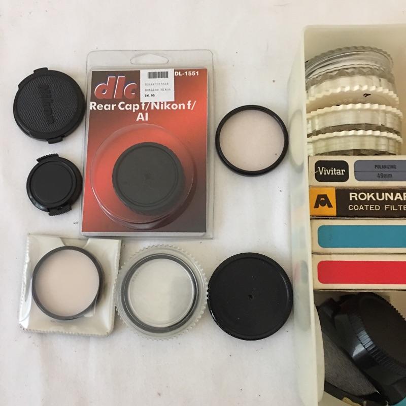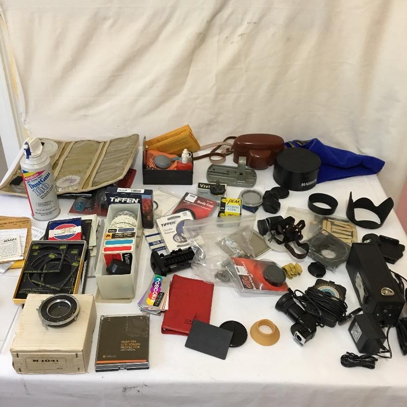 Large collection of camera accessories including filters, cleaning kit, cases, alcu- flash and more. A great assortment for the camera enthusiast.