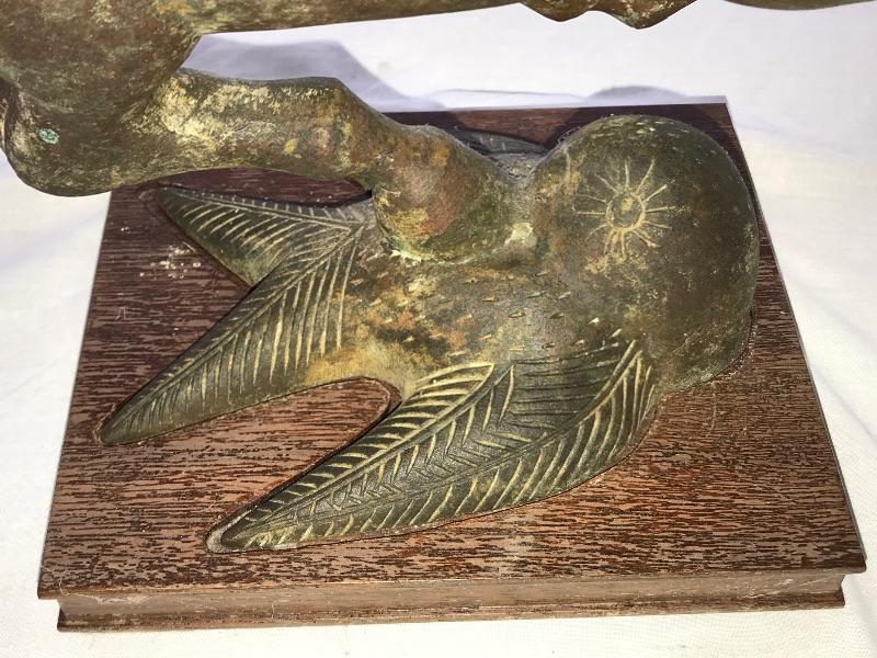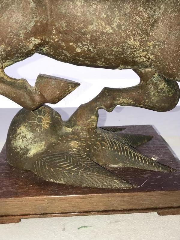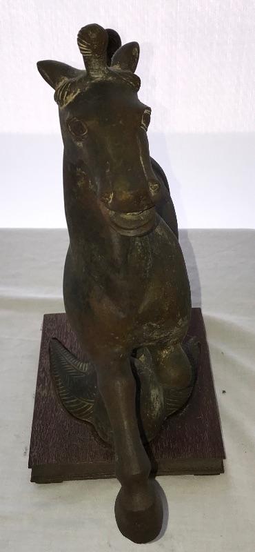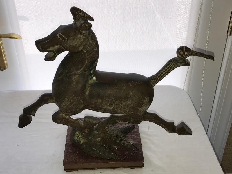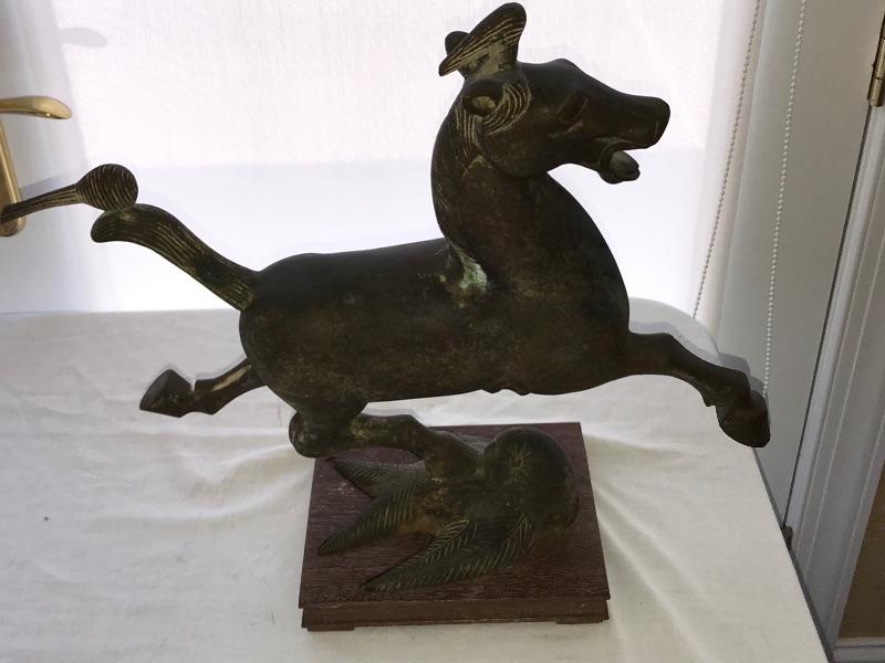 Asian Bronze Statue, Chinese "Flying Horse of Gansu" Has a wood base and measures 16” high 15-1/2” long, base measures 6-3/4” by 8”