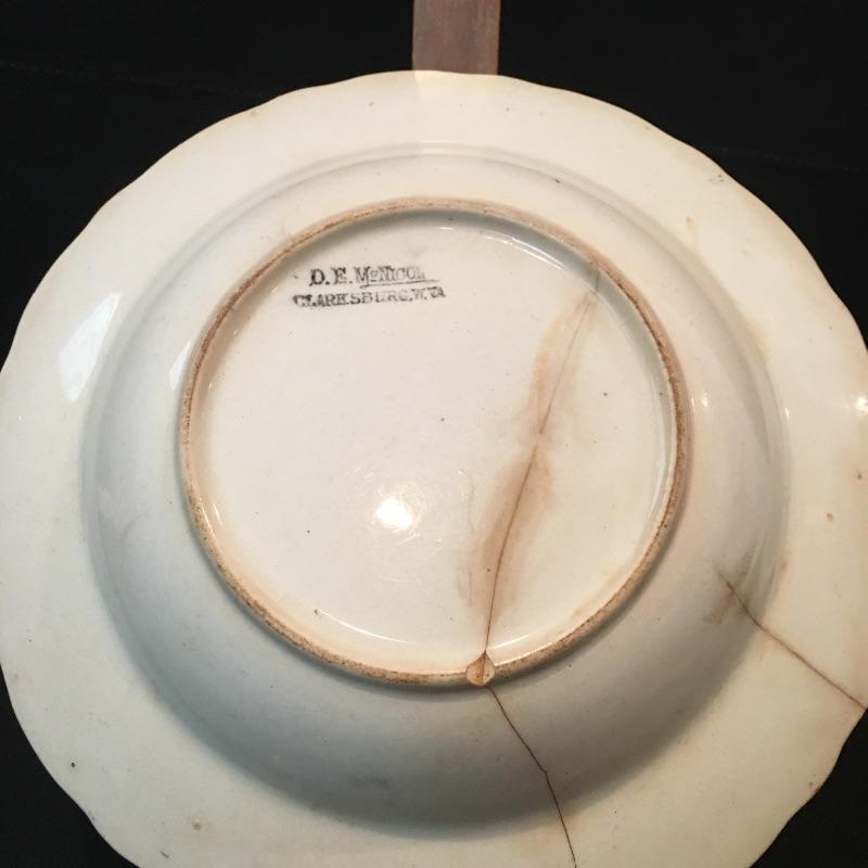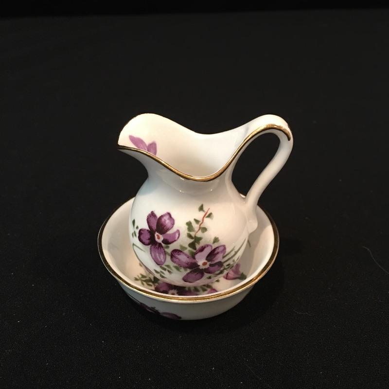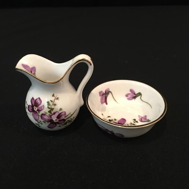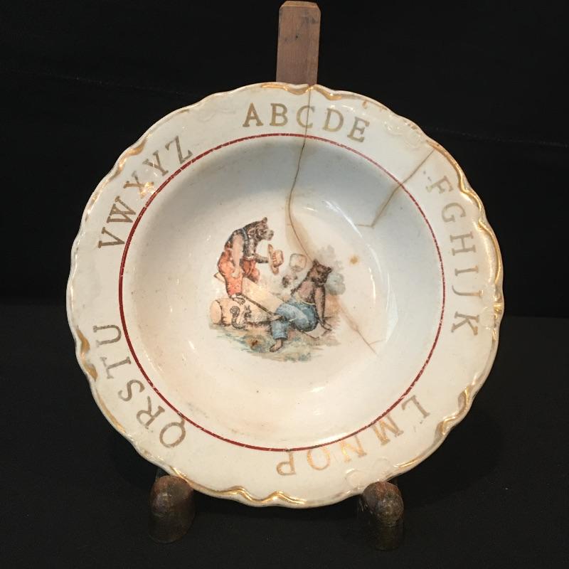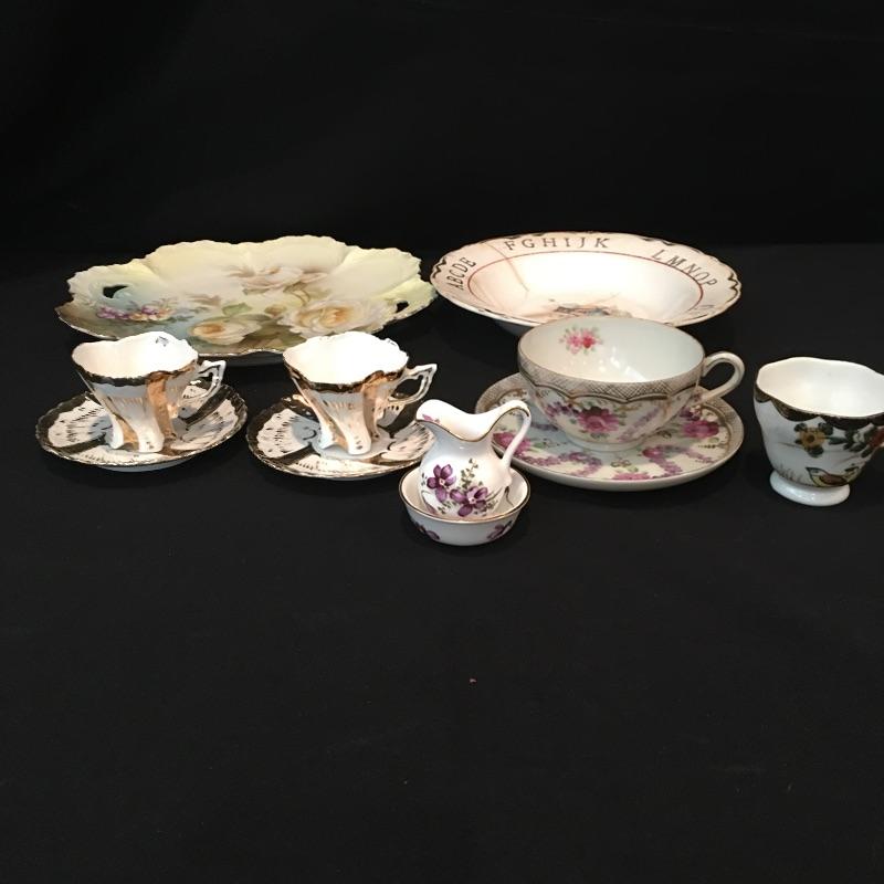 China melange includes pair of matching cups and saucers, cup and saucer, small pitcher and bowl, alphabet bowl that has been repaired, floral plate and more. Plate measures 10”D.