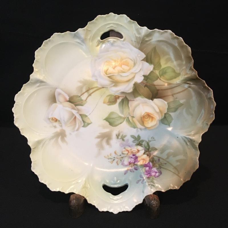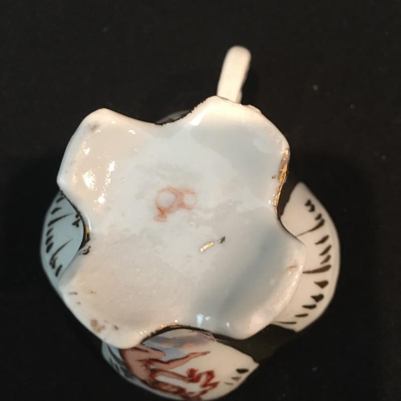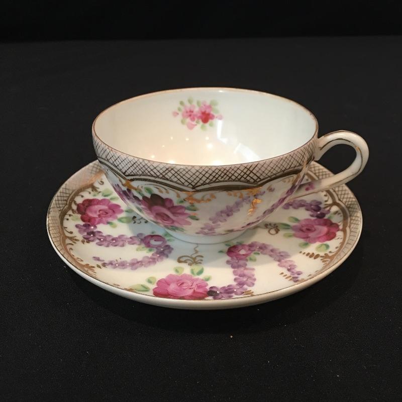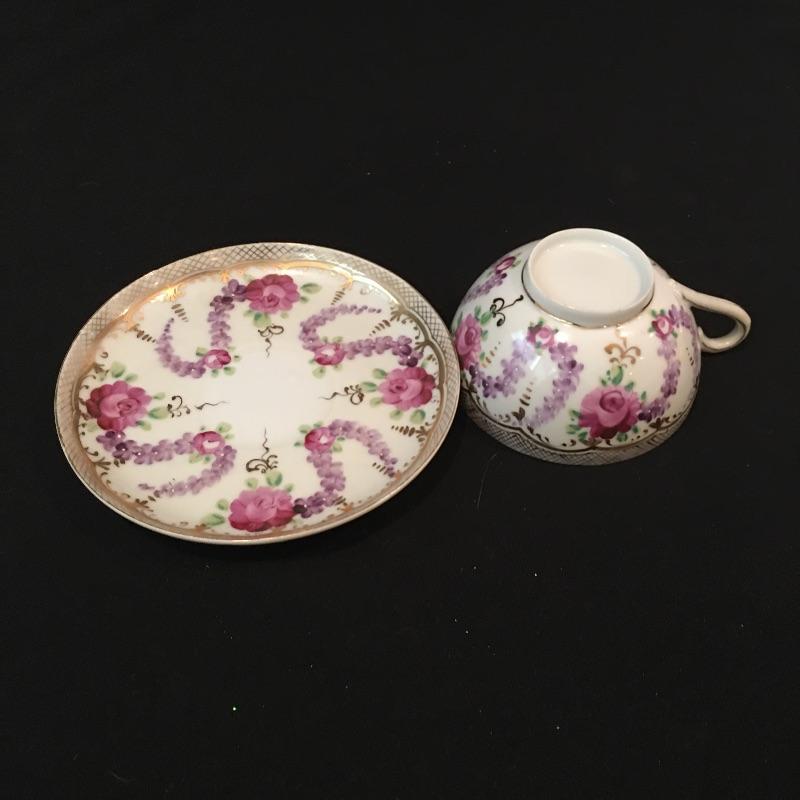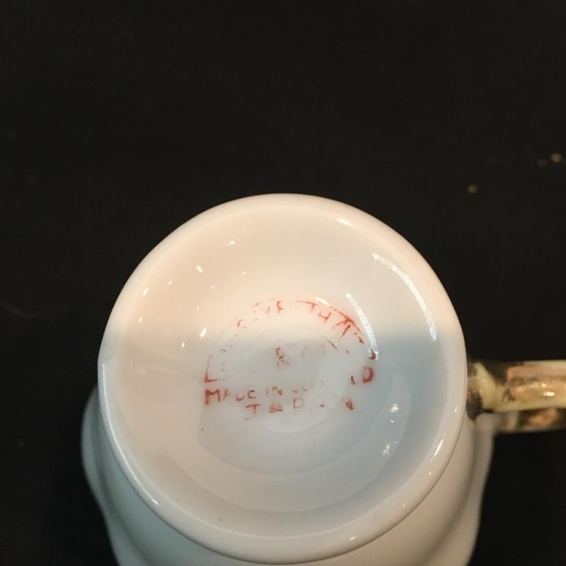 China melange includes pair of matching cups and saucers, cup and saucer, small pitcher and bowl, alphabet bowl that has been repaired, floral plate and more. Plate measures 10”D.