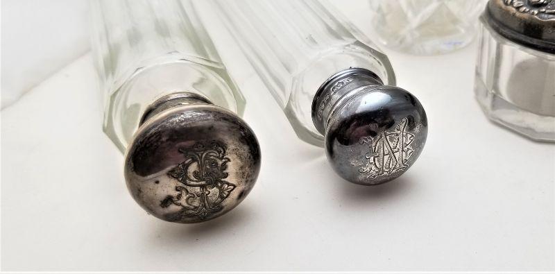 Eclectic collection of glass vanity bottles and jars - early 20th century - all with sterling silver tops. Various monograms. You get all you see here. Good antique condition. For scale, tallest bottle is 7.25" tall.