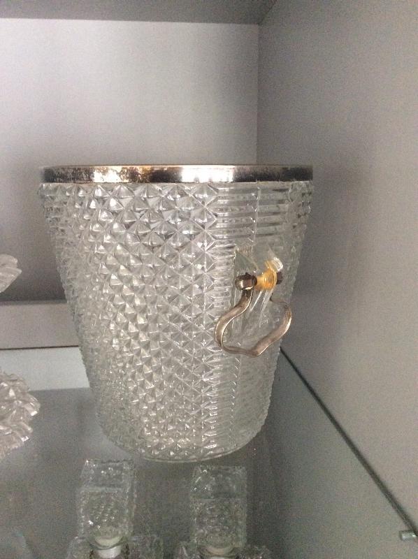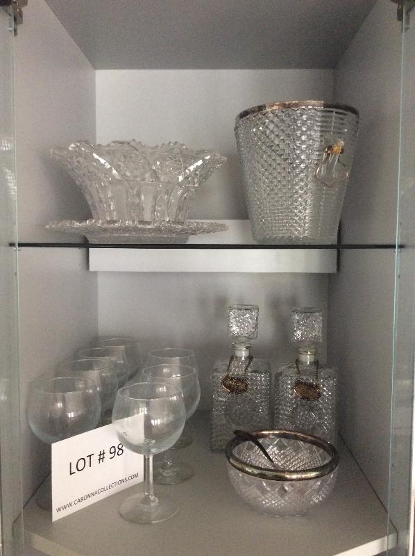 Crystal ice bucket with silver-plate edge, cut glass condiment bowl with silver plate edge, pair of Hobnail clear decanter , with 7 wine glasses
