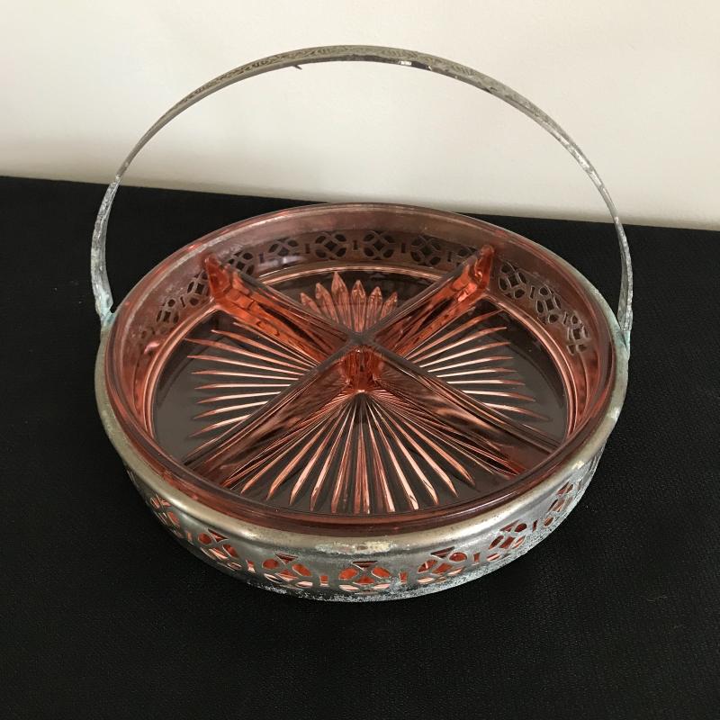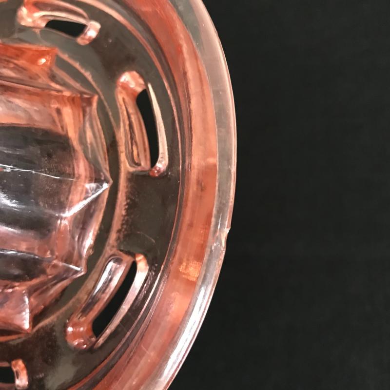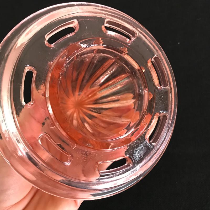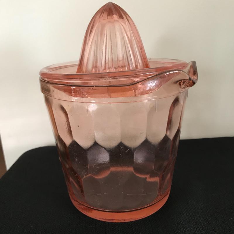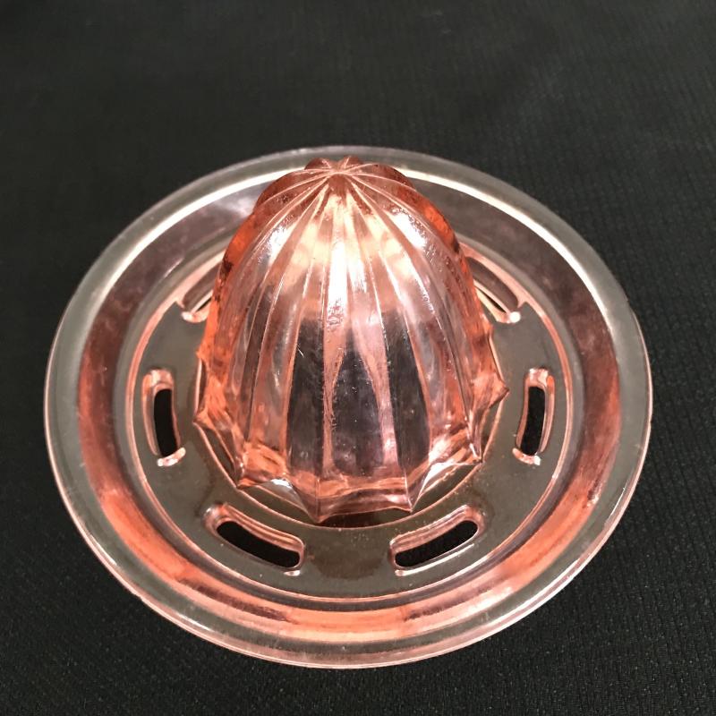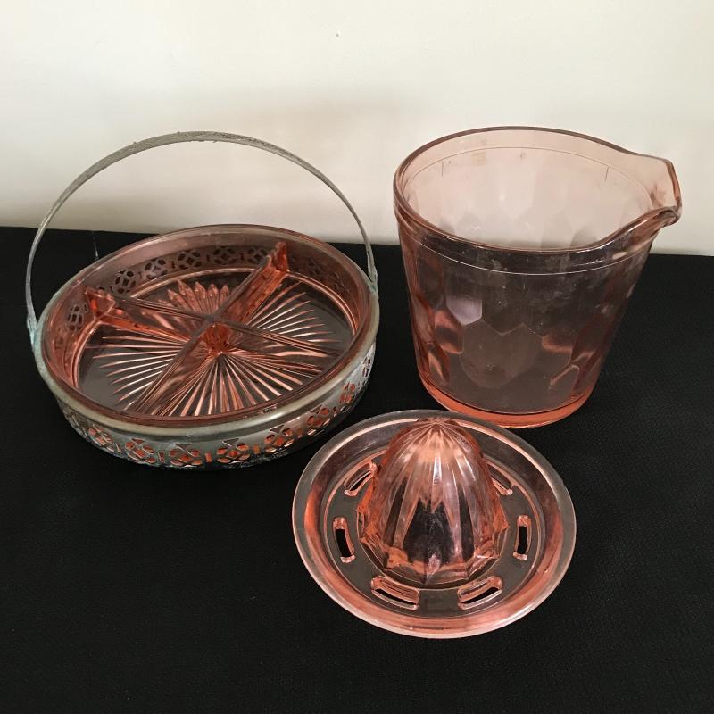 Lot contains three Rose colored glass pieces. Candy/serving dish sits in handled metal carrier and is approx. 8.5” in diameter. Citrus juicer is two pieces and stands approx. 8” tall. Shipping available or local pickup in Asheville, NC.