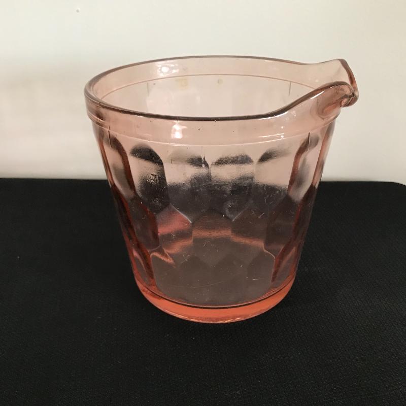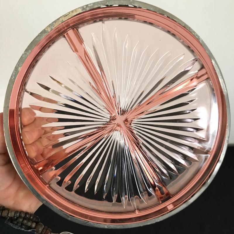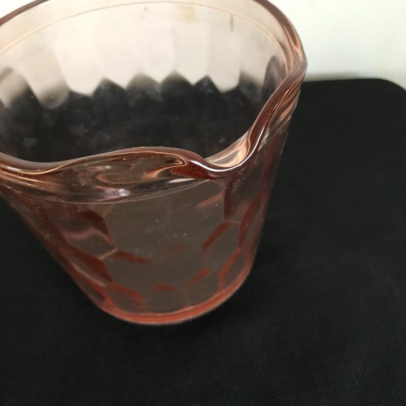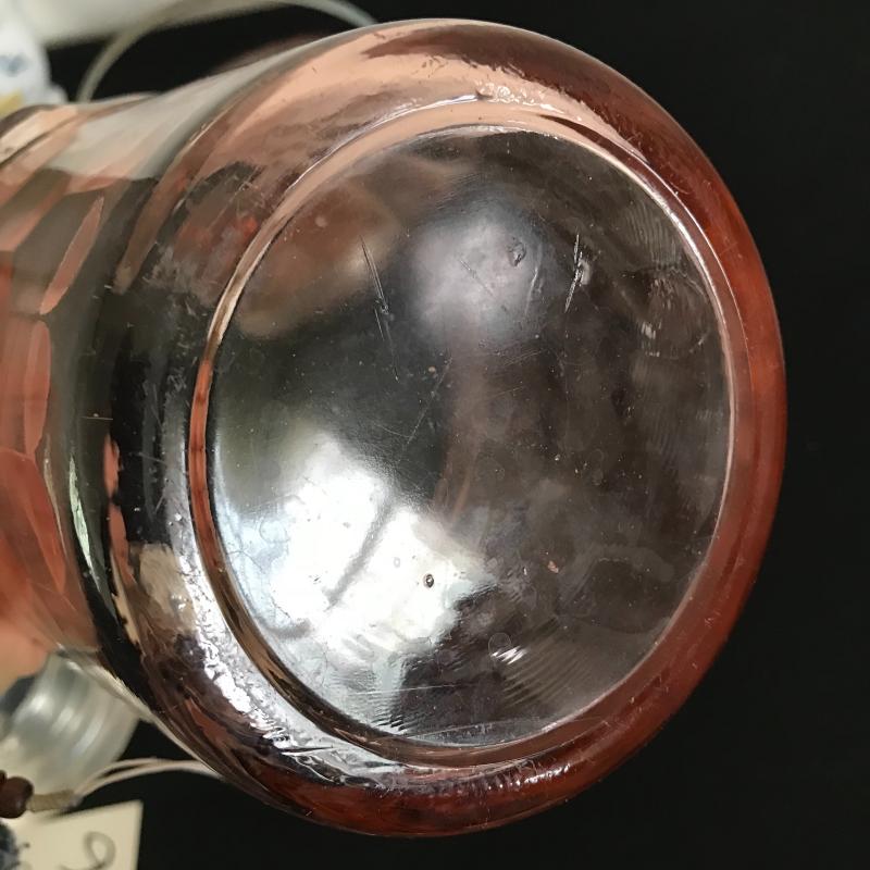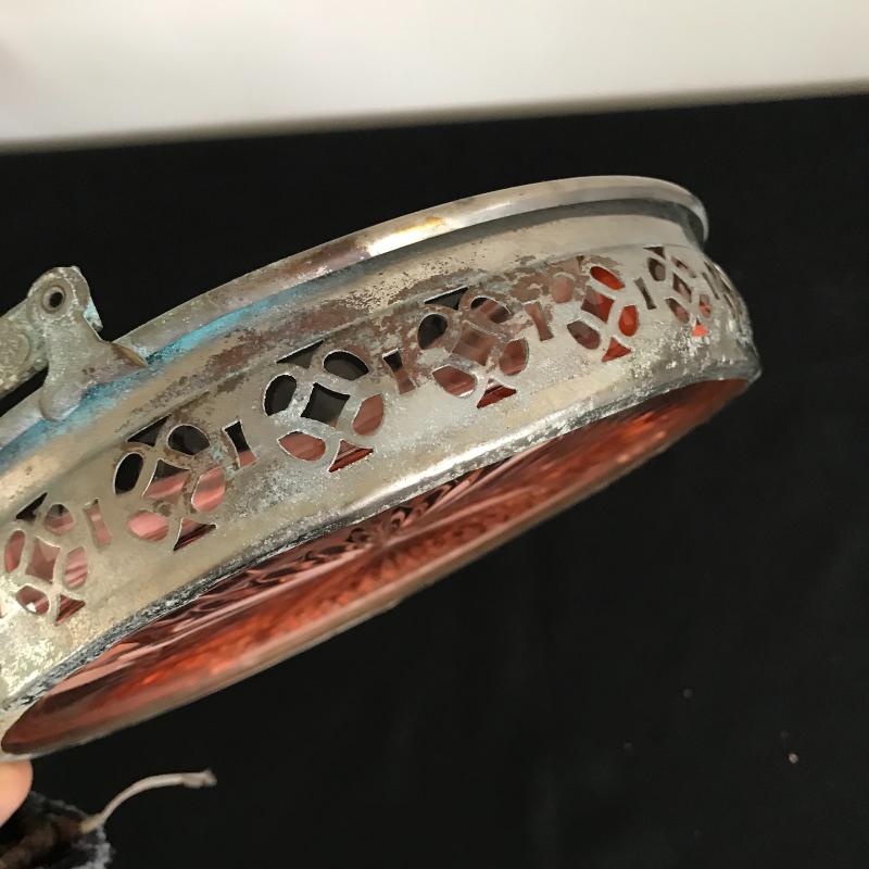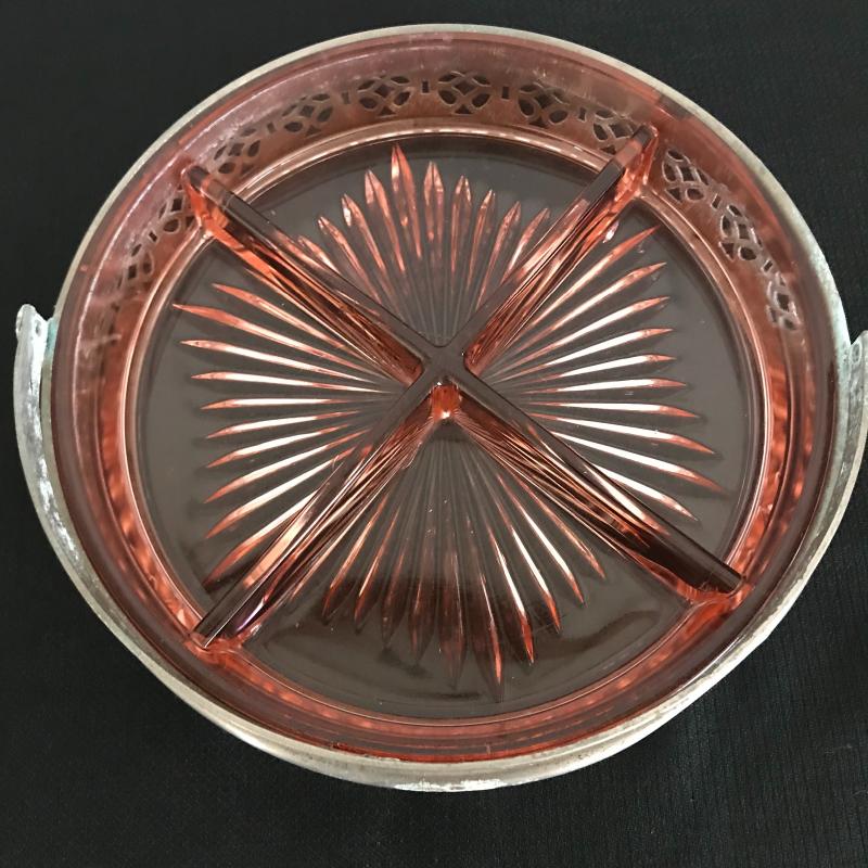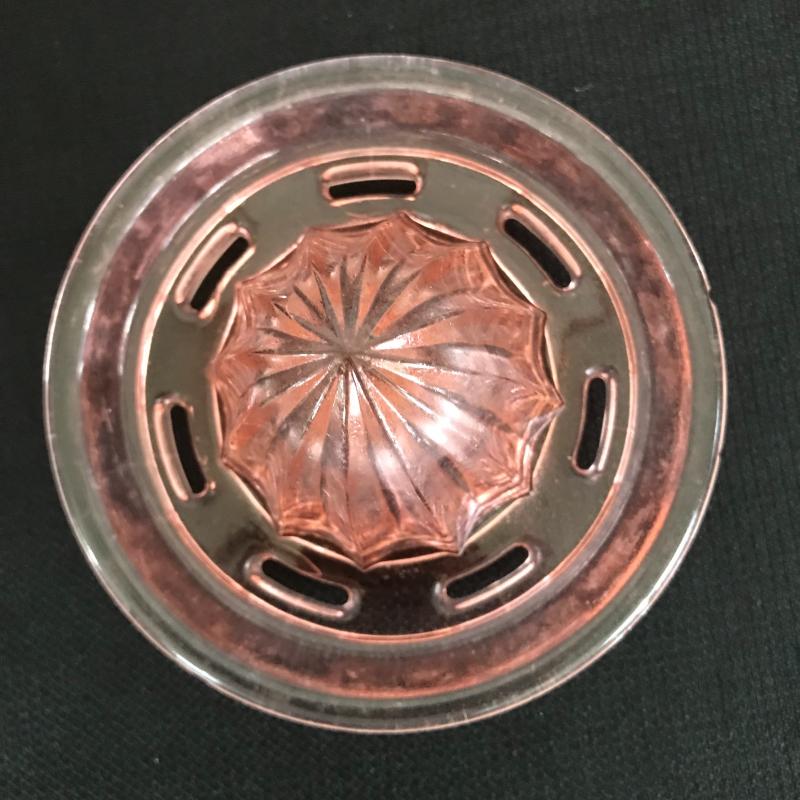 Lot contains three Rose colored glass pieces. Candy/serving dish sits in handled metal carrier and is approx. 8.5” in diameter. Citrus juicer is two pieces and stands approx. 8” tall. Shipping available or local pickup in Asheville, NC.