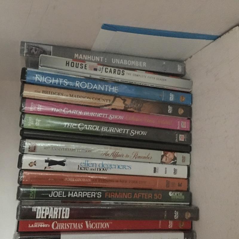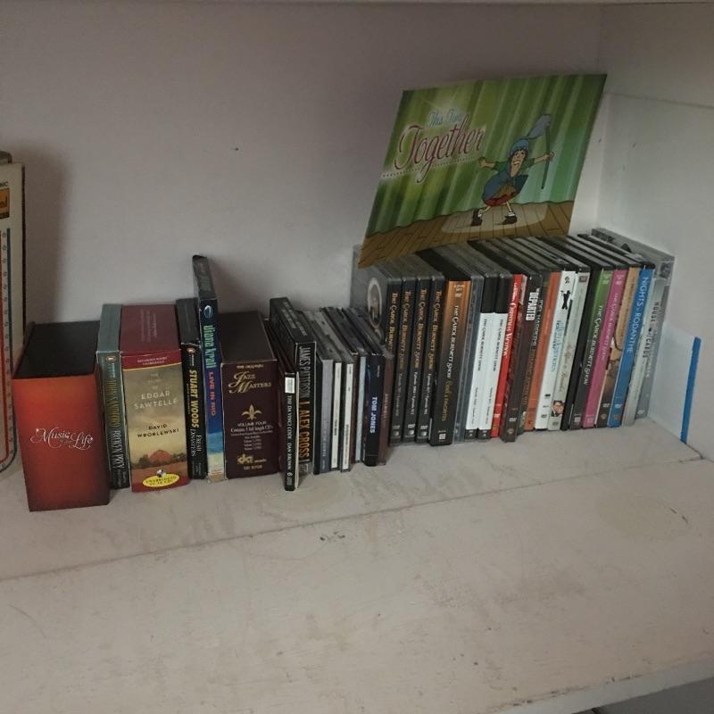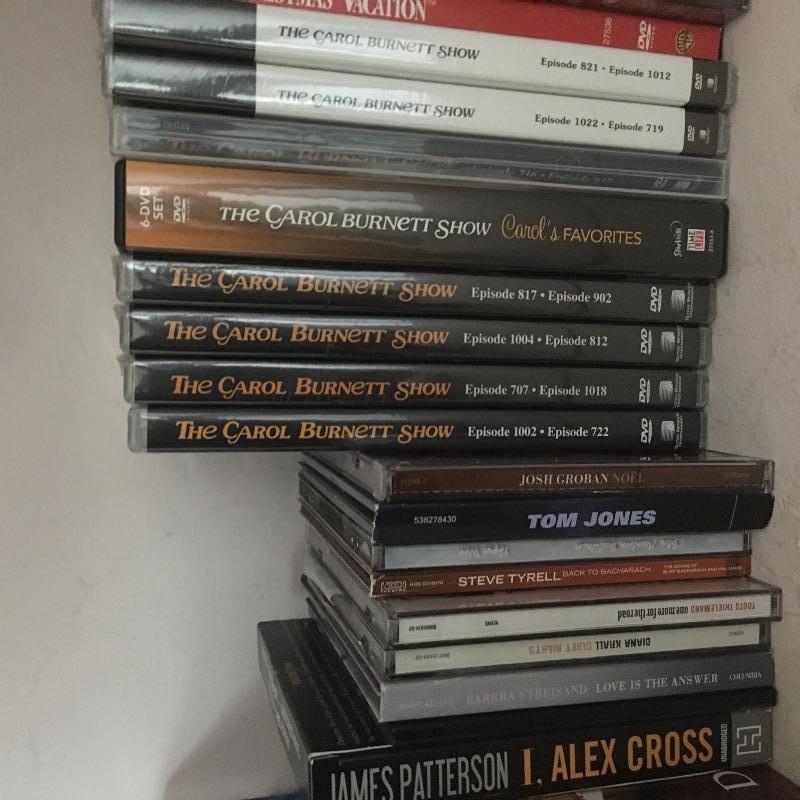 DVDs, CDs, Vinyl and more include Departed, Christmas Vacation, Nights in Rodanthe, The Carol Burnett show, Aerobic dancing albums, books on CD includes James Patterson, Stuart Woods, Dan Brown and more. Keep your self busy for days with this eclectic collection of media.