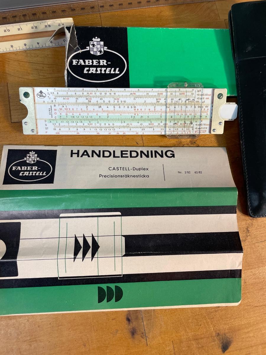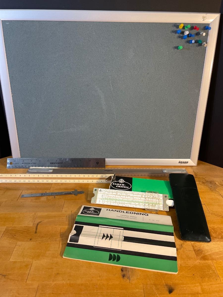 various slide rules and engineering rulers and a metal-framed bulletin board